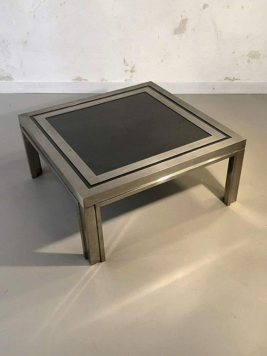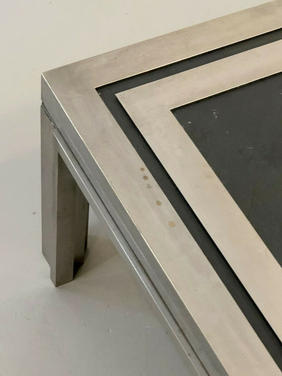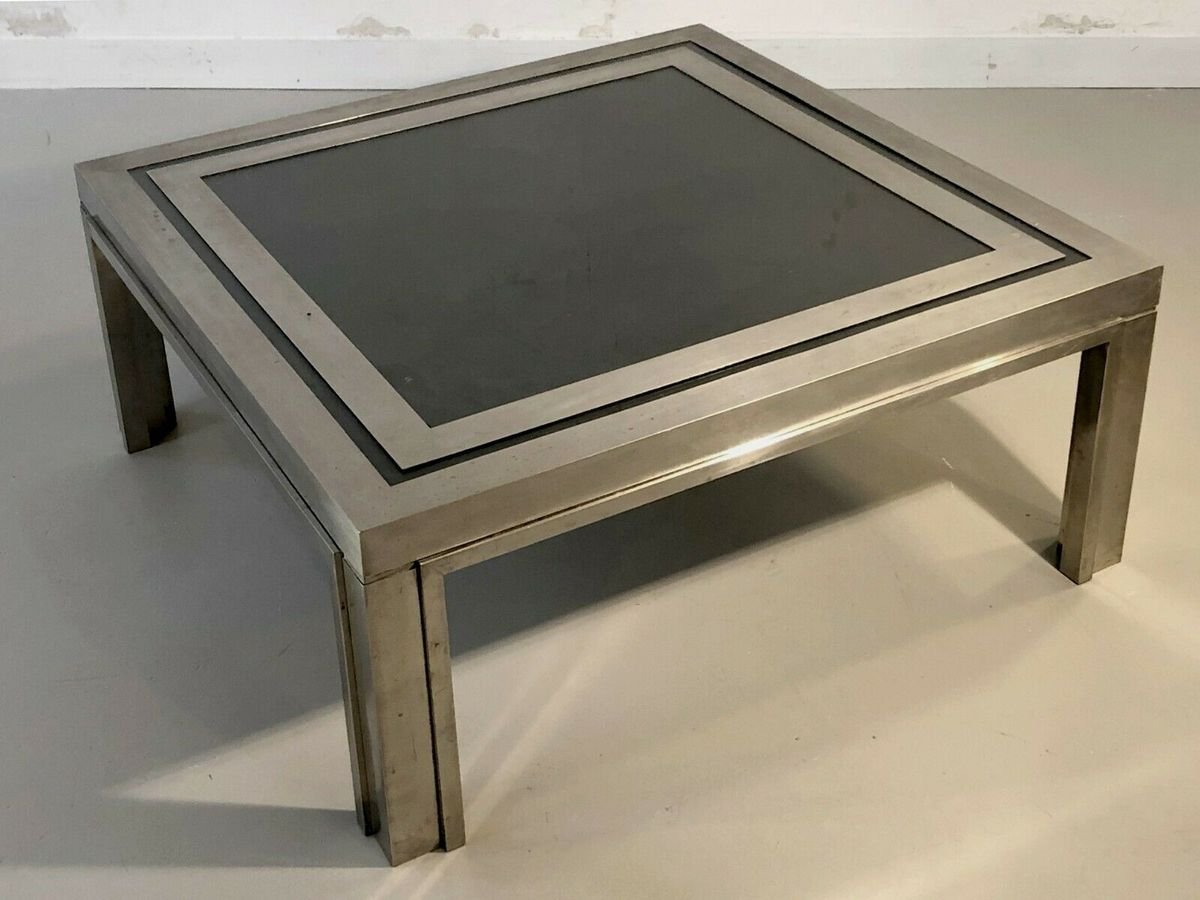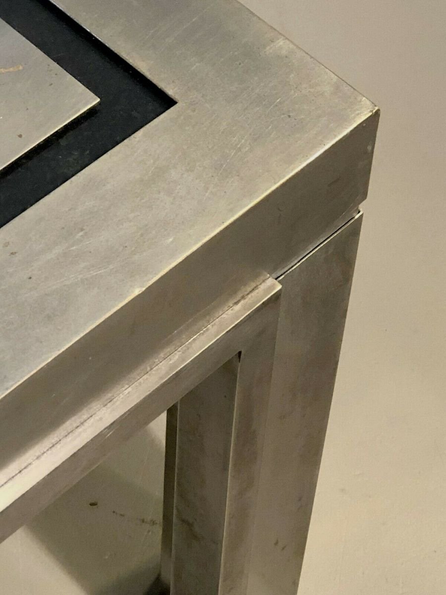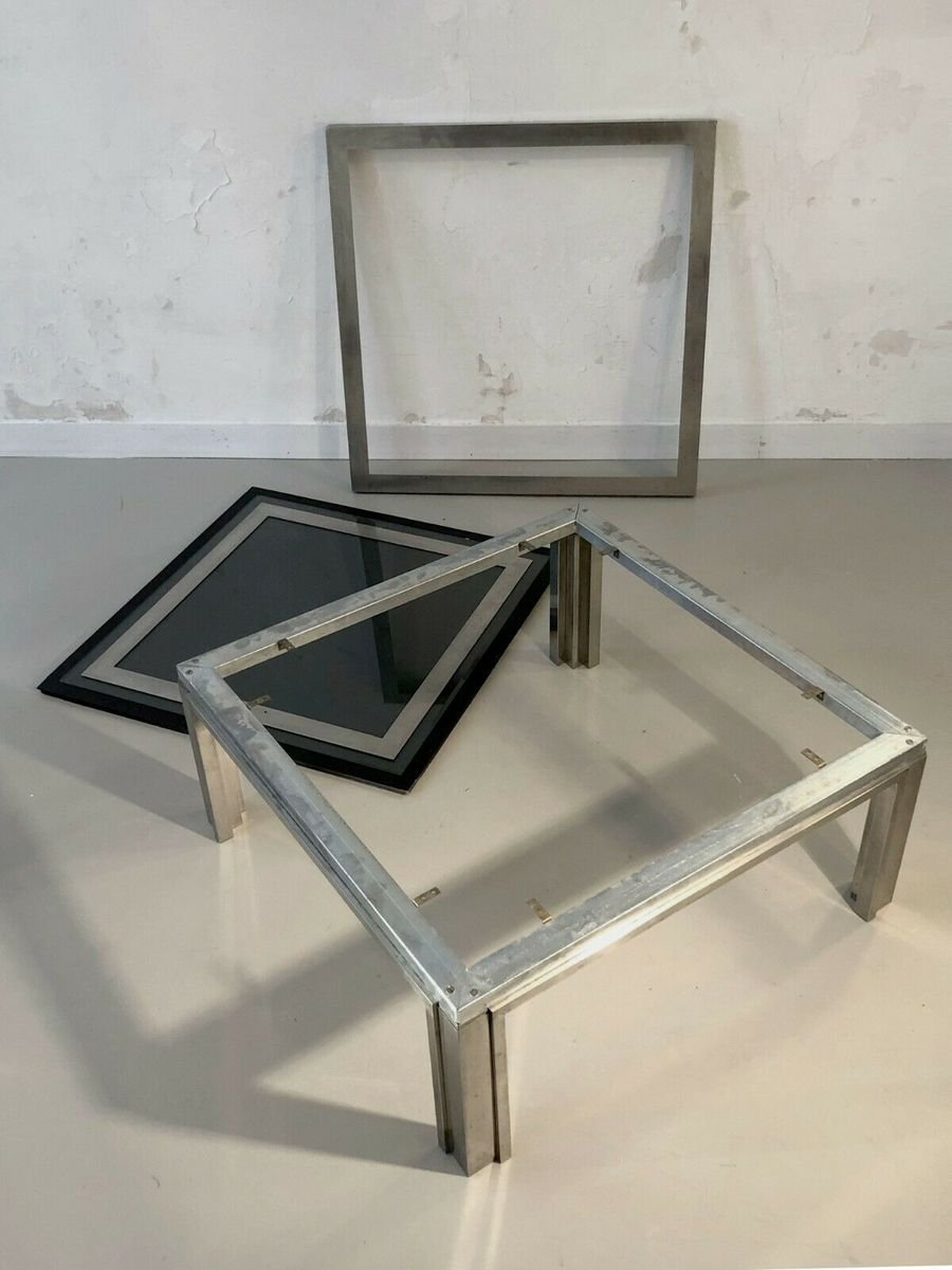 Eine strenge und leistungsstarke quadratischen Couchtisch, Post-Modernist, kinetisch, konstruktivistisch, Shabby-Chic, Struktur konstruktivistischen geometrischen Reliefs komplex plattiert Bronze Holz oder Messing vernickelt, Tee Doppel-Nickel-Rahmen Rahmen Glas auf einem schwarzen strukturierten Material, bilden ein kinetisches Muster schwarz und grau geometrische Abstraktion Nickel, Giacomo Sinopoli, produziert von Liwans Roma Italien für Mercier Frères Paris, Frankreich 1970.