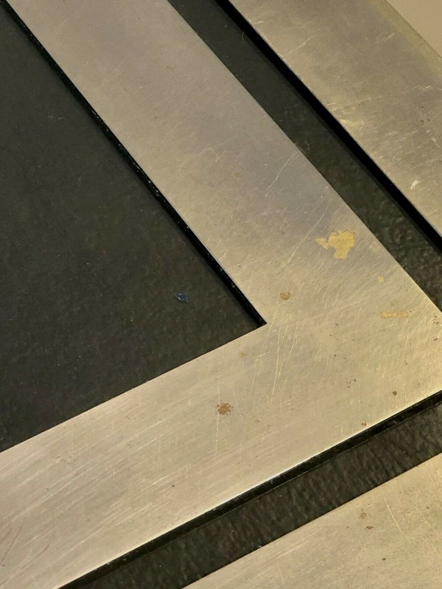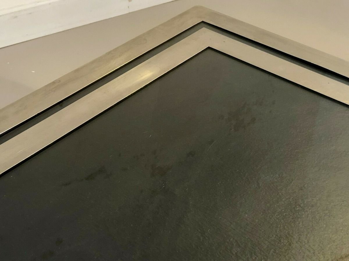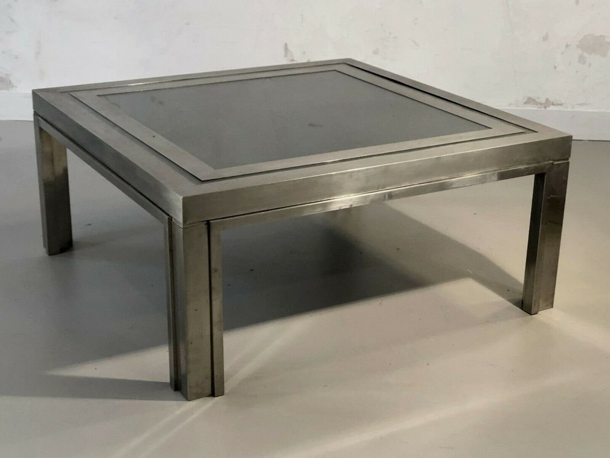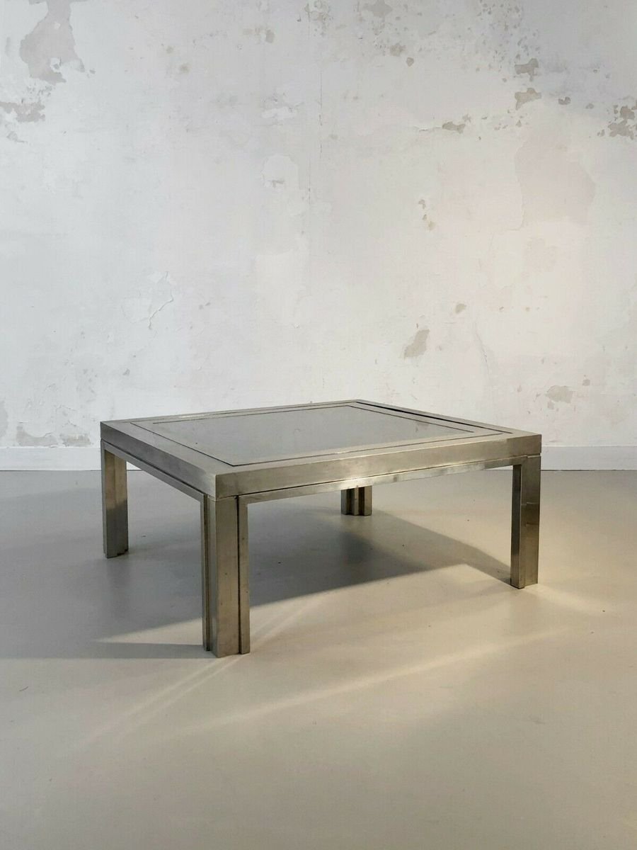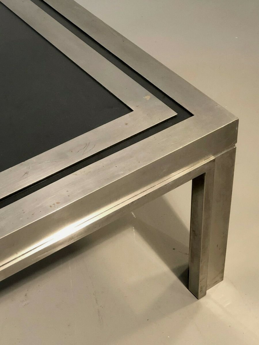Eine strenge und leistungsstarke quadratischen Couchtisch, Post-Modernist, kinetisch, konstruktivistisch, Shabby-Chic, Struktur konstruktivistischen geometrischen Reliefs komplex plattiert Bronze Holz oder Messing vernickelt, Tee Doppel-Nickel-Rahmen Rahmen Glas auf einem schwarzen strukturierten Material, bilden ein kinetisches Muster schwarz und grau geometrische Abstraktion Nickel, Giacomo Sinopoli, produziert von Liwans Roma Italien für Mercier Frères Paris, Frankreich 1970.