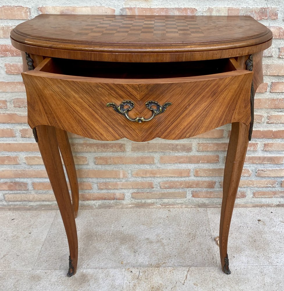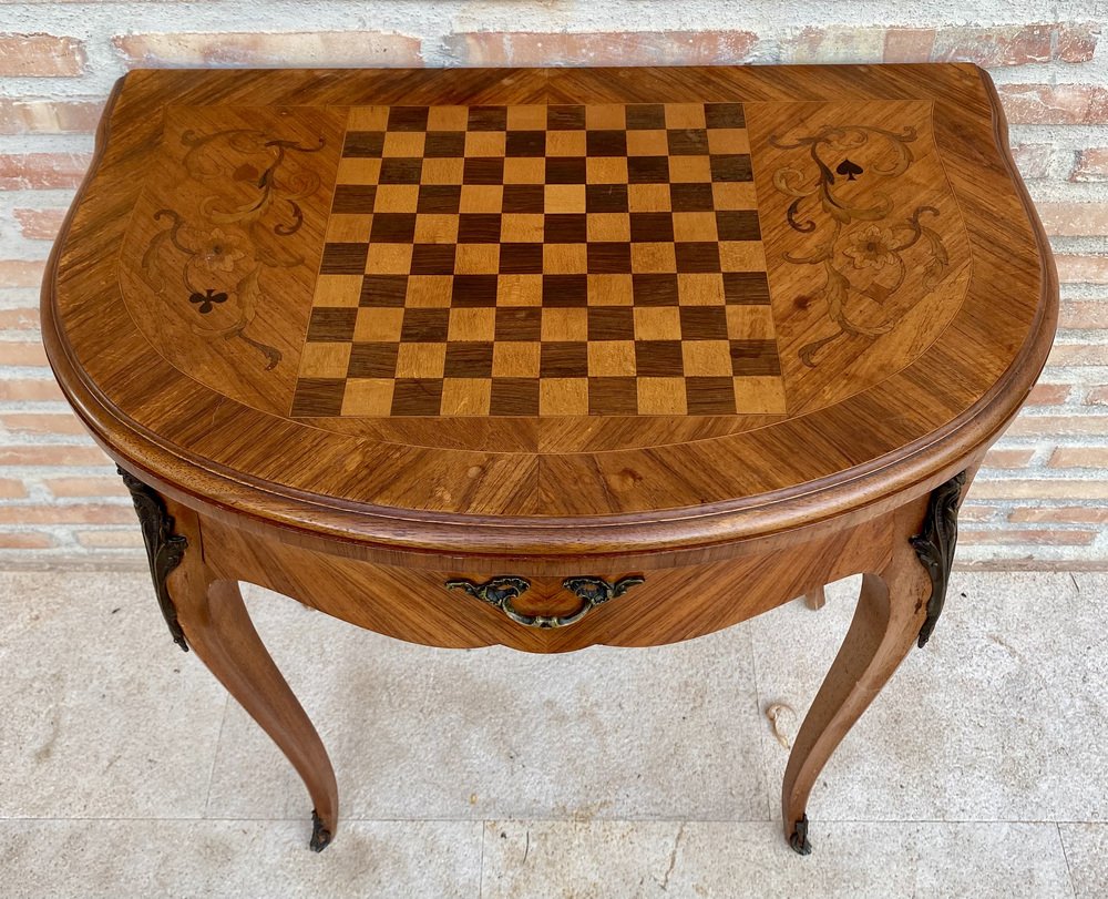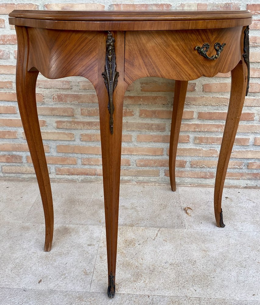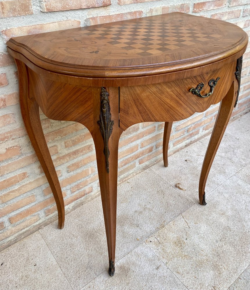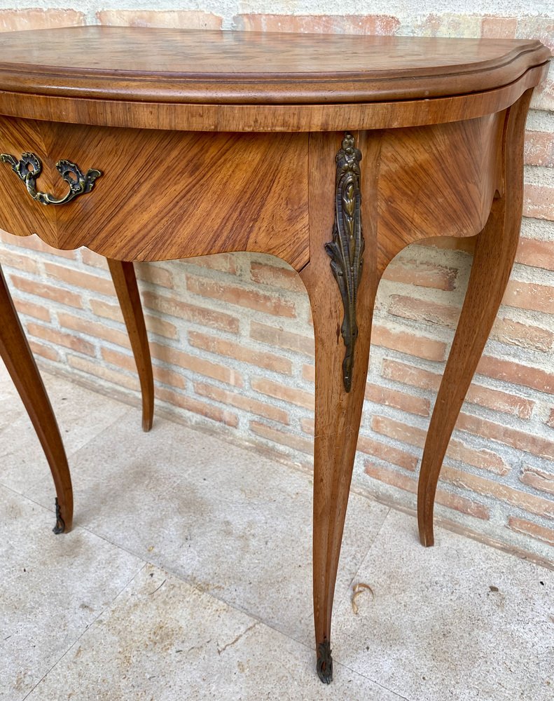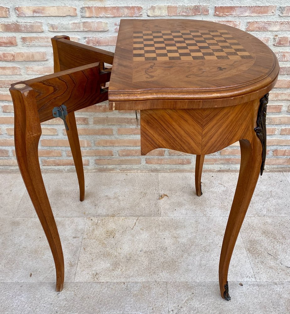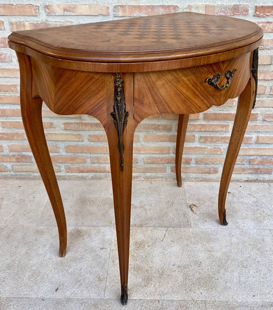 Beautiful chess table on the top and card games when opened, its half-moon shape made of flamed walnut veneer from around 1940-1950 with legs decorated with bronze ornamentation. A very attractive and well made piece, done in Regency style, however it is late Victorian. It has a small front drawer with a brass handle, the legs are beautifully turned at the top and exquisitely sculpted at the bottom. The table opens to reveal a cloth card playing surface. We have cleaned, waxed and polished it from top to bottom, there will be some patina due to honest time and genuine use.