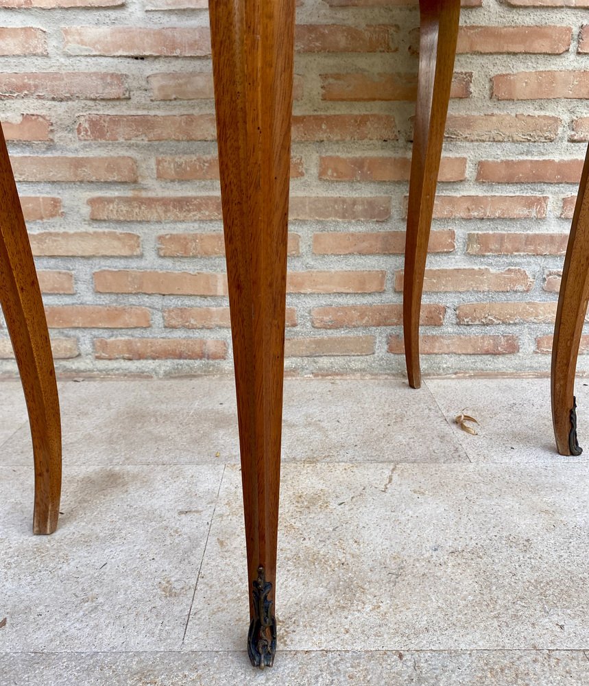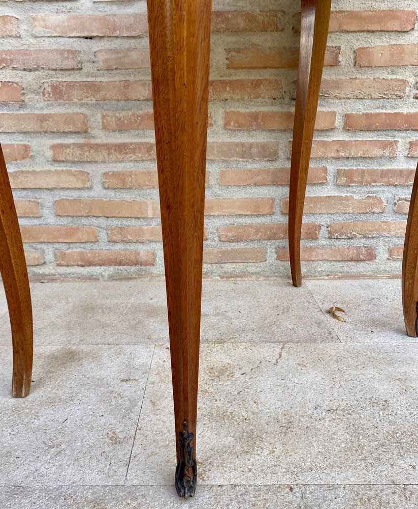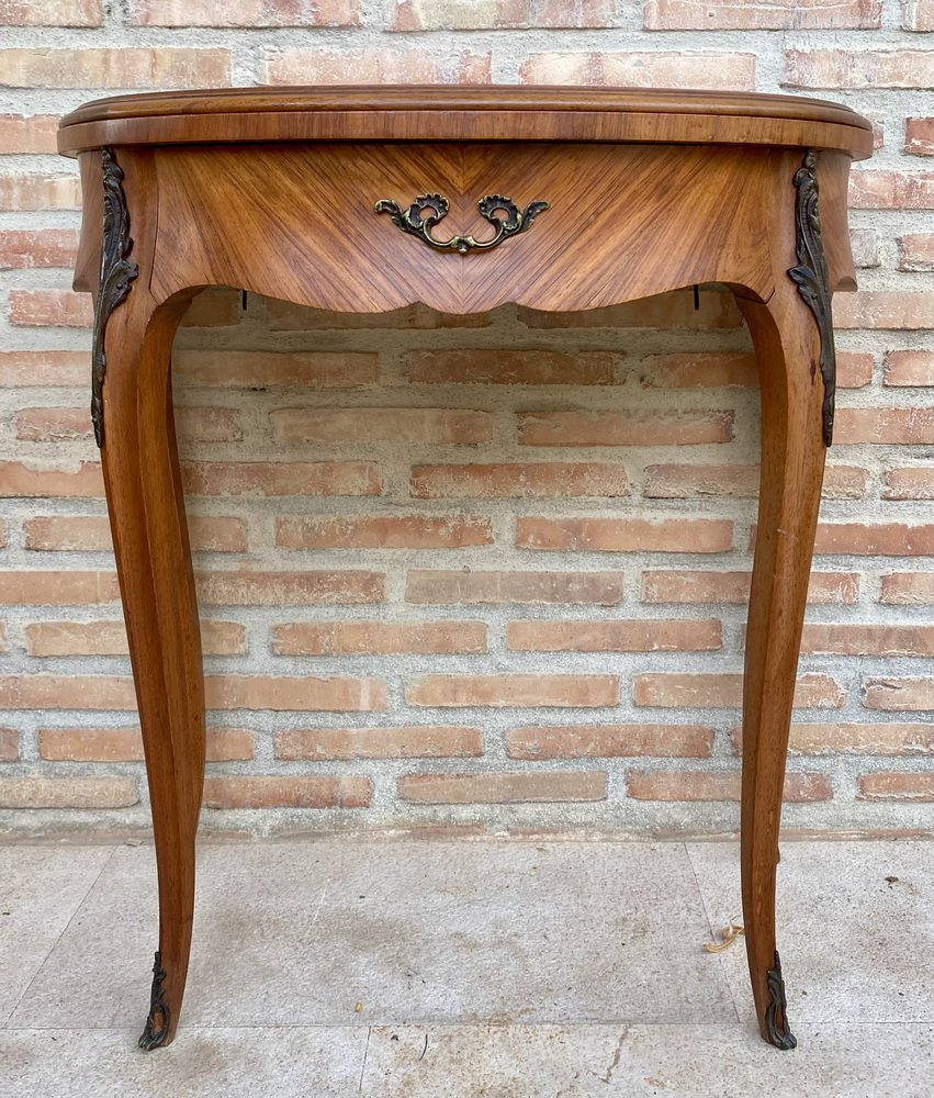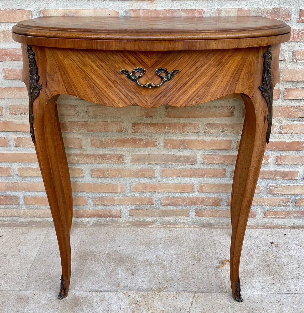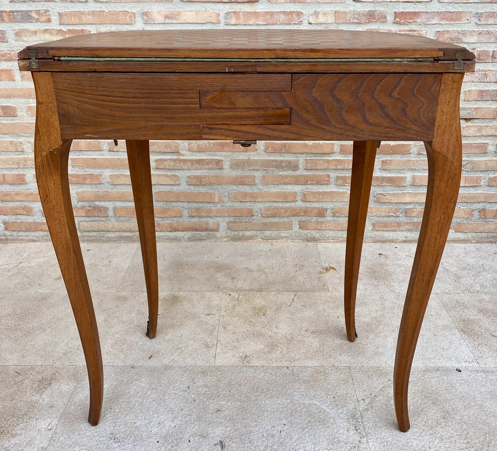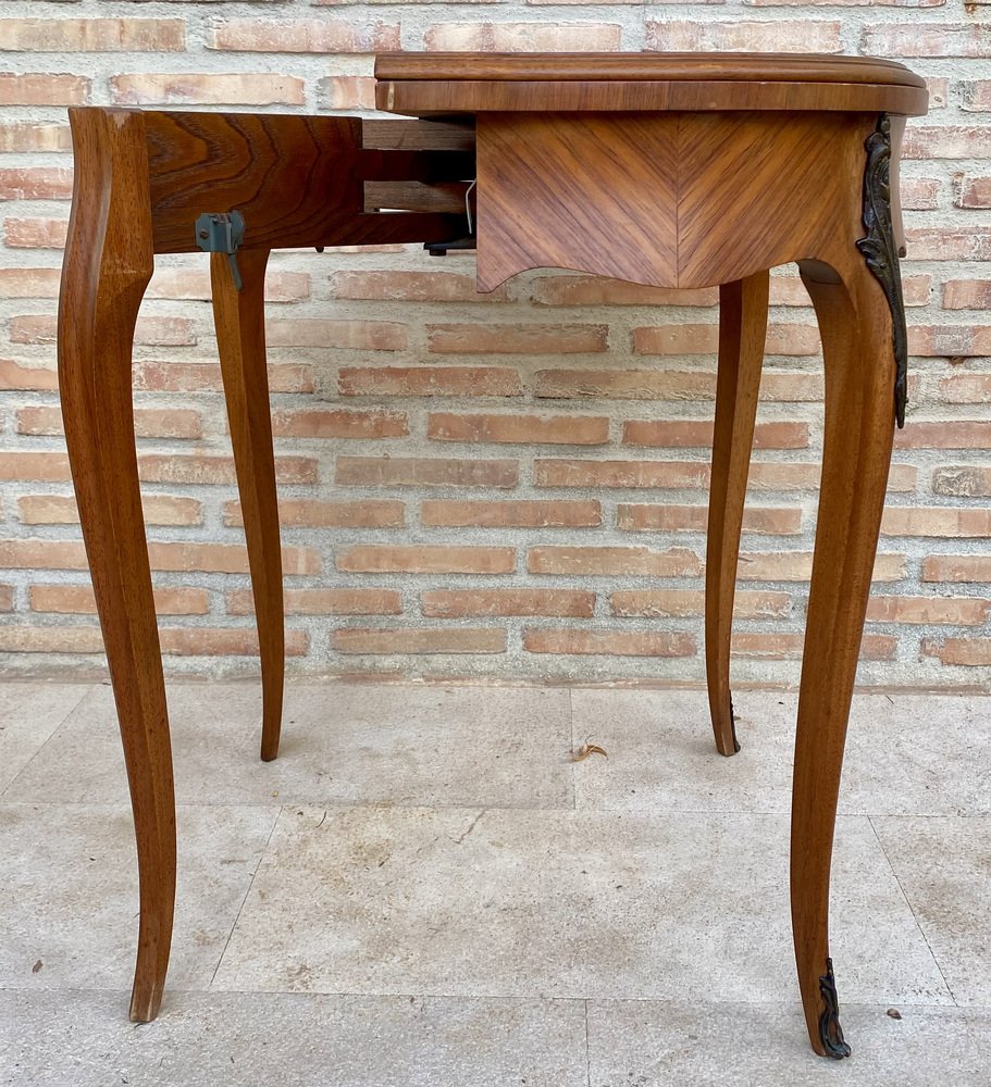 Beautiful chess table on the top and card games when opened, its half-moon shape made of flamed walnut veneer from around 1940-1950 with legs decorated with bronze ornamentation. A very attractive and well made piece, done in Regency style, however it is late Victorian. It has a small front drawer with a brass handle, the legs are beautifully turned at the top and exquisitely sculpted at the bottom. The table opens to reveal a cloth card playing surface. We have cleaned, waxed and polished it from top to bottom, there will be some patina due to honest time and genuine use.