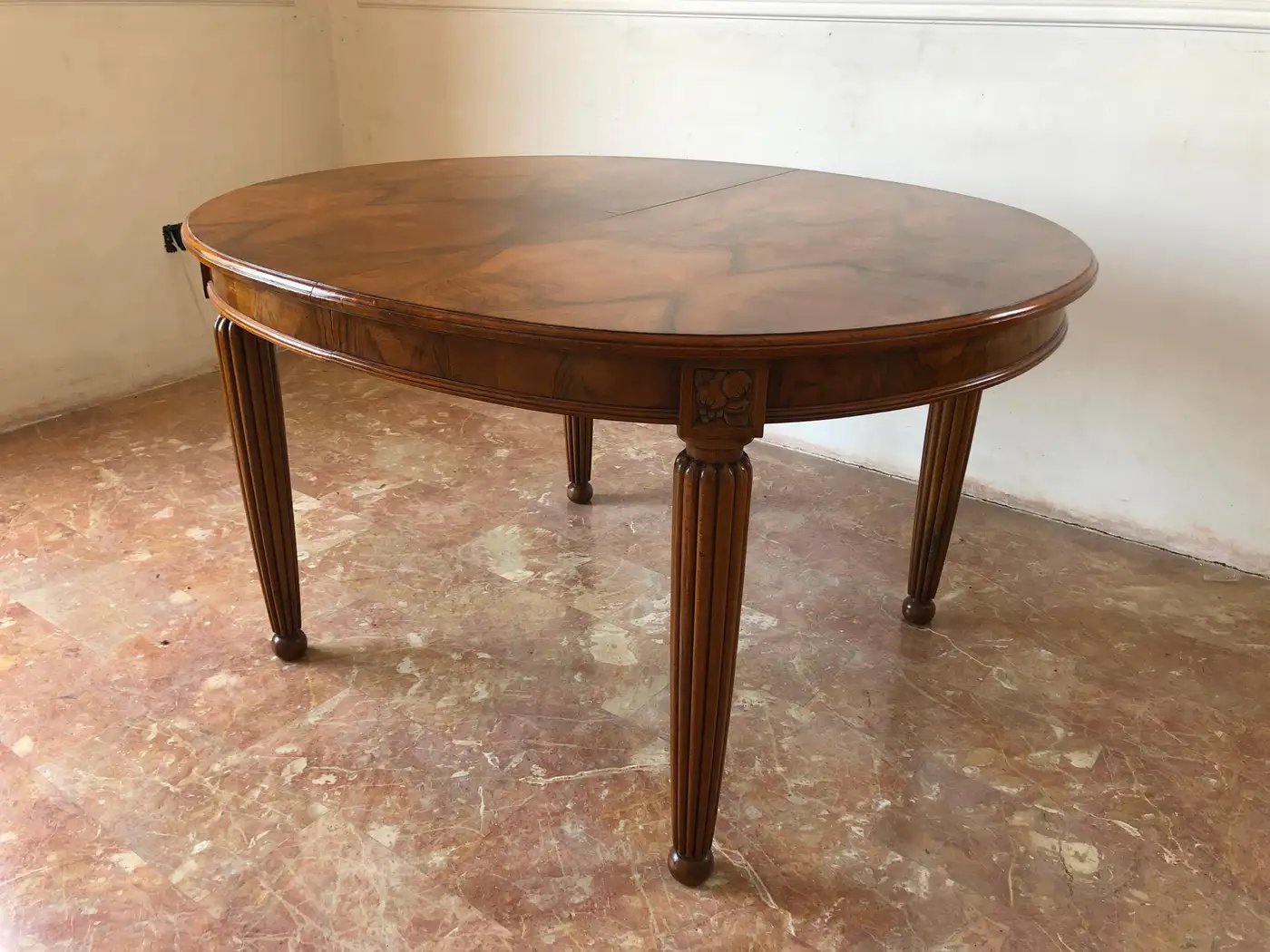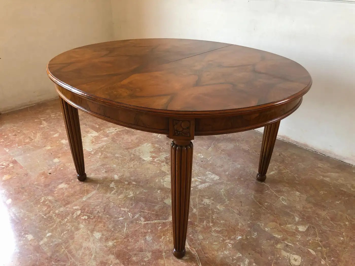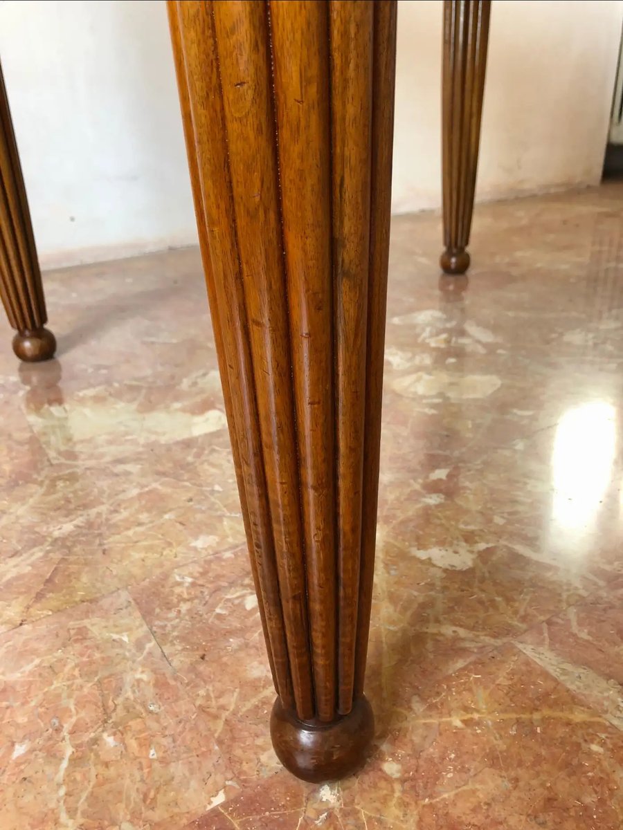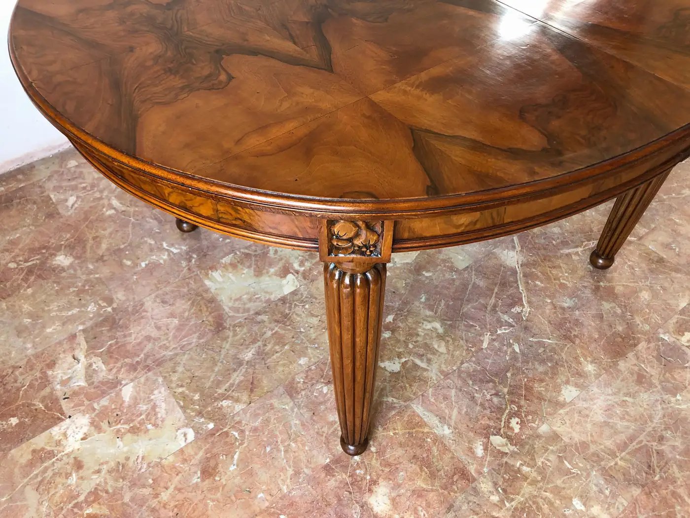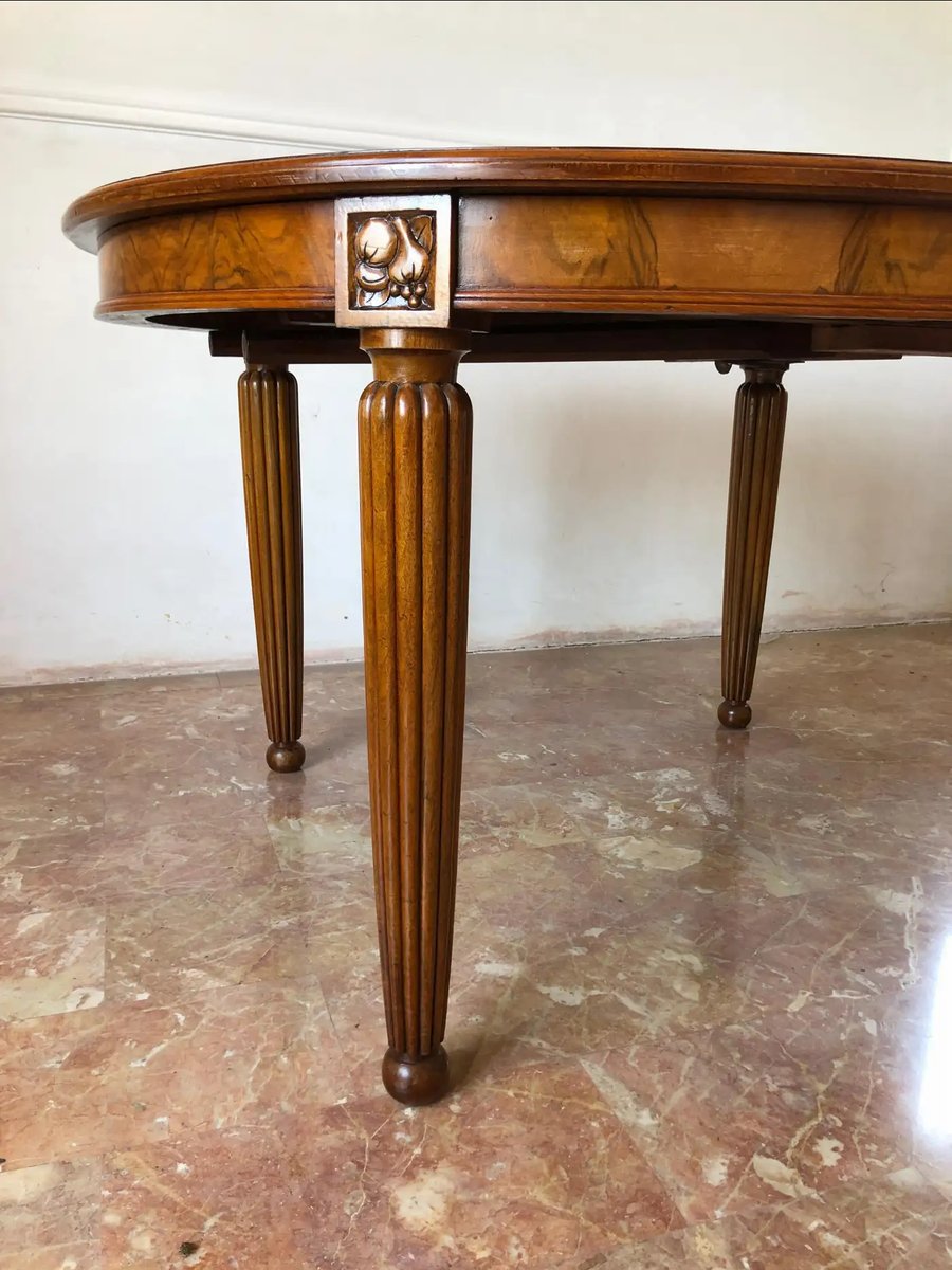 Eleganter französischer Jugendstil-Esstisch aus feinem, stark gemasertem Nussbaumholz aus der Zeit um 1920.