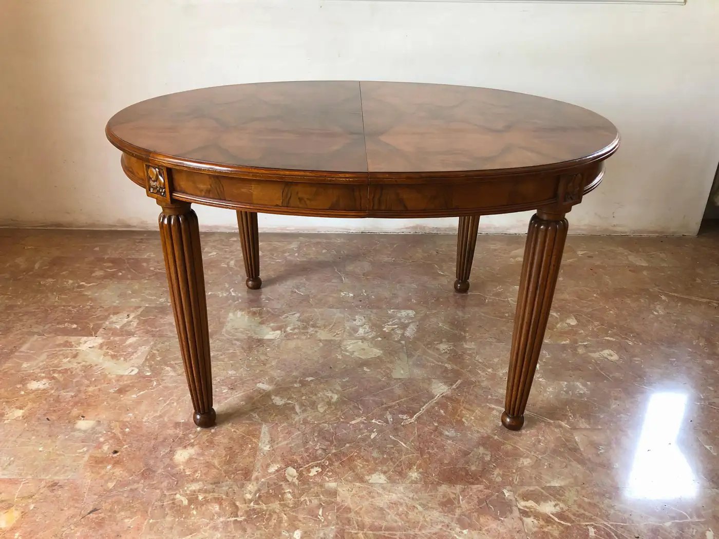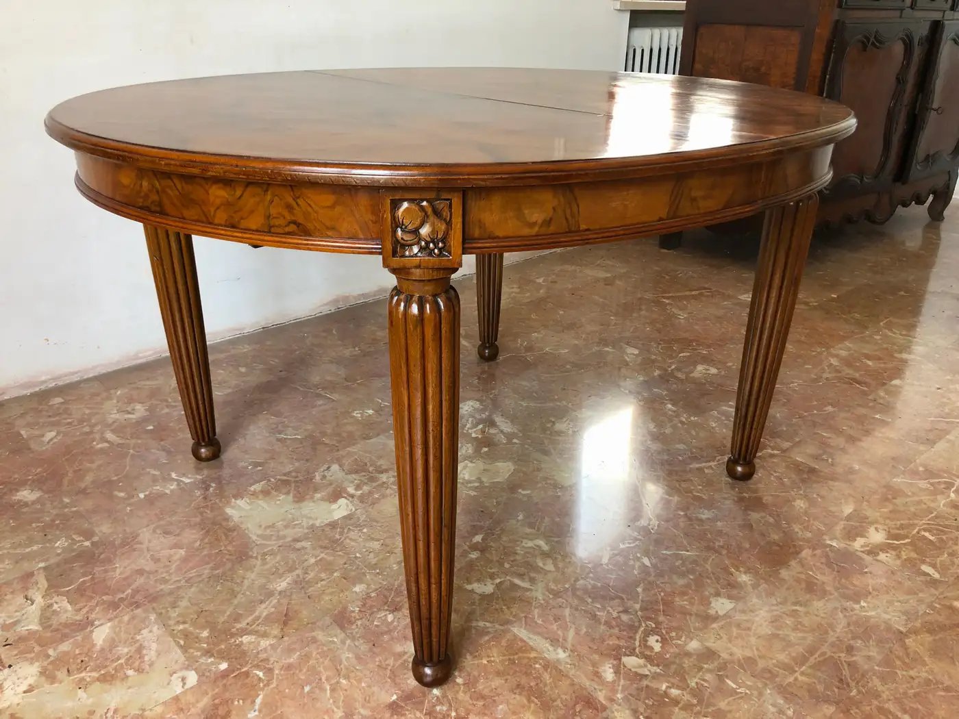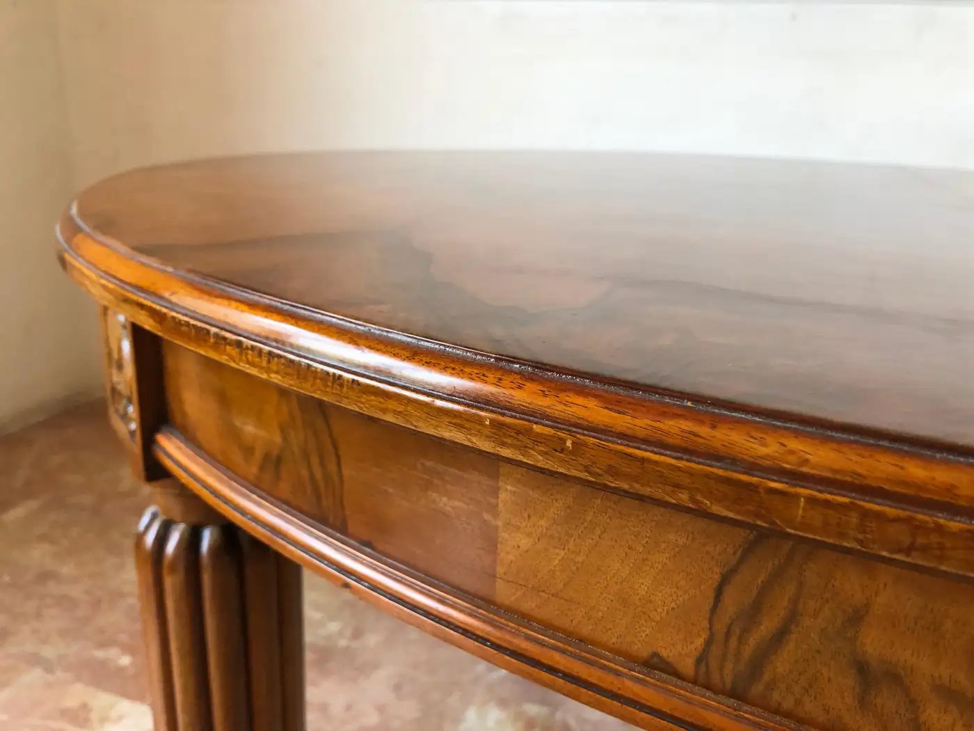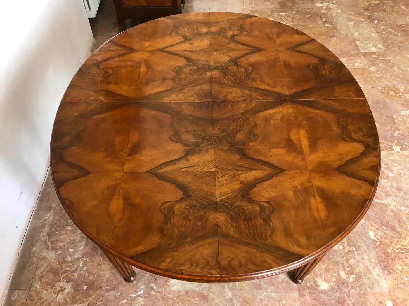 Eleganter französischer Jugendstil-Esstisch aus feinem, stark gemasertem Nussbaumholz aus der Zeit um 1920.