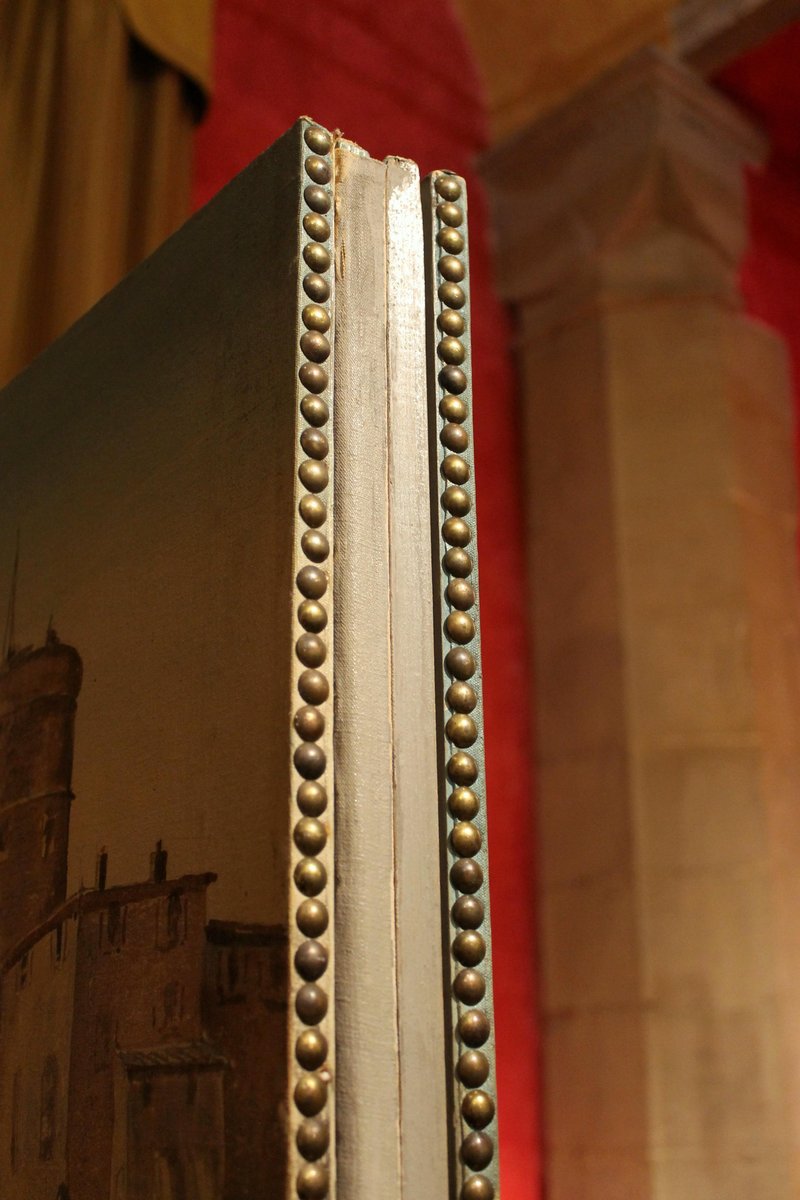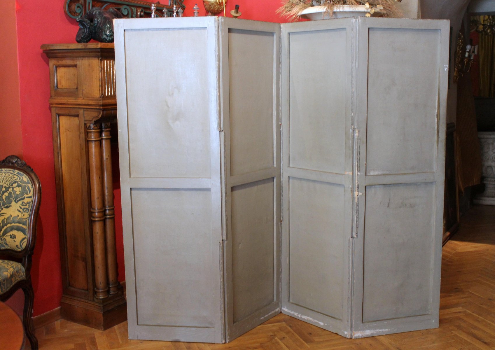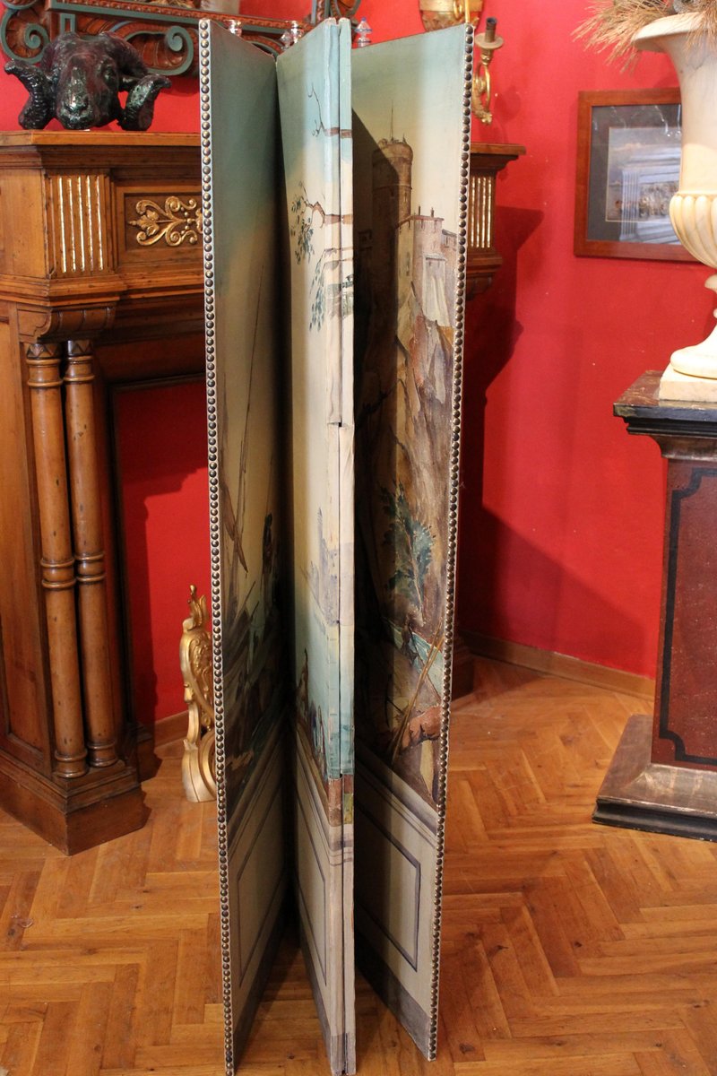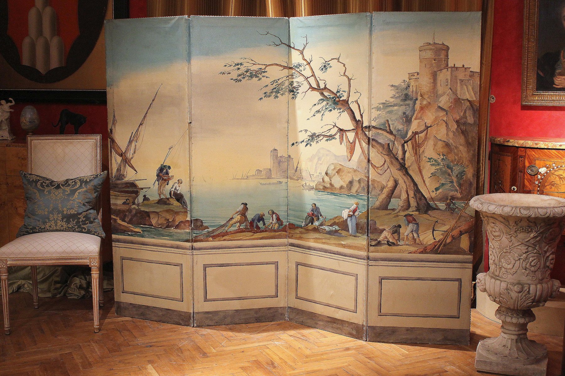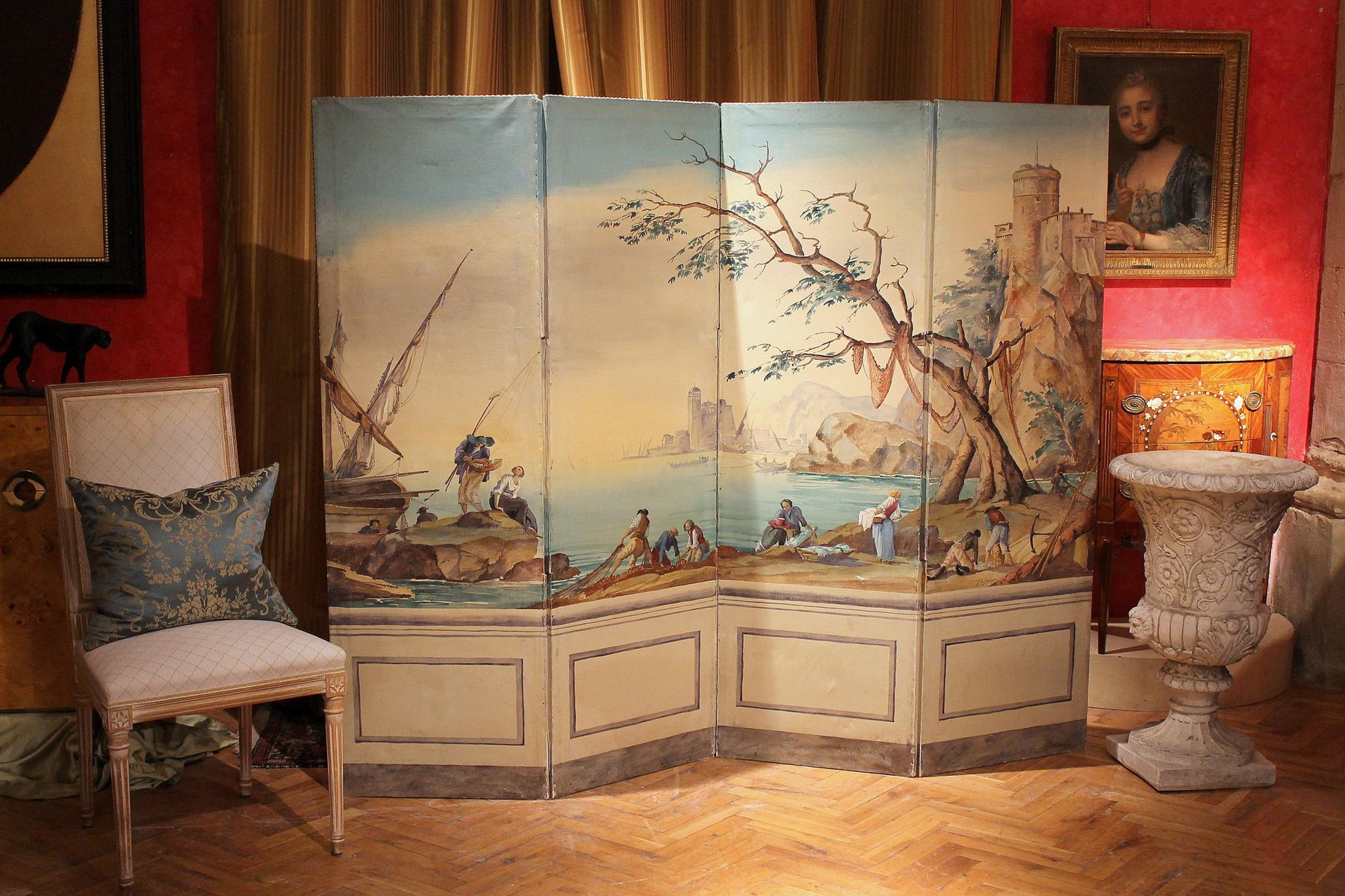 Dieser französische Paravent aus dem frühen 20. Jahrhundert besteht aus vier Leinwänden, die vollständig mit strukturierter Temperamalerei bemalt sind und eine Meereslandschaft im Stil Ludwigs XV. zeigen, die an romantische Atmosphären und bestimmte Stimmungen aus der Vergangenheit erinnert. Die heitere Seelandschaft ist mit Figuren und Booten auf einer architektonischen Szene mit einem Schloss und einem Hafen im Hintergrund belebt. Dieses dekorative Kunstwerk ist mit J. de Greling signiert, stammt aus der Zeit um 1900 und ist von italienischen Ansichten aus dem 18. Jahrhunderts. Dieser Paravent kann als ungewöhnlicher Raumteiler verwendet oder auch an die Wand gehängt werden, um ein riesiges Gemälde zu erhalten, wenn er vollständig aufgeklappt ist. Der Paravent ist ein äußerst dekoratives Möbelstück oder ein schönes Kunstwerk, das eine große Vielfalt an Farben mit einer entspannten und natürlichen Farbpalette sowie einen sehr lebendigen Touch bietet. Die Textur des Gemäldes auf der Leinwand und die Liebe zum Detail sind außergewöhnlich, ebenso wie die Veredelung an der Unterseite mit einer unechten Verkleidung, die mit einem Trompe-l'oeil-Effekt erzielt wurde. Die Leinwände sind auf Holzrahmen montiert, die mit Scharnieren versehen sind, um eine vollständige Entfaltung zu ermöglichen, und mit Polsternägeln befestigt. Sehr guter Gesamtzustand, geringe alters- und gebrauchsbedingte Gebrauchsspuren, stabile Malerei, originale Patina. Maße: H. 160 cm, B. 50 cm je Tafel.