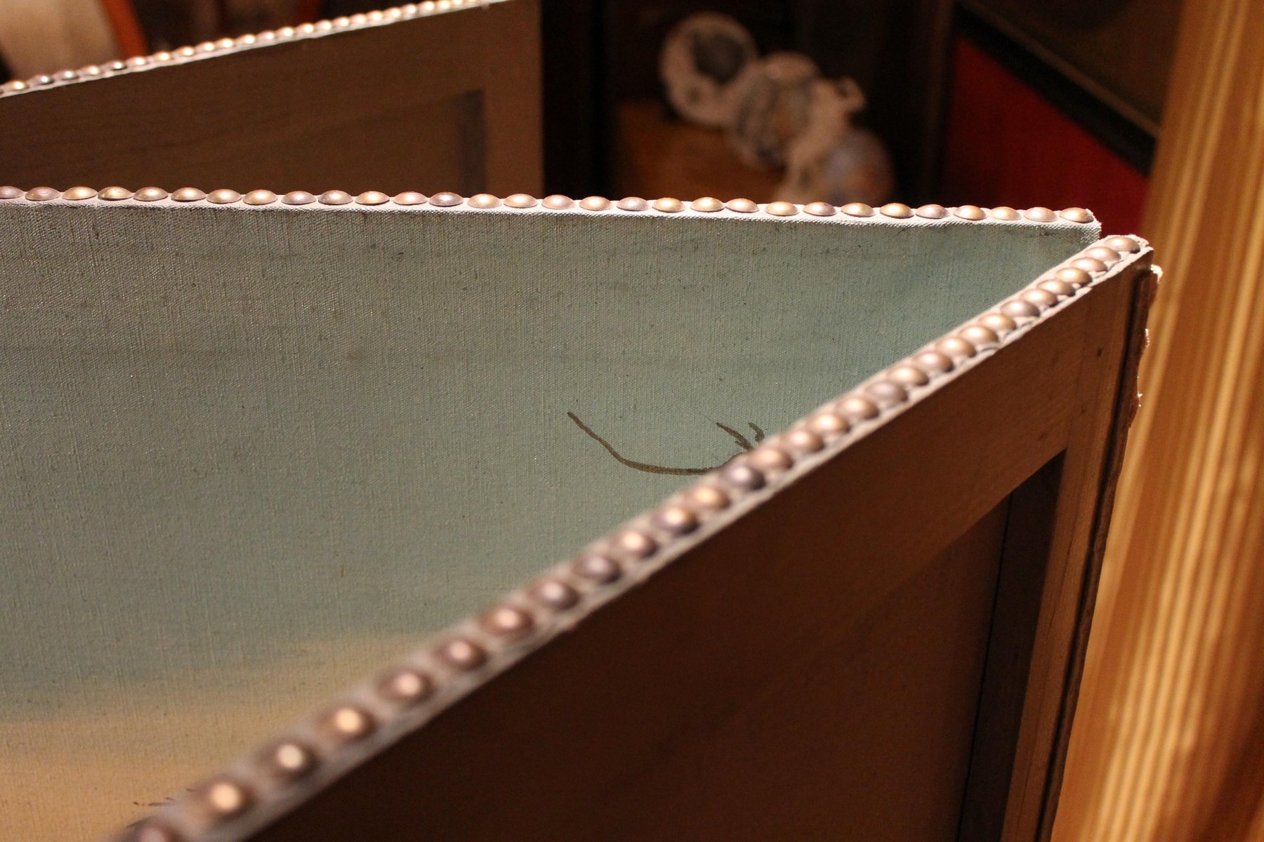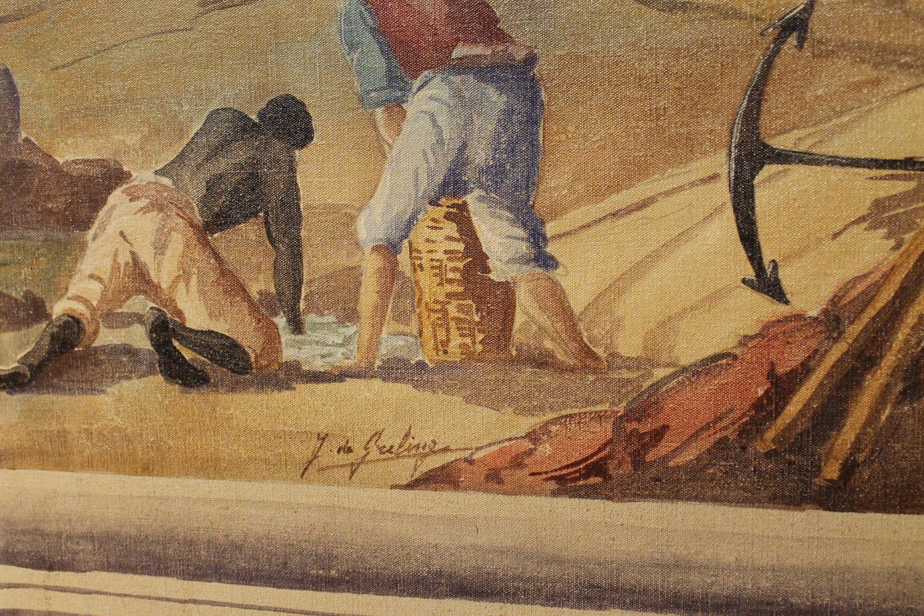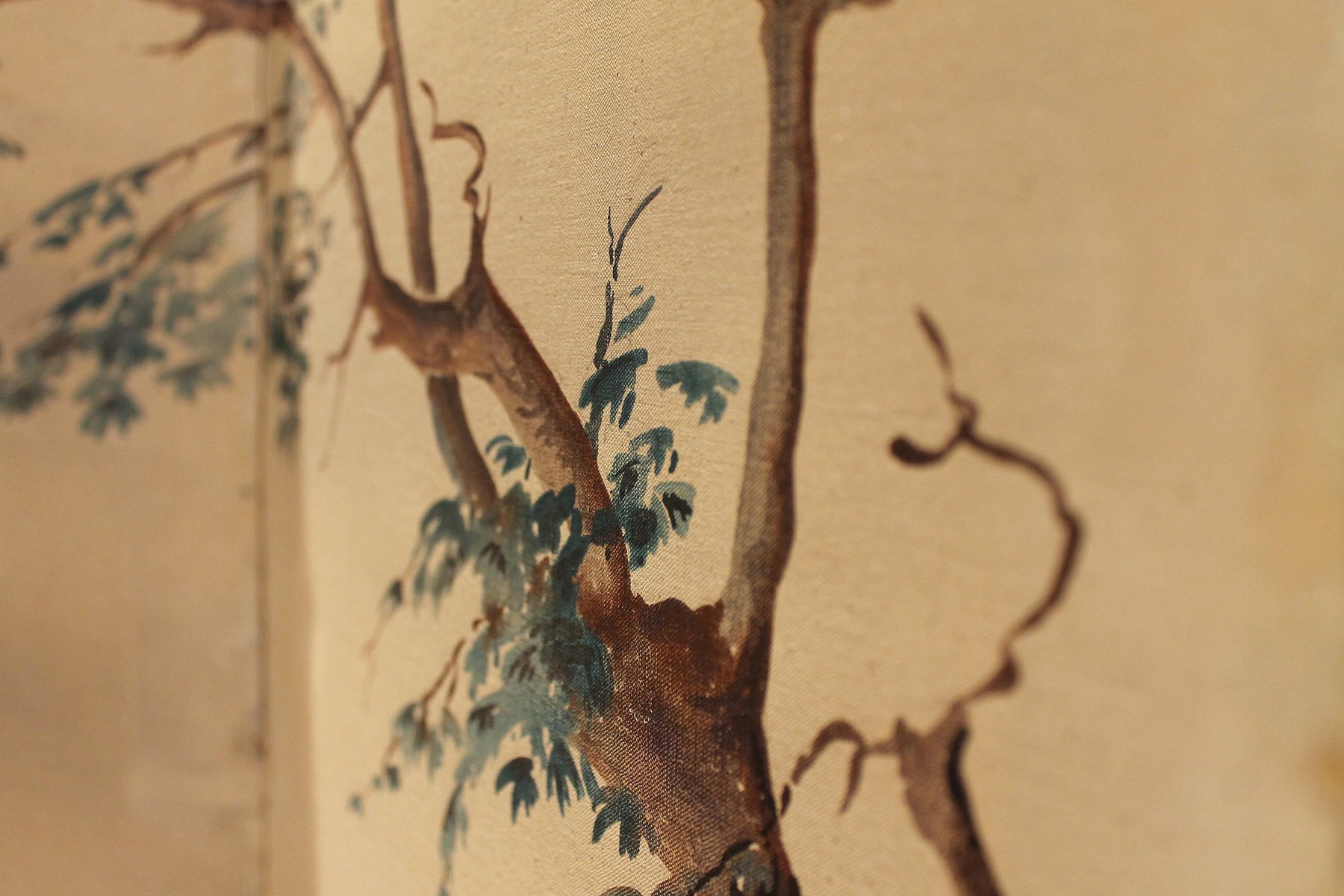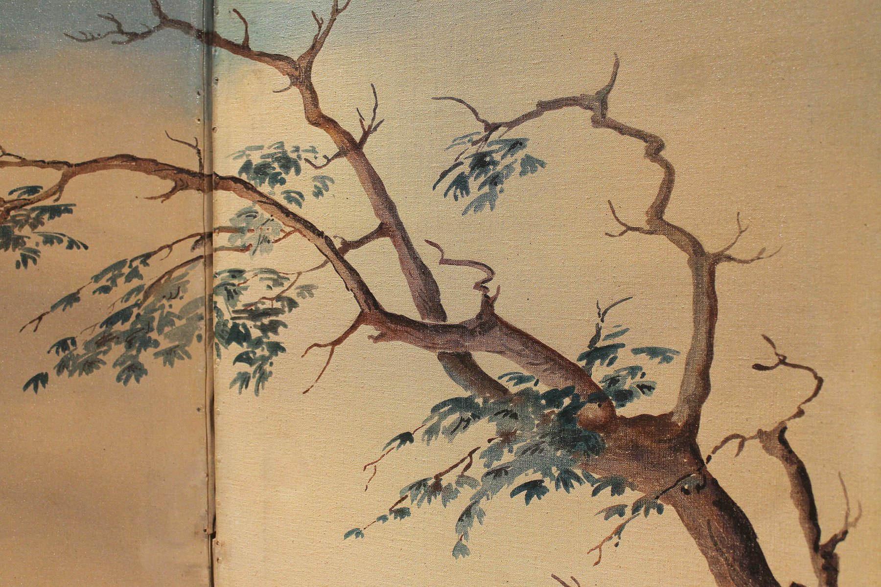 Dieser französische Paravent aus dem frühen 20. Jahrhundert besteht aus vier Leinwänden, die vollständig mit strukturierter Temperamalerei bemalt sind und eine Meereslandschaft im Stil Ludwigs XV. zeigen, die an romantische Atmosphären und bestimmte Stimmungen aus der Vergangenheit erinnert. Die heitere Seelandschaft ist mit Figuren und Booten auf einer architektonischen Szene mit einem Schloss und einem Hafen im Hintergrund belebt. Dieses dekorative Kunstwerk ist mit J. de Greling signiert, stammt aus der Zeit um 1900 und ist von italienischen Ansichten aus dem 18. Jahrhunderts. Dieser Paravent kann als ungewöhnlicher Raumteiler verwendet oder auch an die Wand gehängt werden, um ein riesiges Gemälde zu erhalten, wenn er vollständig aufgeklappt ist. Der Paravent ist ein äußerst dekoratives Möbelstück oder ein schönes Kunstwerk, das eine große Vielfalt an Farben mit einer entspannten und natürlichen Farbpalette sowie einen sehr lebendigen Touch bietet. Die Textur des Gemäldes auf der Leinwand und die Liebe zum Detail sind außergewöhnlich, ebenso wie die Veredelung an der Unterseite mit einer unechten Verkleidung, die mit einem Trompe-l'oeil-Effekt erzielt wurde. Die Leinwände sind auf Holzrahmen montiert, die mit Scharnieren versehen sind, um eine vollständige Entfaltung zu ermöglichen, und mit Polsternägeln befestigt. Sehr guter Gesamtzustand, geringe alters- und gebrauchsbedingte Gebrauchsspuren, stabile Malerei, originale Patina. Maße: H. 160 cm, B. 50 cm je Tafel.