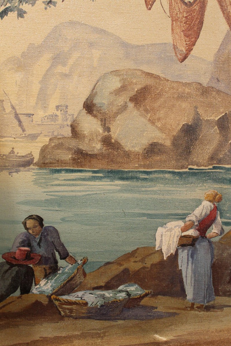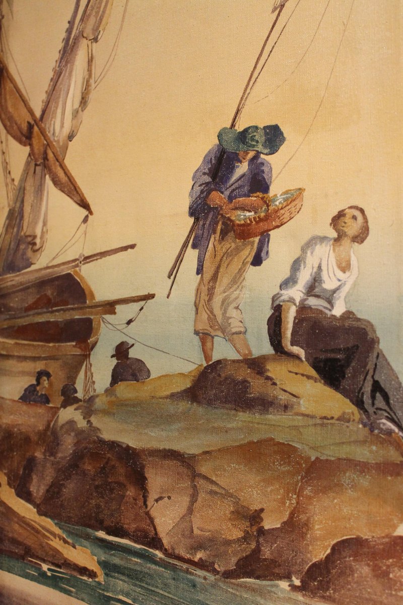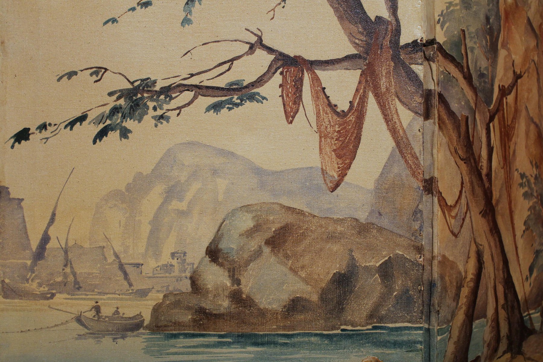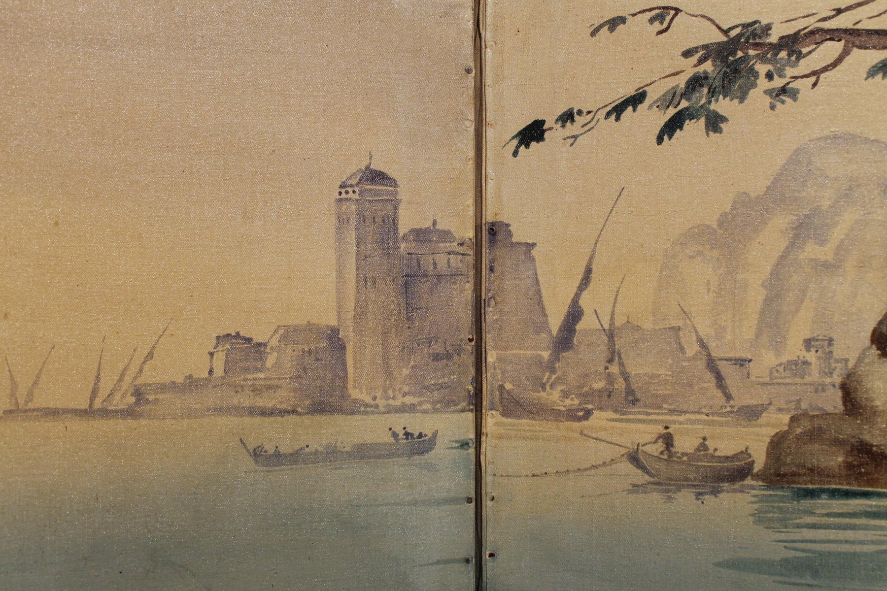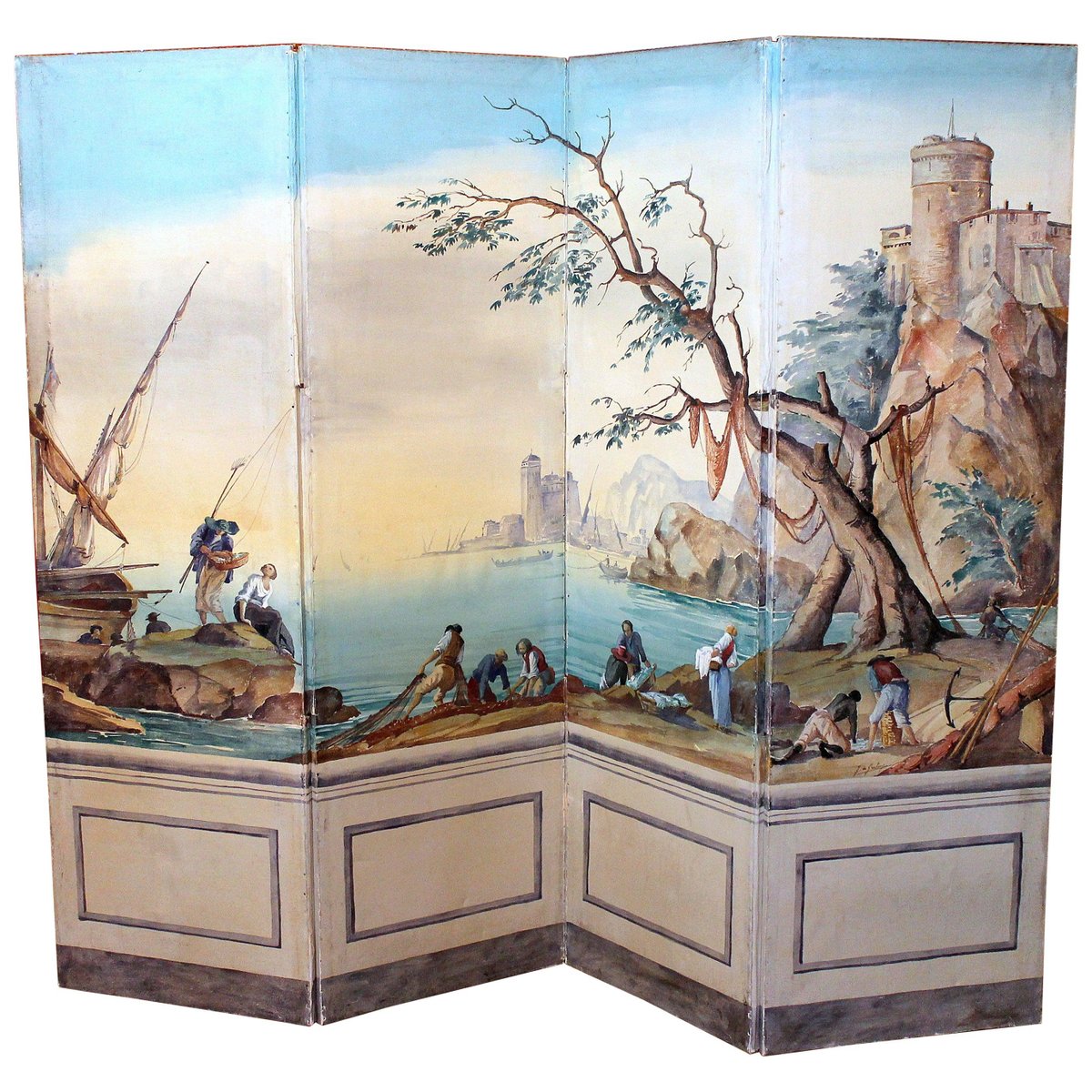 This French early 20th Century folding screen is made up of four canvases entirely painted with textured tempera featuring a marine landscape view in full Louis XV style, reminiscences of romantic atmospheres with certain moods from the past. The serene seascape is animated with characters and boats on an architectural scene with a perched castle and a harbor in the background. This fine art decorative piece is signed J. de Greling, dating back to 1900 circa is inspired by 18th Century Italian views. This screen can be used as an unusual room divider or it can also be hung on the wall to have a huge painting when fully unfolded. It is an extremely decorative piece of furniture or fine artwork, presenting a wide variety of colors with relaxed and natural palette as well as a very lively touch. The texture of the painting on the canvas and the attention to detail are exceptional as well as the finishing at the bottom with faux paneling achieved with a trompe l'oeil effect. Each Canvas is mounted on wooden frames, hinged to allow total unfolding and fixed with upholstery nails. Very good overall condition, minor wear considering age and use, stable painting, original patina. Measures: H. 160 cm, W. 50 cm each panel.