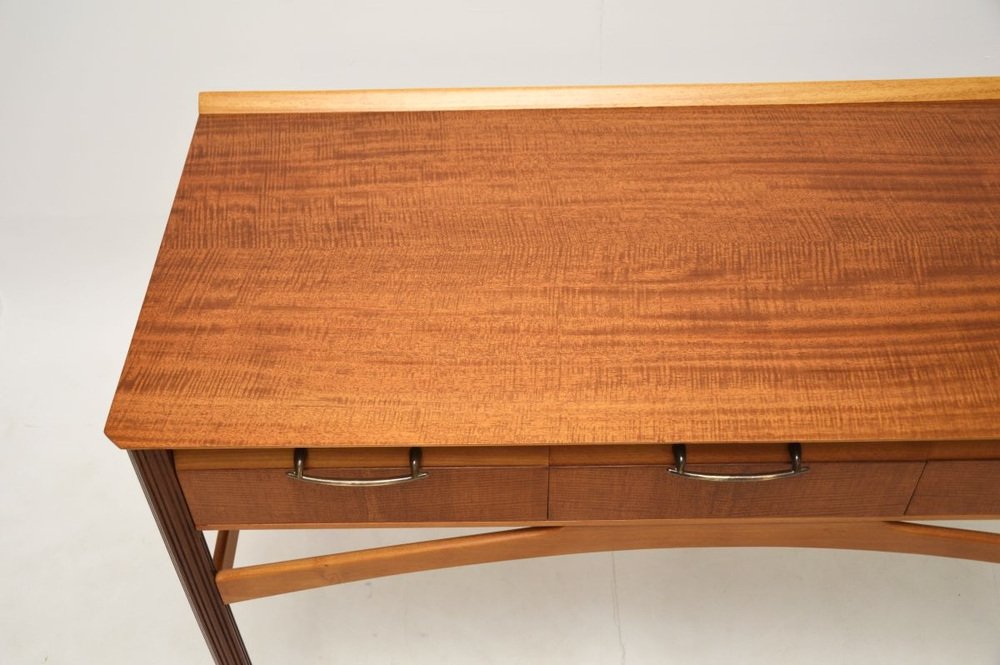 Er ist wunderschön gestaltet und von hervorragender Qualität. Dank seiner großzügigen Größe eignet er sich ideal als Schreibtisch, Konsolentisch oder Schminktisch. Das Satinholz hat einen wunderschönen Farbton, der Tisch verfügt über drei Schubladen mit Messinggriffen und steht auf geriffelten Beinen. Auch die Rückseite ist schön verarbeitet, sodass der Tisch als freistehendes Möbelstück verwendet werden kann.