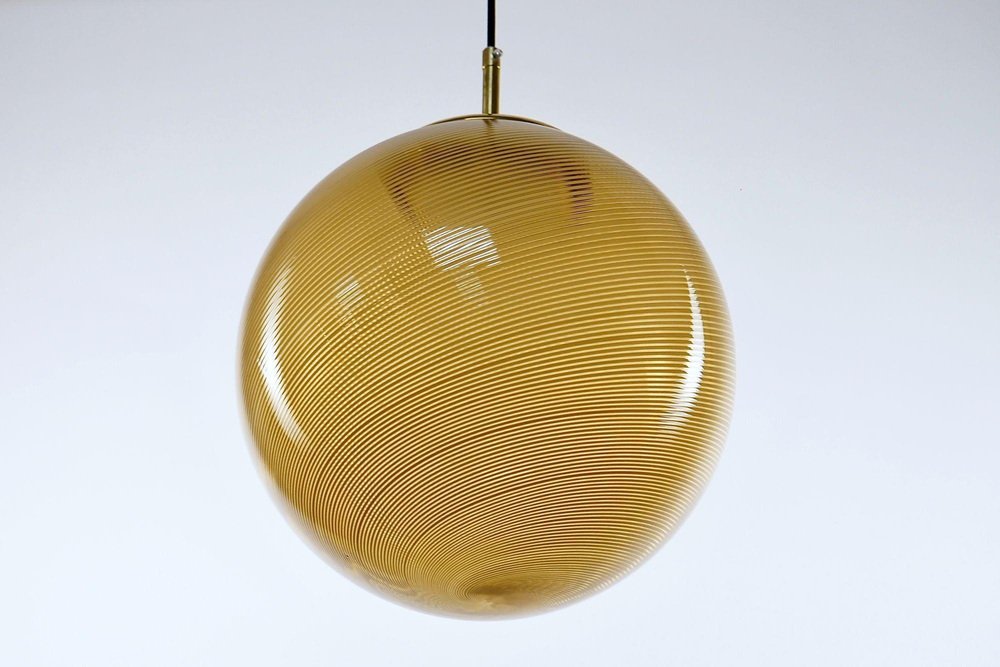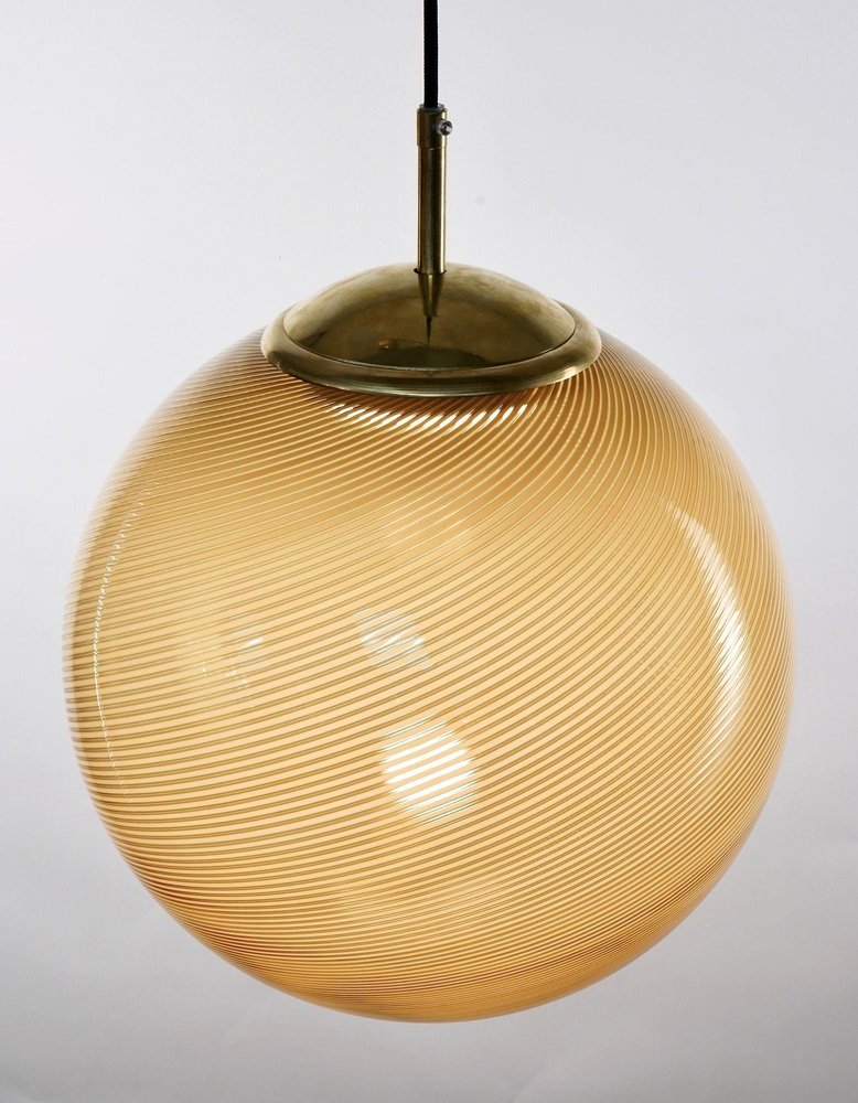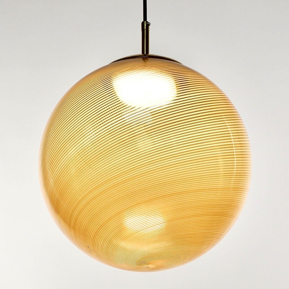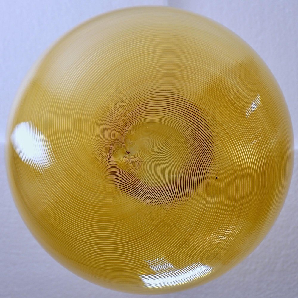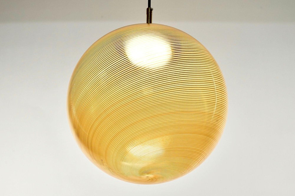 The Gaia Collection showcases a series of lighting spheres that that revive the traditional Mid-century Murano technique known as Mezza Filigrana. This collection offers boundless potential, enabling customers to create dynamic clusters or groupings, whether blending diverse patterns or highlighting a single, elegant design. Nearly forgotten because its intense labor and skill demand, this iconic technique has been revived through custom hardware that enhances its intricate beauty. I’ve crafted 9 unique patterns using Murano filigrana in Lattimo white, Black, Amber, and Red. The generous glass sphere measures 35 cm (14 inches) and is paired with modern hardware that brings the filigree pattern to life through a design that does not stay inside the sphere and allows to see entirely the crossing of the canes. It’s ideal for arranging in a striking cluster above a dining table, scattered to illuminate an island, or hung vertically in a staircase for an eye-catching effect. This particular piece showcases an elegant Amber filigree design, drawing inspiration from the minimalist Mezza Filigrana works of Carlo Scarpa. Known for his clean, refined style. In some contexts, this dense Mezza Filigrana is referred to as Tessuto, particularly in the later works of the Santillanas. The beauty of this Amber filigree is captivating. Unlike traditional filigrana canes, which are often encased in clear glass over a strong color like black or white, these canes feature a deep amber casing surrounding a lattimo white core, all enveloped in crystal-clear glass. The result is a design as rich and complex as a Murrina. In creating this piece, I worked closely with a Murano maestro to perform two complete ritorto twists (menà in the Muranese dialect) on a mosaic of over 70 alternating canes, resulting in an impeccable crisscross pattern. The Gaia pattern is carefully crafted by rolling glass over a parallel mosaic of Murano smalto filigree. Before blowing, the glass undergoes two rotations, transforming the straight canes into graceful spirals. The tips are then delicately cut, revealing the signature reticello effect. The modern element in this classic design is the custom hardware. Made from solid brass, it houses an Italian-manufactured LED module mounted on the inner surface of the fixture. This energy-efficient module provides 1000 lumens of light output, is dimmable, and boasts a CRI above 90 for optimal color rendering. The absence of a central socket and bulb allows the mesmerizing filigree pattern to remain fully visible. The silk wire and UL-CE SELV driver are elegantly integrated into the brass canopy.