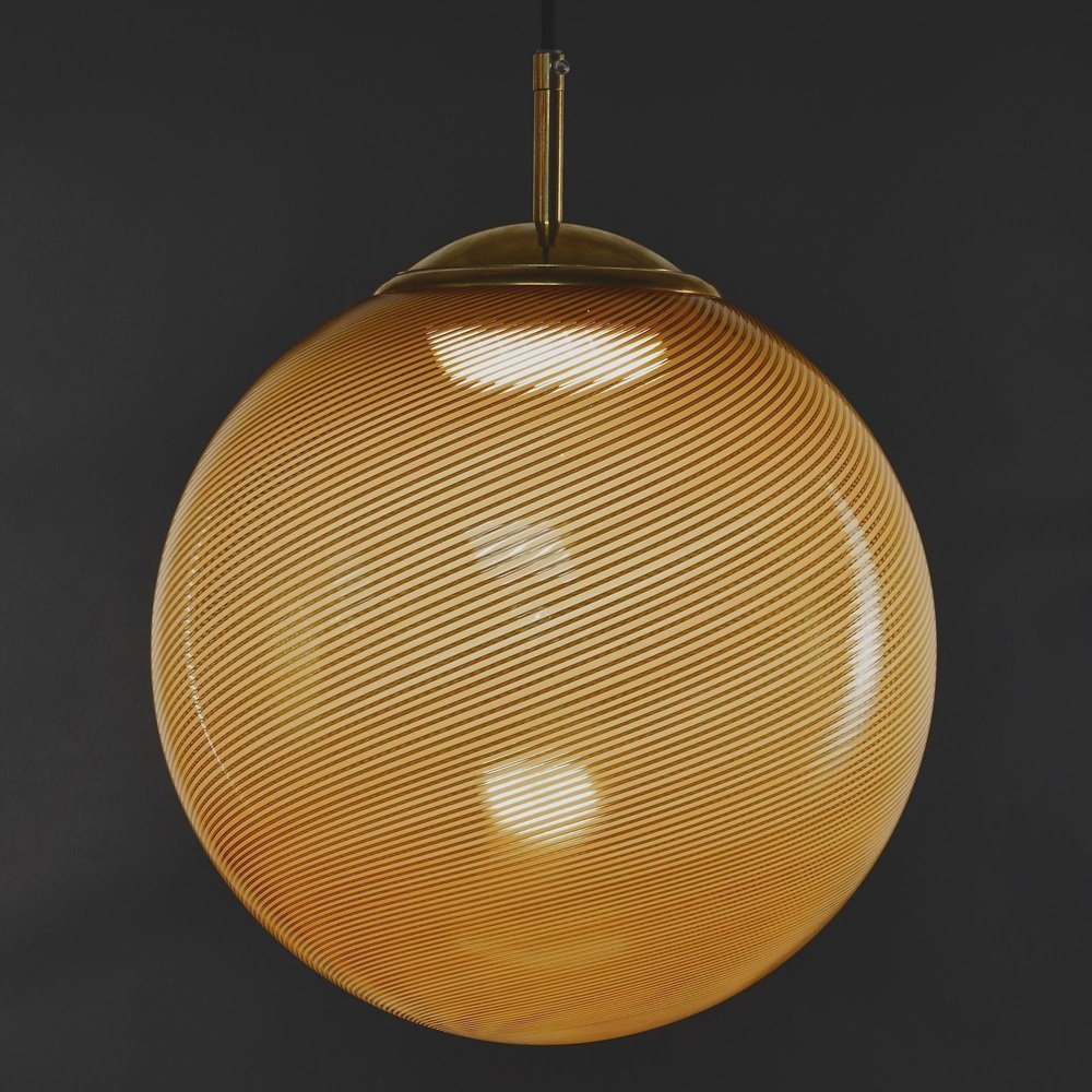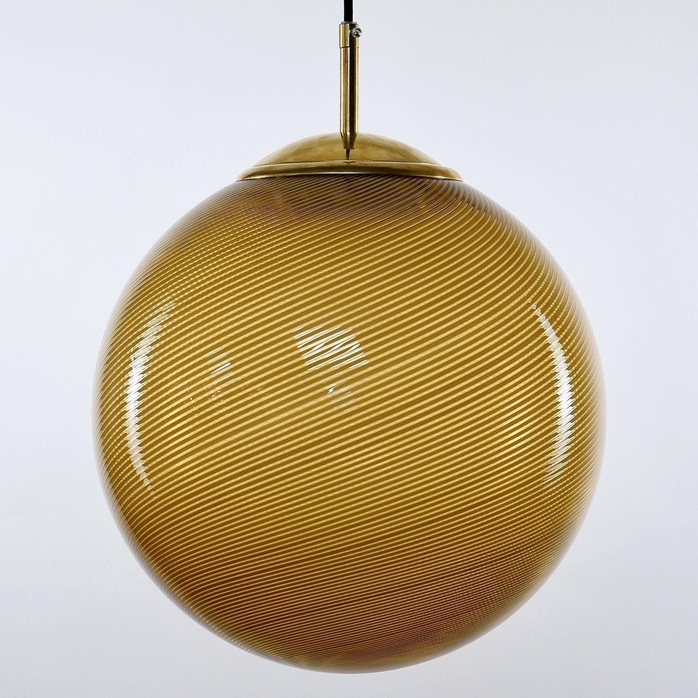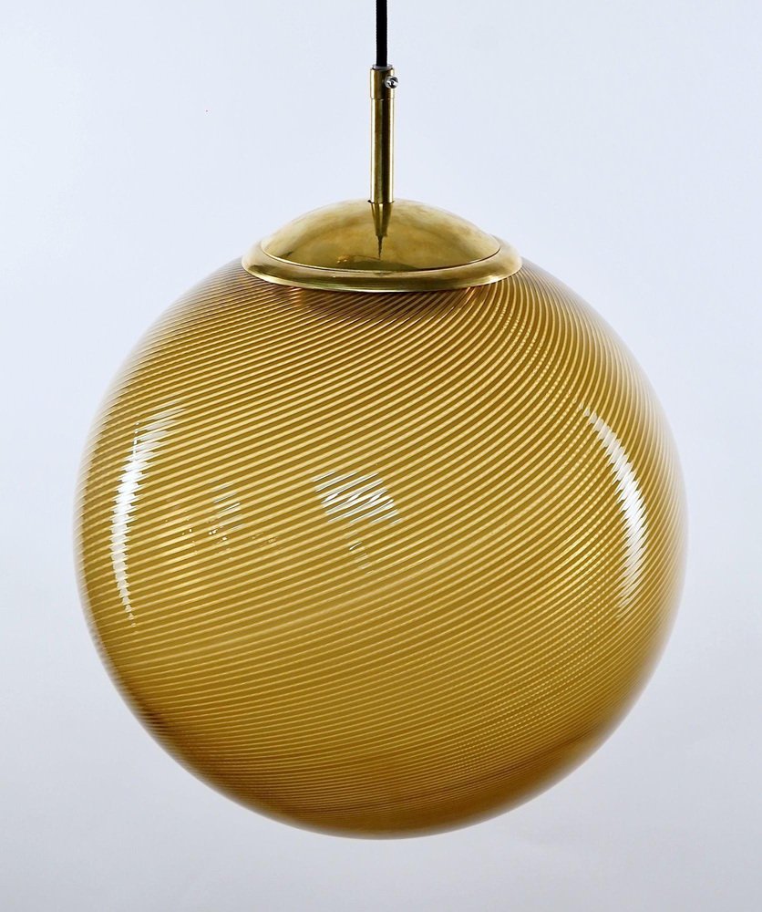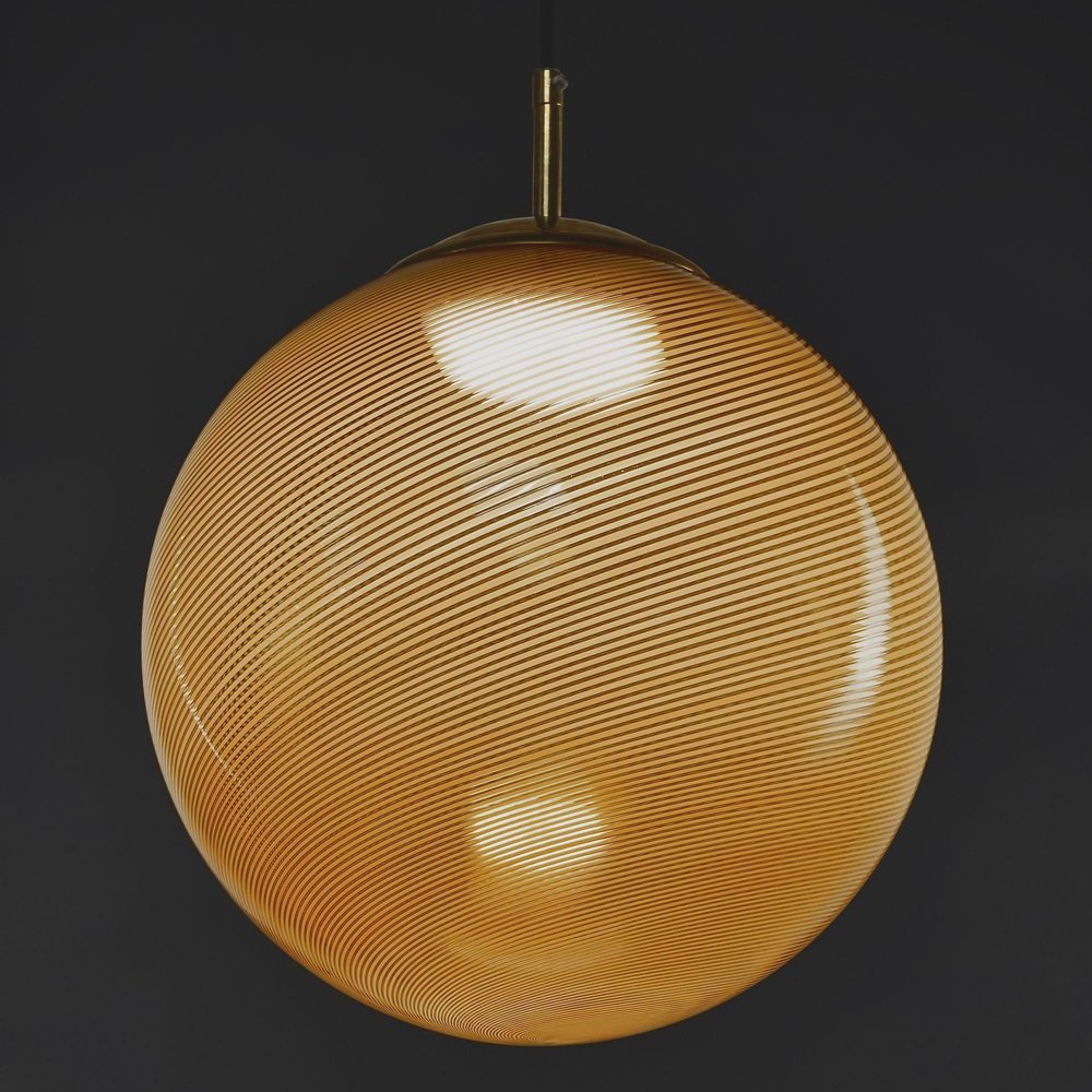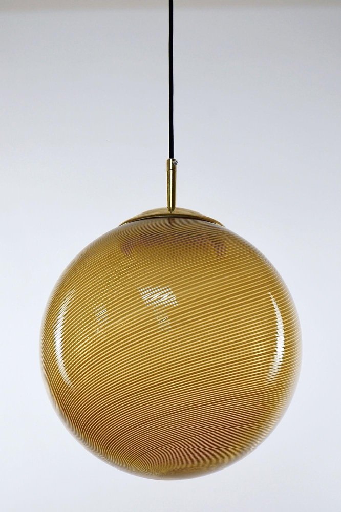 The Gaia Collection showcases a series of lighting spheres that that revive the traditional Mid-century Murano technique known as Mezza Filigrana. This collection offers boundless potential, enabling customers to create dynamic clusters or groupings, whether blending diverse patterns or highlighting a single, elegant design. Nearly forgotten because its intense labor and skill demand, this iconic technique has been revived through custom hardware that enhances its intricate beauty. I’ve crafted 9 unique patterns using Murano filigrana in Lattimo white, Black, Amber, and Red. The generous glass sphere measures 35 cm (14 inches) and is paired with modern hardware that brings the filigree pattern to life through a design that does not stay inside the sphere and allows to see entirely the crossing of the canes. It’s ideal for arranging in a striking cluster above a dining table, scattered to illuminate an island, or hung vertically in a staircase for an eye-catching effect. This particular piece showcases an elegant Amber filigree design, drawing inspiration from the minimalist Mezza Filigrana works of Carlo Scarpa. Known for his clean, refined style. In some contexts, this dense Mezza Filigrana is referred to as Tessuto, particularly in the later works of the Santillanas. The beauty of this Amber filigree is captivating. Unlike traditional filigrana canes, which are often encased in clear glass over a strong color like black or white, these canes feature a deep amber casing surrounding a lattimo white core, all enveloped in crystal-clear glass. The result is a design as rich and complex as a Murrina. In creating this piece, I worked closely with a Murano maestro to perform two complete ritorto twists (menà in the Muranese dialect) on a mosaic of over 70 alternating canes, resulting in an impeccable crisscross pattern. The Gaia pattern is carefully crafted by rolling glass over a parallel mosaic of Murano smalto filigree. Before blowing, the glass undergoes two rotations, transforming the straight canes into graceful spirals. The tips are then delicately cut, revealing the signature reticello effect. The modern element in this classic design is the custom hardware. Made from solid brass, it houses an Italian-manufactured LED module mounted on the inner surface of the fixture. This energy-efficient module provides 1000 lumens of light output, is dimmable, and boasts a CRI above 90 for optimal color rendering. The absence of a central socket and bulb allows the mesmerizing filigree pattern to remain fully visible. The silk wire and UL-CE SELV driver are elegantly integrated into the brass canopy.