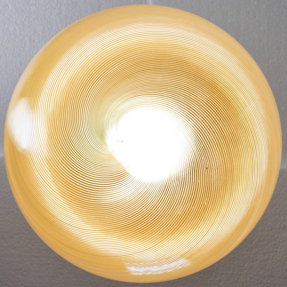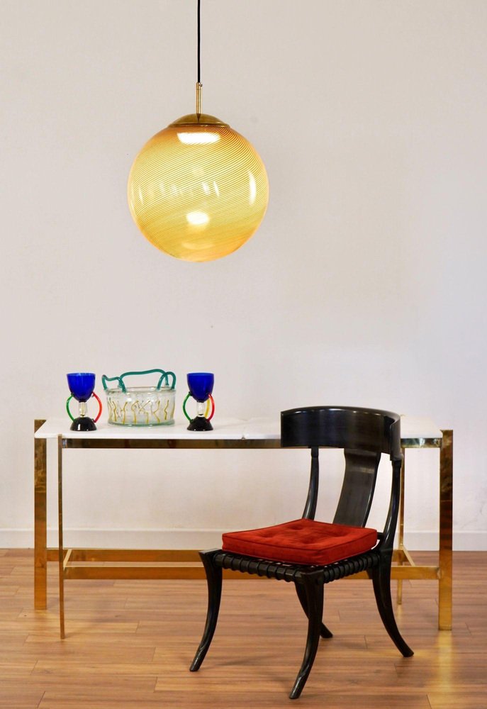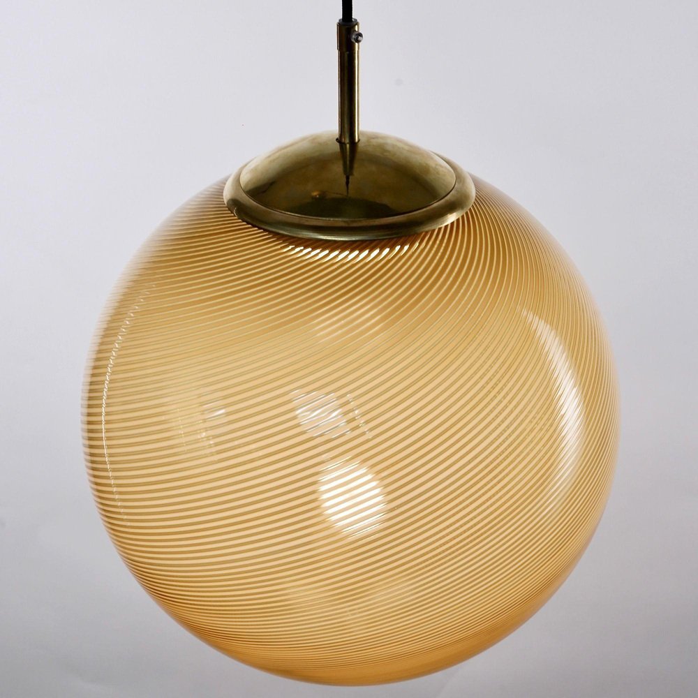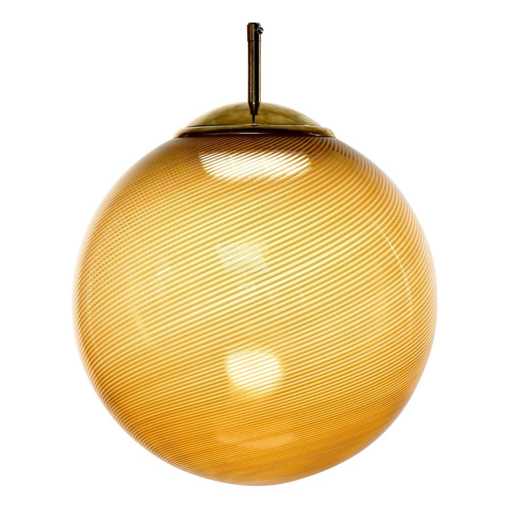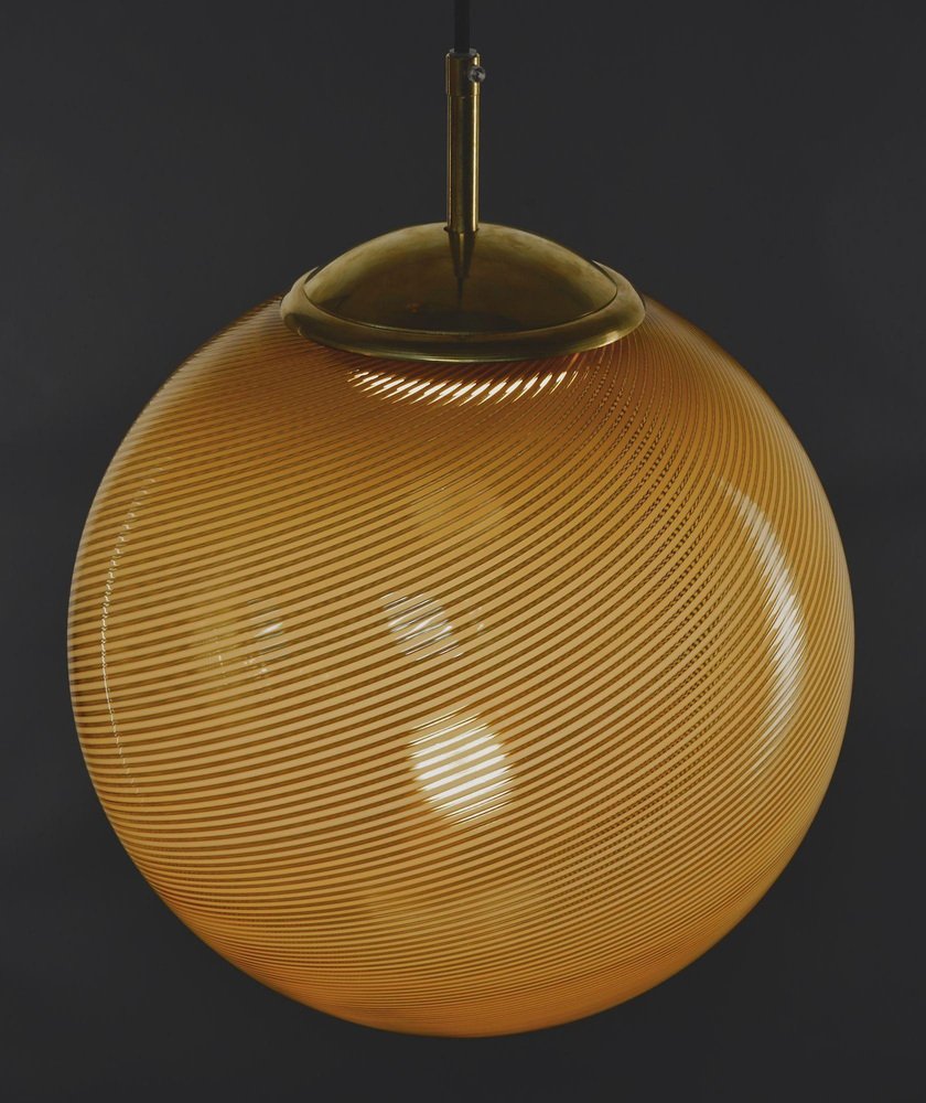 The Gaia Collection showcases a series of lighting spheres that that revive the traditional Mid-century Murano technique known as Mezza Filigrana. This collection offers boundless potential, enabling customers to create dynamic clusters or groupings, whether blending diverse patterns or highlighting a single, elegant design. Nearly forgotten because its intense labor and skill demand, this iconic technique has been revived through custom hardware that enhances its intricate beauty. I’ve crafted 9 unique patterns using Murano filigrana in Lattimo white, Black, Amber, and Red. The generous glass sphere measures 35 cm (14 inches) and is paired with modern hardware that brings the filigree pattern to life through a design that does not stay inside the sphere and allows to see entirely the crossing of the canes. It’s ideal for arranging in a striking cluster above a dining table, scattered to illuminate an island, or hung vertically in a staircase for an eye-catching effect. This particular piece showcases an elegant Amber filigree design, drawing inspiration from the minimalist Mezza Filigrana works of Carlo Scarpa. Known for his clean, refined style. In some contexts, this dense Mezza Filigrana is referred to as Tessuto, particularly in the later works of the Santillanas. The beauty of this Amber filigree is captivating. Unlike traditional filigrana canes, which are often encased in clear glass over a strong color like black or white, these canes feature a deep amber casing surrounding a lattimo white core, all enveloped in crystal-clear glass. The result is a design as rich and complex as a Murrina. In creating this piece, I worked closely with a Murano maestro to perform two complete ritorto twists (menà in the Muranese dialect) on a mosaic of over 70 alternating canes, resulting in an impeccable crisscross pattern. The Gaia pattern is carefully crafted by rolling glass over a parallel mosaic of Murano smalto filigree. Before blowing, the glass undergoes two rotations, transforming the straight canes into graceful spirals. The tips are then delicately cut, revealing the signature reticello effect. The modern element in this classic design is the custom hardware. Made from solid brass, it houses an Italian-manufactured LED module mounted on the inner surface of the fixture. This energy-efficient module provides 1000 lumens of light output, is dimmable, and boasts a CRI above 90 for optimal color rendering. The absence of a central socket and bulb allows the mesmerizing filigree pattern to remain fully visible. The silk wire and UL-CE SELV driver are elegantly integrated into the brass canopy.