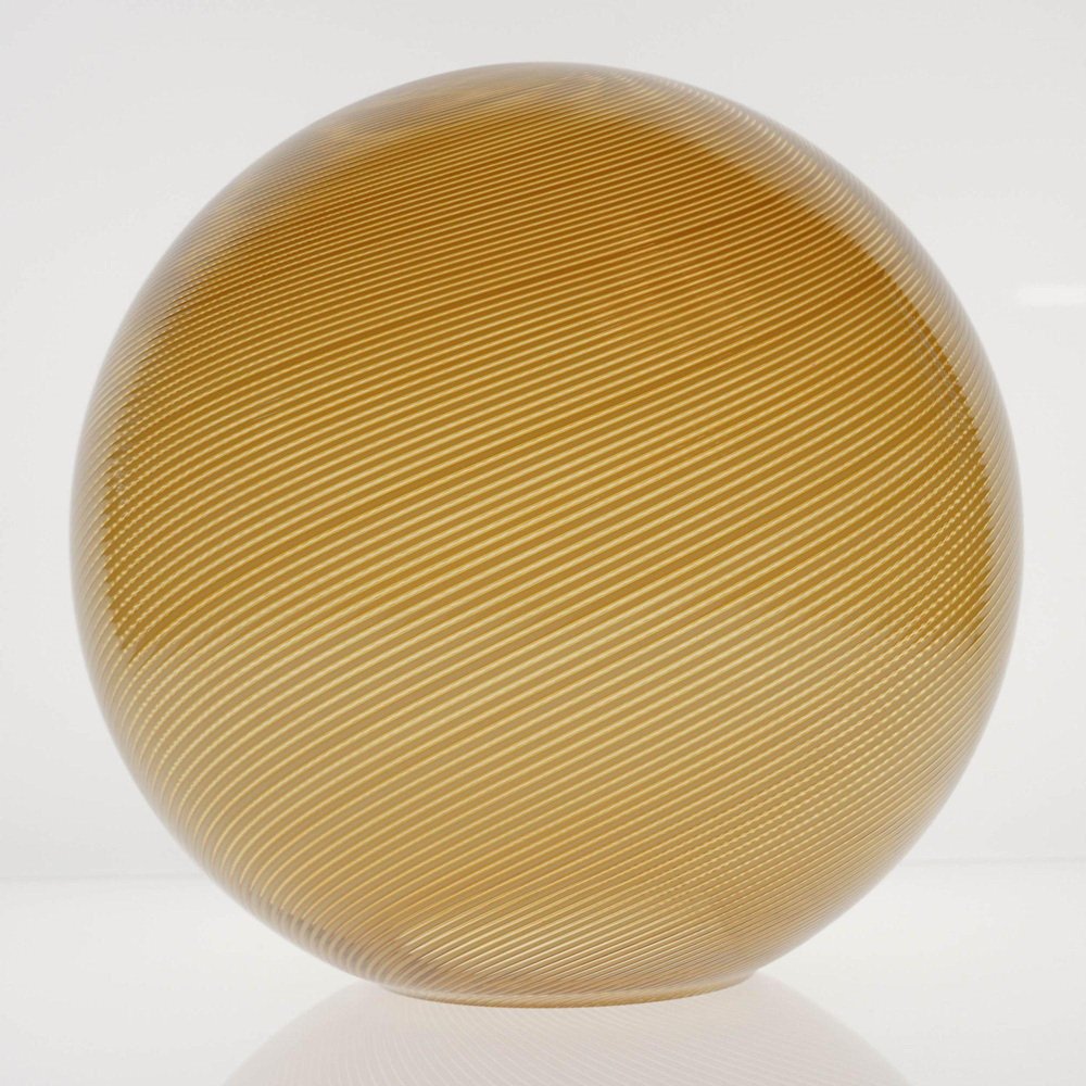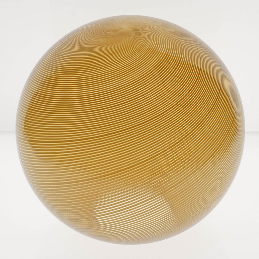 Die Gaia-Kollektion zeigt eine Reihe von Beleuchtungskugeln, die die traditionelle Murano-Technik aus der Mitte des Jahrhunderts, Mezza Filigrana genannt, wieder aufleben lassen. Diese Kollektion bietet ein grenzenloses Potenzial, das es dem Kunden ermöglicht, dynamische Cluster oder Gruppierungen zu kreieren, sei es durch die Kombination verschiedener Muster oder durch die Hervorhebung eines einzelnen, eleganten Designs. Diese ikonische Technik, die aufgrund des hohen Arbeitsaufwands und der hohen Anforderungen an die Geschicklichkeit fast in Vergessenheit geraten war, wurde durch maßgefertigte Beschläge wiederbelebt, die ihre komplizierte Schönheit noch unterstreichen. Ich habe 9 einzigartige Muster aus Murano-Filigrana in den Farben Lattimo weiß, schwarz, bernsteinfarben und rot kreiert. Die großzügige Glaskugel misst 35 cm (14 Zoll) und ist mit modernen Beschlägen versehen, die das filigrane Muster durch ein Design zum Leben erwecken, das nicht in der Kugel verbleibt und es ermöglicht, die Kreuzung der Stäbe vollständig zu sehen. Sie ist ideal, um sie in einer auffälligen Gruppe über einem Esstisch zu arrangieren, um eine Insel zu beleuchten oder um sie vertikal in einem Treppenhaus aufzuhängen, um einen auffälligen Effekt zu erzielen. Dieses besondere Stück zeigt ein elegantes Bernstein-Filigran-Design, das von den minimalistischen Mezza Filigrana-Arbeiten von Carlo Scarpa inspiriert ist. Er ist bekannt für seinen klaren, raffinierten Stil. In einigen Kontexten wird diese dichte Mezza Filigrana als Tessuto bezeichnet, insbesondere in den späteren Werken der Santillanas. Die Schönheit dieses Bernstein-Filigranas ist bestechend. Im Gegensatz zu den traditionellen Filigrana-Stöcken, die oft mit klarem Glas über einer kräftigen Farbe wie Schwarz oder Weiß ummantelt sind, weisen diese Stöcke eine bernsteinfarbene Hülle auf, die einen gitterartigen weißen Kern umgibt, der von kristallklarem Glas umhüllt ist. Das Ergebnis ist ein Design, so reichhaltig und komplex wie eine Murrina. Bei der Herstellung dieses Stücks habe ich eng mit einem Murano-Maestro zusammengearbeitet, um zwei vollständige Ritorto-Drehungen (menà im Murano-Dialekt) an einem Mosaik von über 70 sich abwechselnden Stäben vorzunehmen, wodurch ein tadelloses Kreuzmuster entsteht. Das Gaia-Muster wird sorgfältig hergestellt, indem Glas über ein paralleles Mosaik aus Murano-Smalto-Filigran gerollt wird. Vor dem Blasen wird das Glas zweimal gedreht, wodurch die geraden Stäbe in anmutige Spiralen verwandelt werden. Die Spitzen werden dann fein geschliffen, wodurch der charakteristische Reticello-Effekt zum Vorschein kommt. Das moderne Element in diesem klassischen Design ist der maßgeschneiderte Beschlag. Er ist aus massivem Messing gefertigt und beherbergt ein in Italien hergestelltes LED-Modul, das an der Innenseite der Leuchte angebracht ist. Dieses energieeffiziente Modul bietet eine Lichtleistung von 1000 Lumen, ist dimmbar und bietet einen CRI von über 90 für eine optimale Farbwiedergabe. Durch den Verzicht auf eine zentrale Fassung und ein Leuchtmittel bleibt das faszinierende, filigrane Muster vollständig sichtbar. Der Seidendraht und der UL-CE SELV-Treiber sind elegant in den Messingbaldachin integriert.