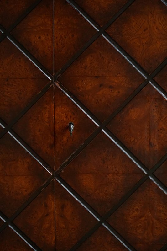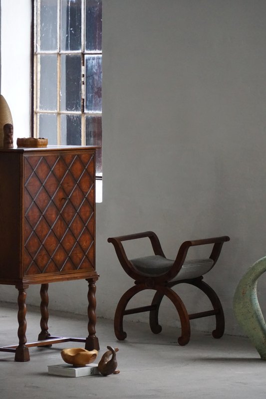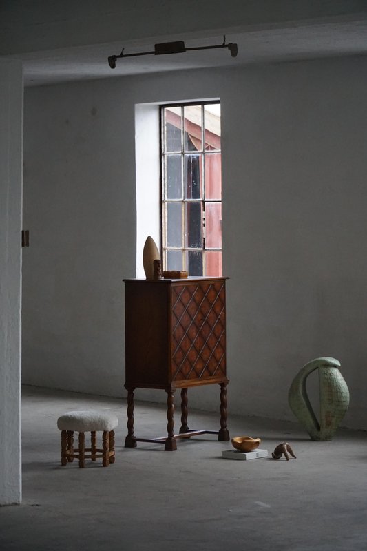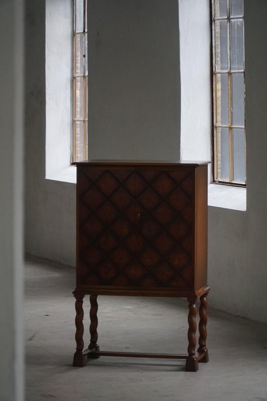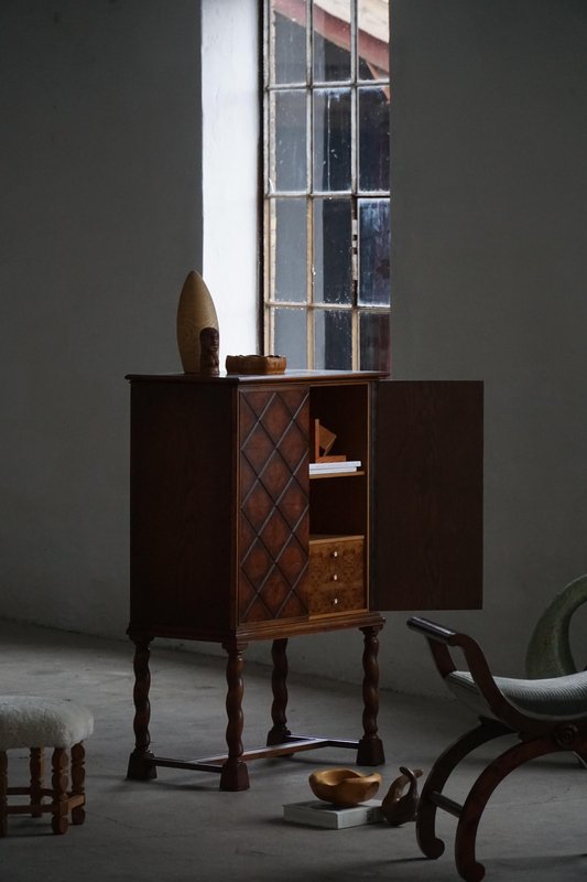This elegant Swedish Grace vintage cabinet is a refined example of mid century furniture design, showcasing high-quality craftsmanship and timeless appeal. The piece is executed in oak, with striking burl veneer accents on the doors, adding depth and decorative character to the overall composition. Made by Thysells Möbler in the 1940s. The cabinet features a pair of doors that open to reveal generous storage space with internal shelving, making it both functional and beautifully designed. The warm wood tones and distinctive burl patterns create a rich visual contrast that enhances the cabinet’s classic presence. The cabinet is raised on a turned base, lending it a sculptural silhouette and a sense of lightness while maintaining a sturdy structure. Its proportions and decorative detailing make it suitable for both traditional and contemporary interiors. Perfectly suited as a storage piece in a hallway, living room, dining room, or bedroom, this cabinet brings both practicality and elegance to any setting. This fine cabinet will complement many interior styles, including An Antique, Modern, Classic, Scandinavian, and Art Deco-inspired decor.