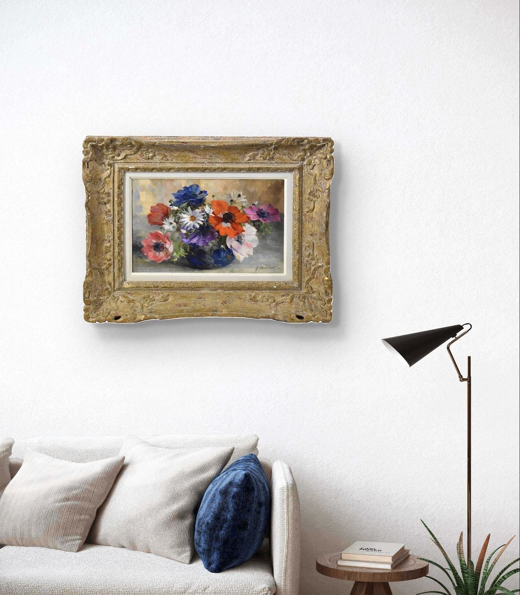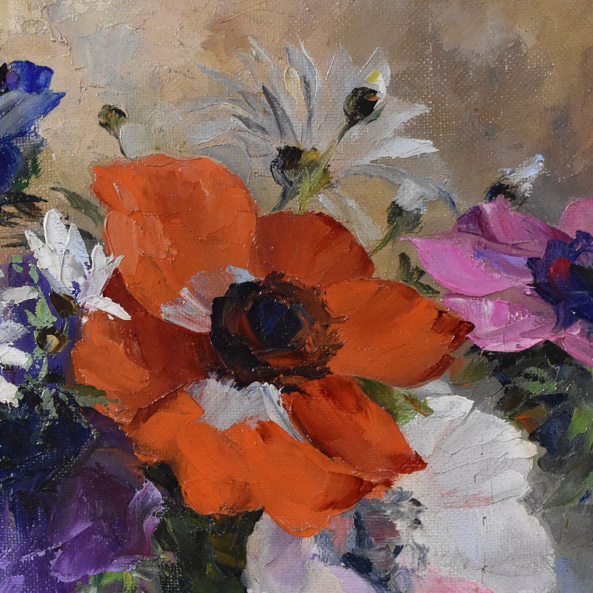 Flowers artwork, antique oil painting, floral vase painting which represents a Bouquet of Anemones and Daisies