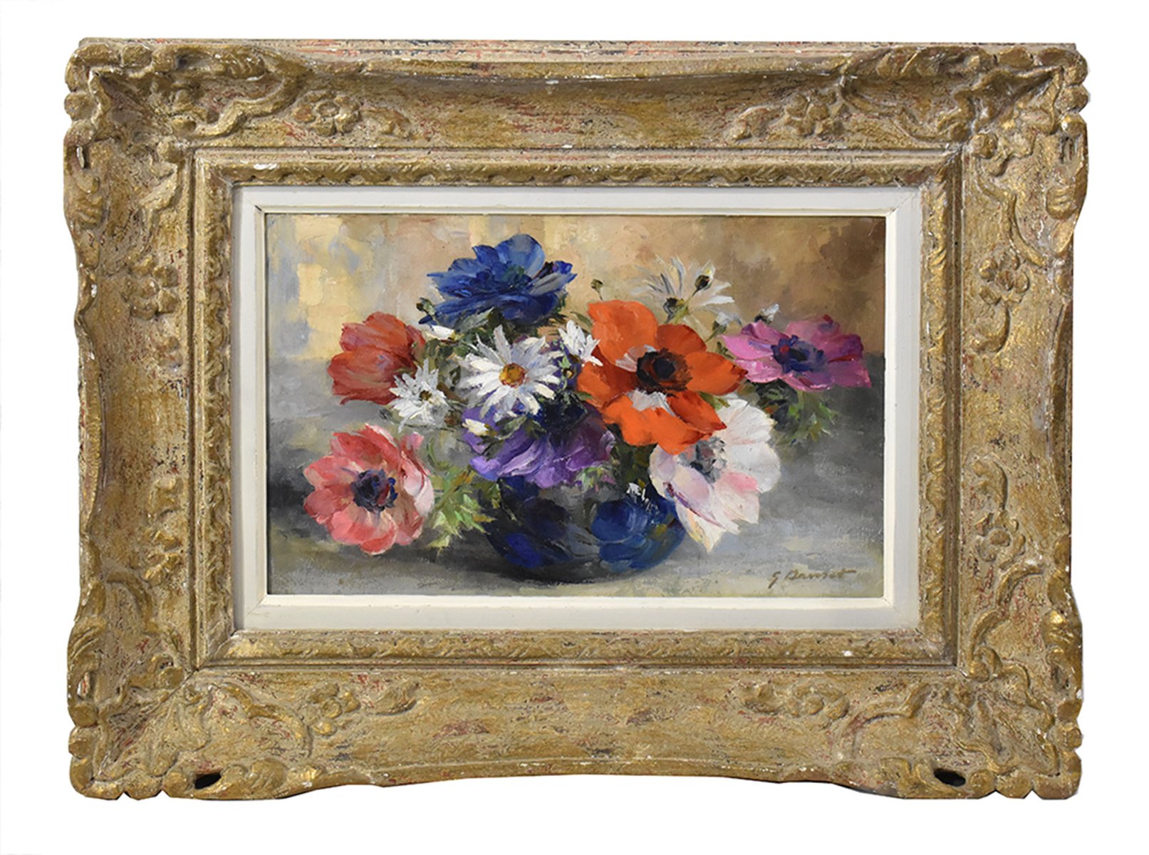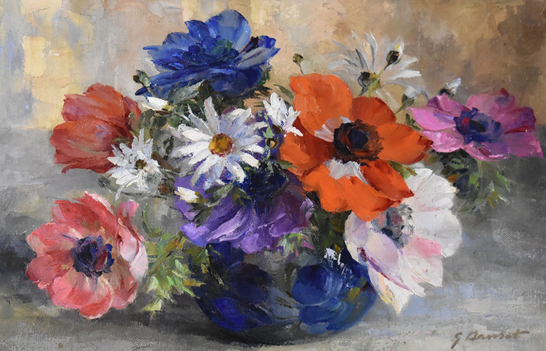 This floral oil painting on canvas is signed bottom right G. Danset, French landscape painter.