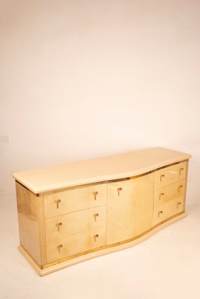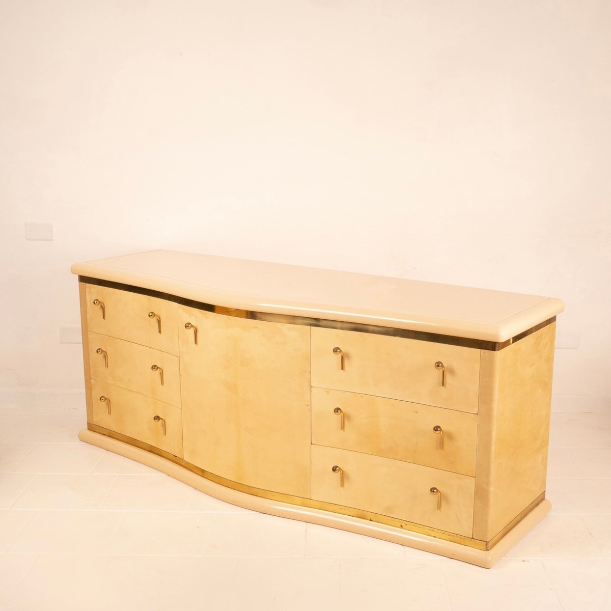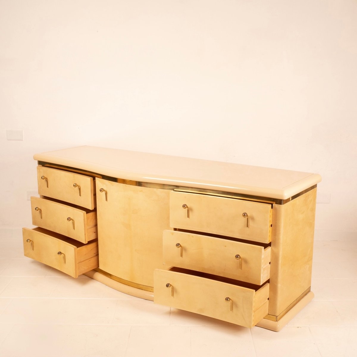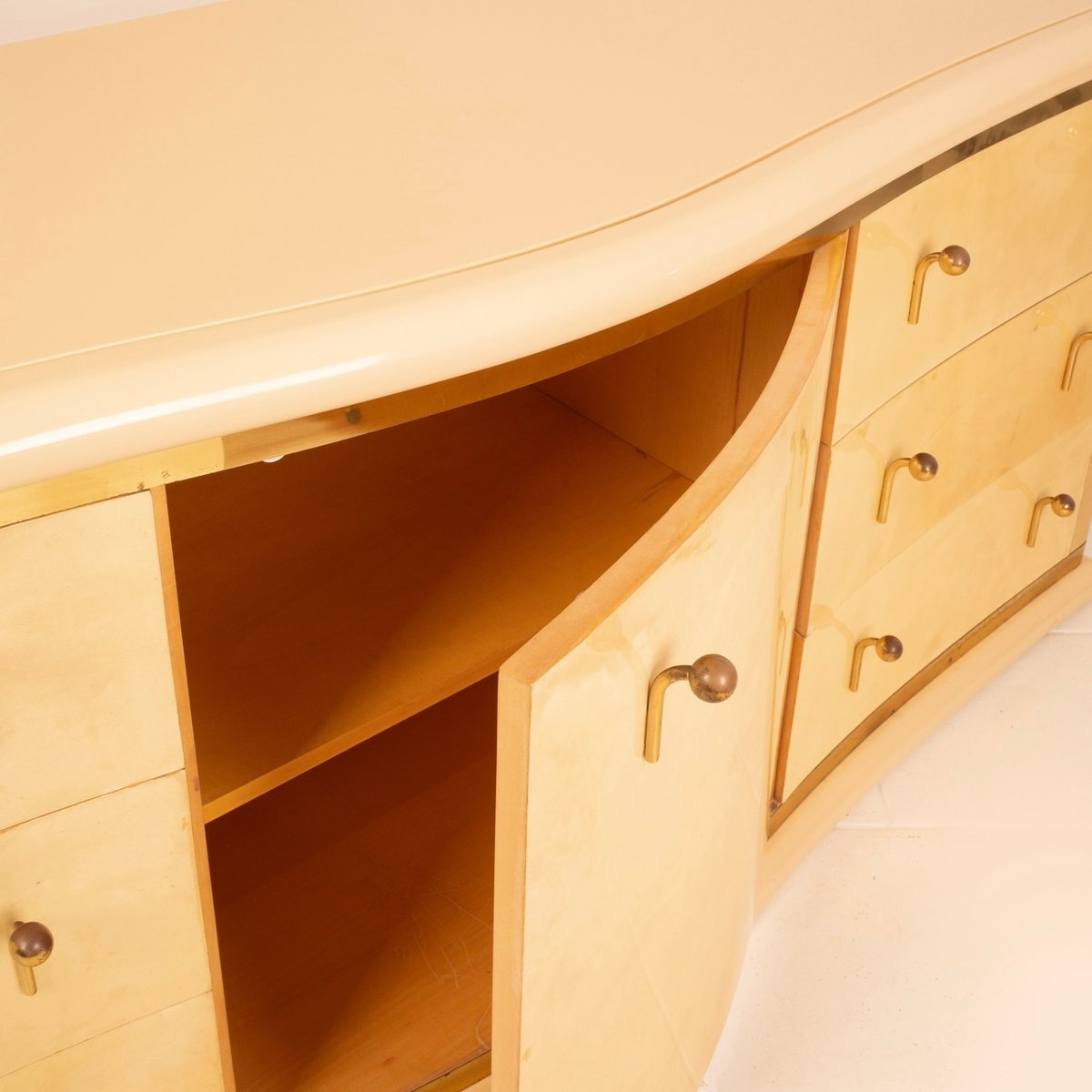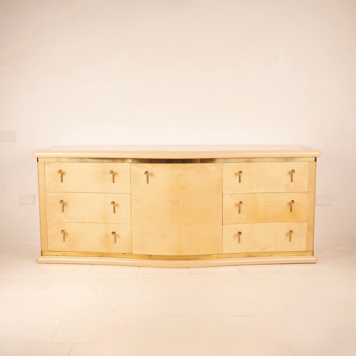 Außergewöhnlicher und äußerst seltener geschwungener Schrank, entworfen von Luciano Frigerio und hergestellt für das renommierte Unternehmen Frigerio di Desio. Dieses außergewöhnliche Stück repräsentiert den Höhepunkt italienischer Handwerkskunst der 1970er Jahre. Der vollständig mit lackiertem Naturpergament verkleidete Schrank mit Messingdetails und -griffen zeichnet sich durch sein geschwungenes Design aus, das ihn wirklich einzigartig macht. Die geschwungene Front fügt sich harmonisch in die Schubladen und die Tür ein, die alle mit millimetergenauer Präzision gefertigt sind.