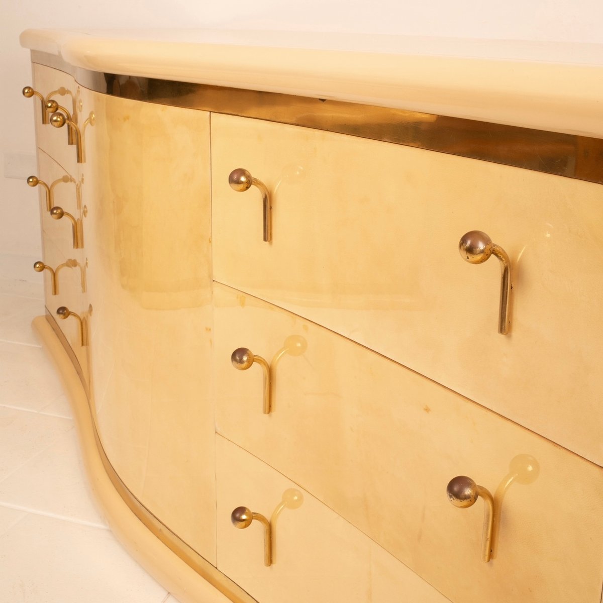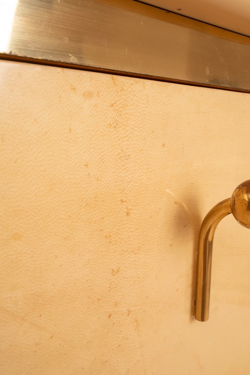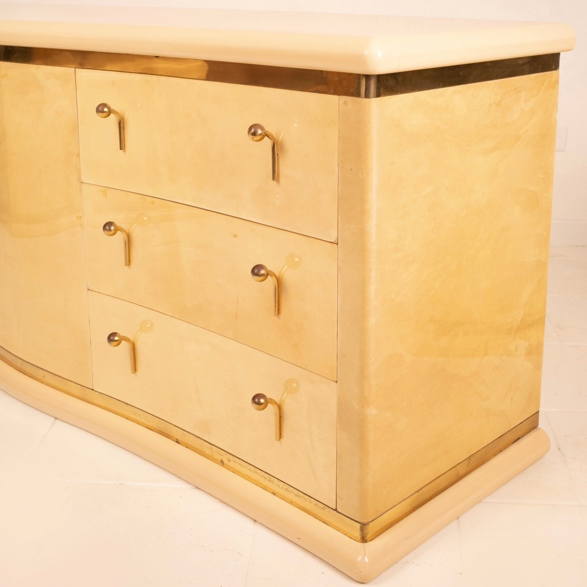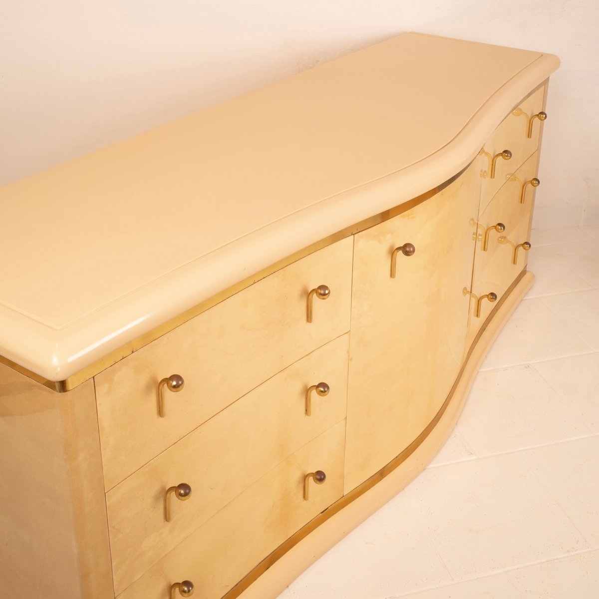 Produktname: Geschwungener Pergament-Schrank Nettuno von Luciano Frigerio für Frigerio di Desio Designer: Luciano Frigerio Entstehungsjahr: 1970er Jahre Hauptmaterialien: Lackiertes Naturpergament, Messing, Elfenbeinlack Besonderes Design: Geschwungene Front mit Schubladen und Tür, die mit millimetergenauer Präzision gefertigt wurden