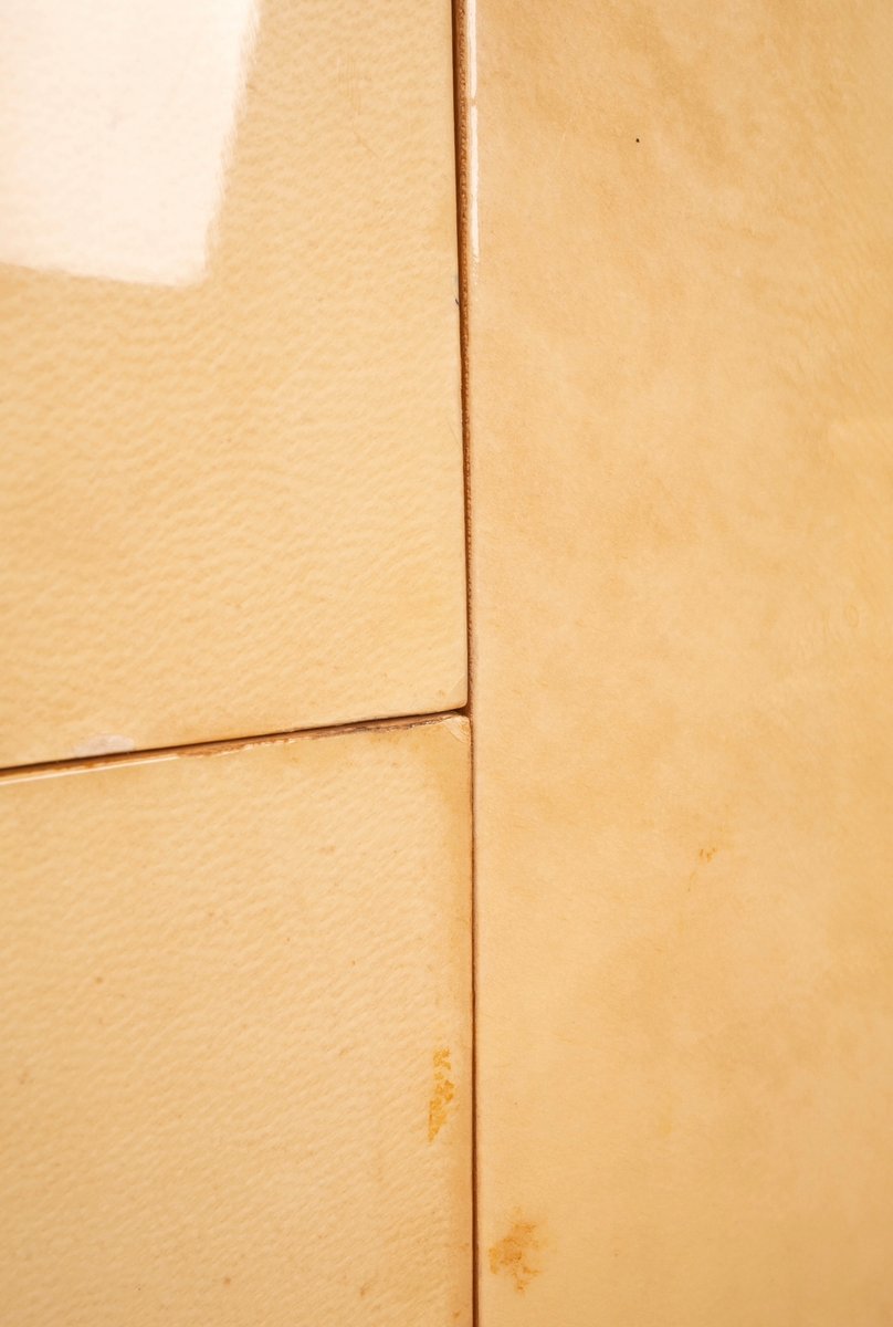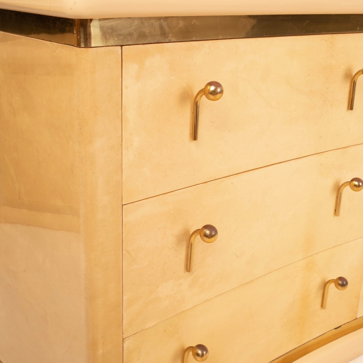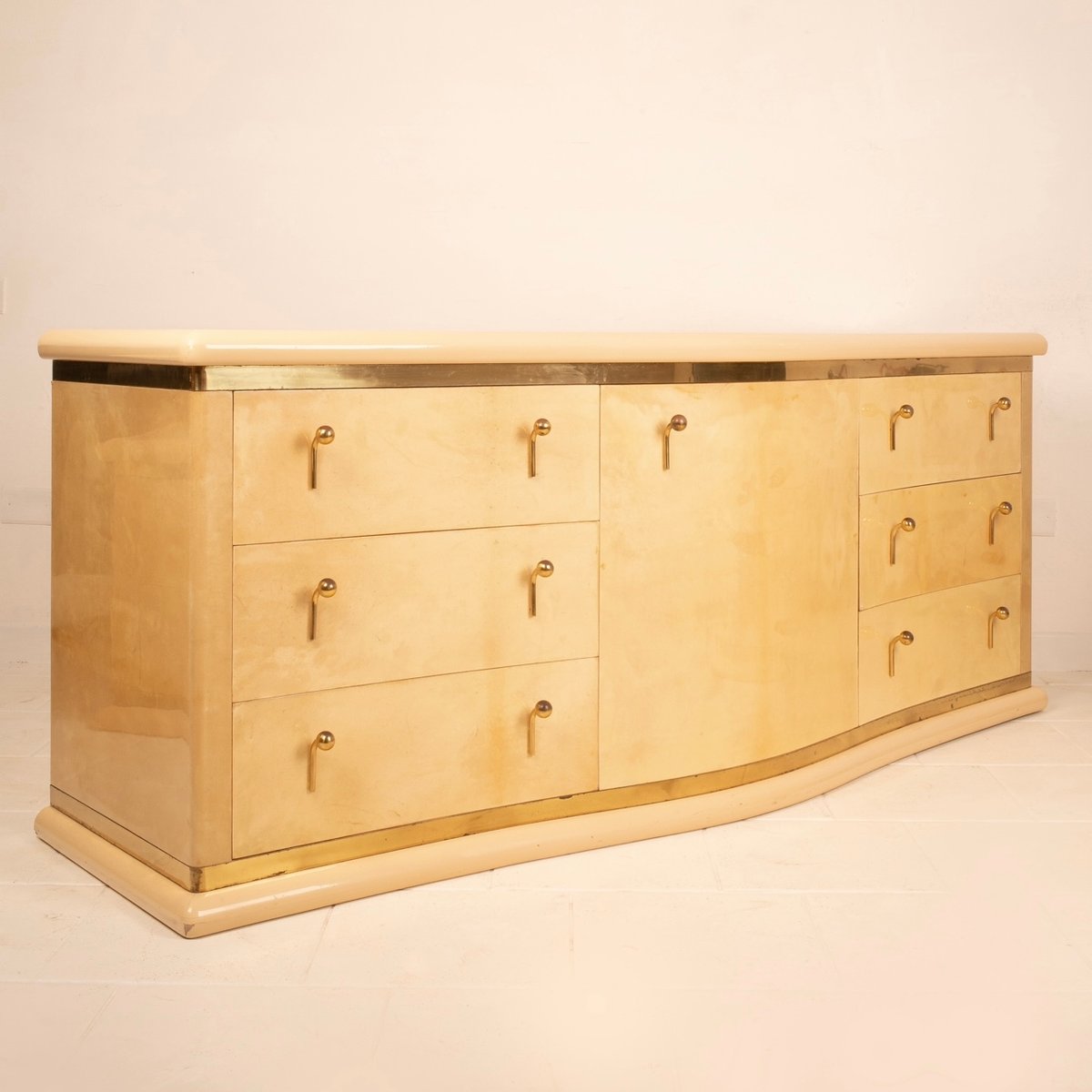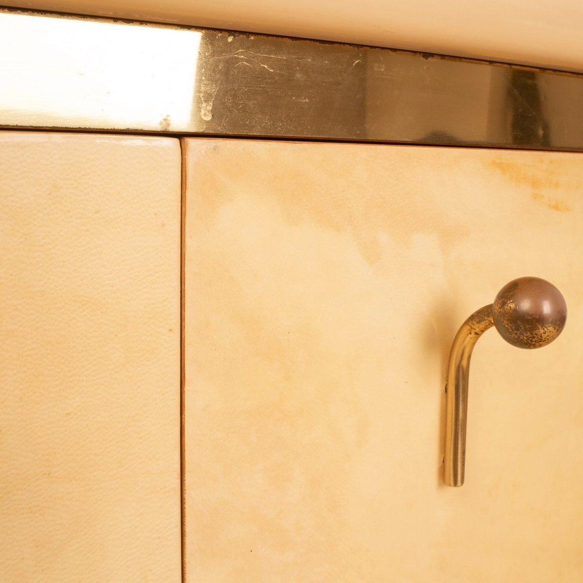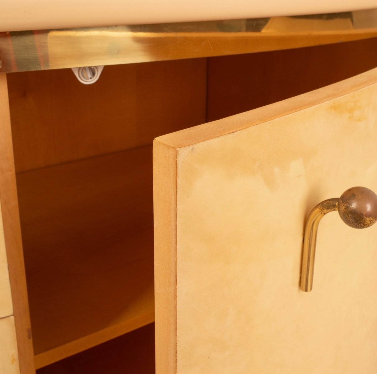 Produktname: Geschwungener Pergament-Schrank Nettuno von Luciano Frigerio für Frigerio di Desio Designer: Luciano Frigerio Entstehungsjahr: 1970er Jahre Hauptmaterialien: Lackiertes Naturpergament, Messing, Elfenbeinlack Besonderes Design: Geschwungene Front mit Schubladen und Tür, die mit millimetergenauer Präzision gefertigt wurden