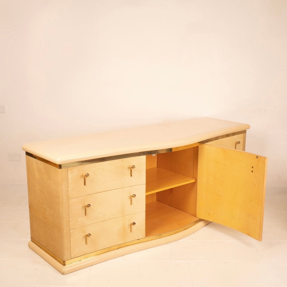 Entirely clad in lacquered natural parchment, with brass details and handles, the cabinet features a curved design that makes it truly unique.