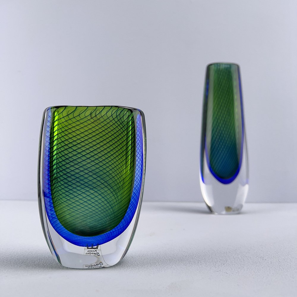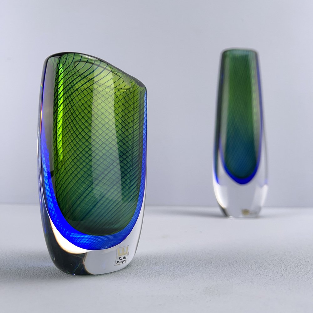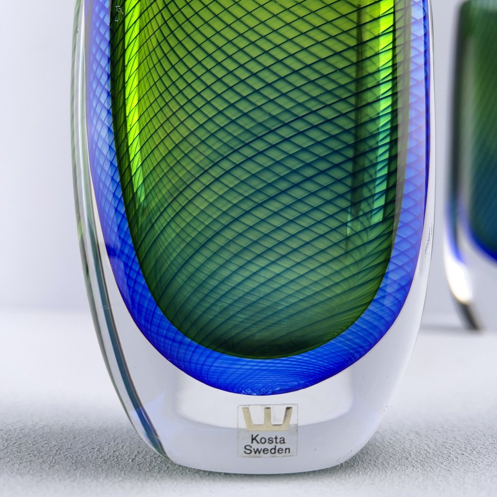 In 1942, Lindstrand left Orrefors to work for Uppsala-Ekeby, a ceramics manufacturer, where he designed groundbreaking pieces with simple lines and strong expressions, such as his Vase in Ceramic (ca. 1950s). After a 10-year tenure with the firm, he entered employment with Kosta glassworks—according to legend, Lindstrand’s Orrefors contract stated he was not allowed to work in the glass industry for 10 years after leaving. At Kosta, Lindstrand designed art glass similar to his Orrefors oeuvre, but he employed more color; among his most well-known pieces are his Höst Vase and his Atlantis Vases (both ca. 1950s), which depicted fishnet lines next to people or schools of fish.