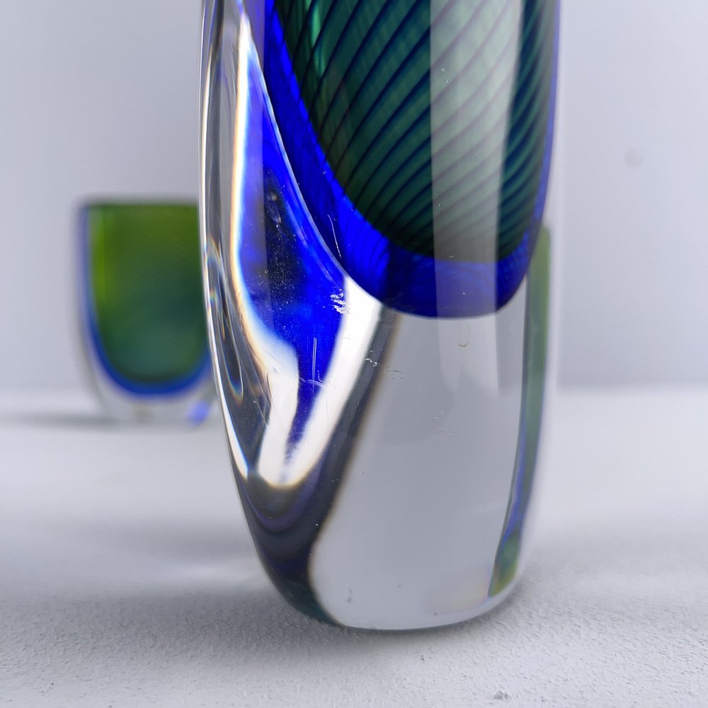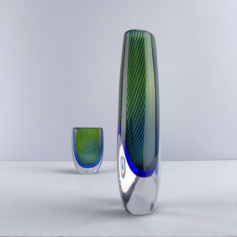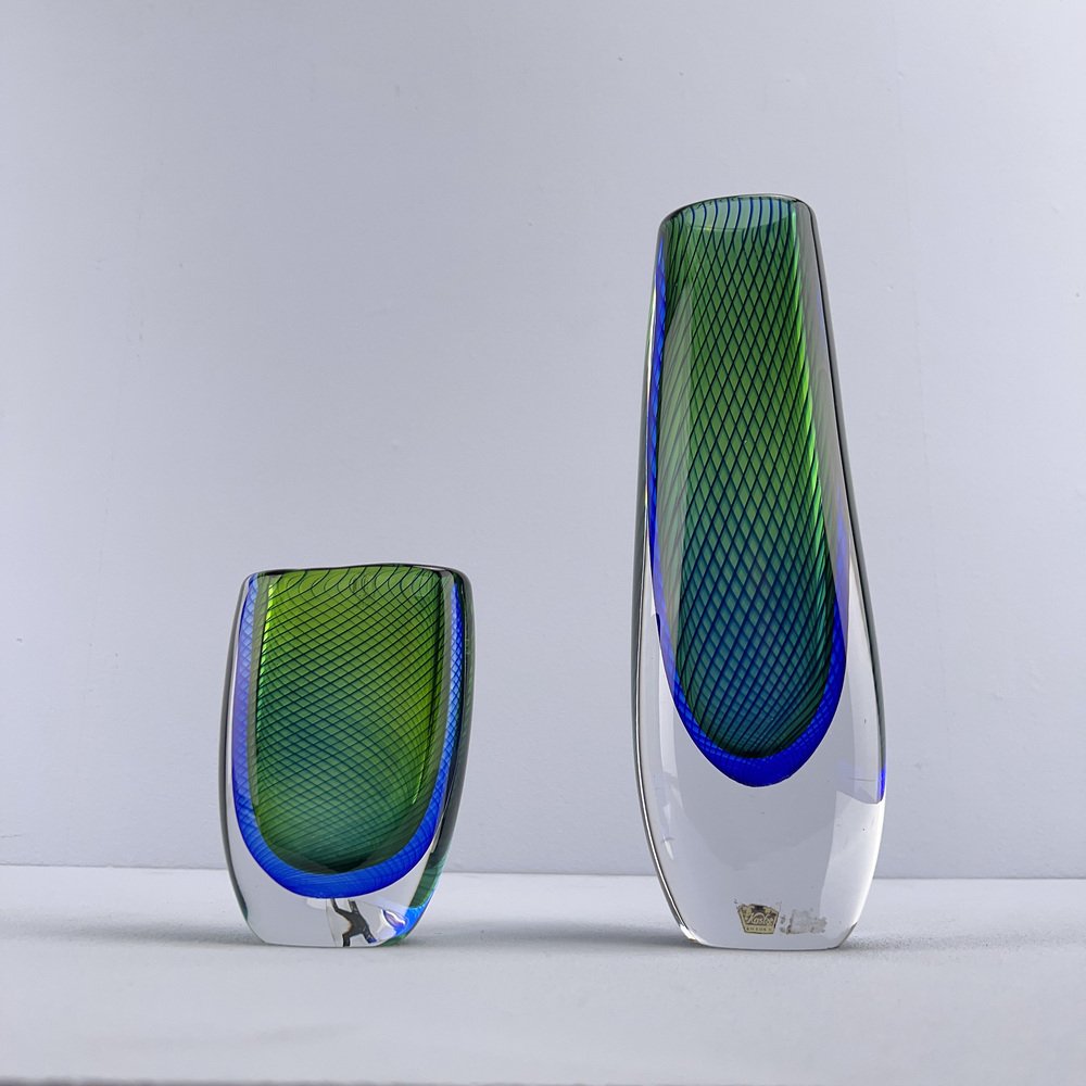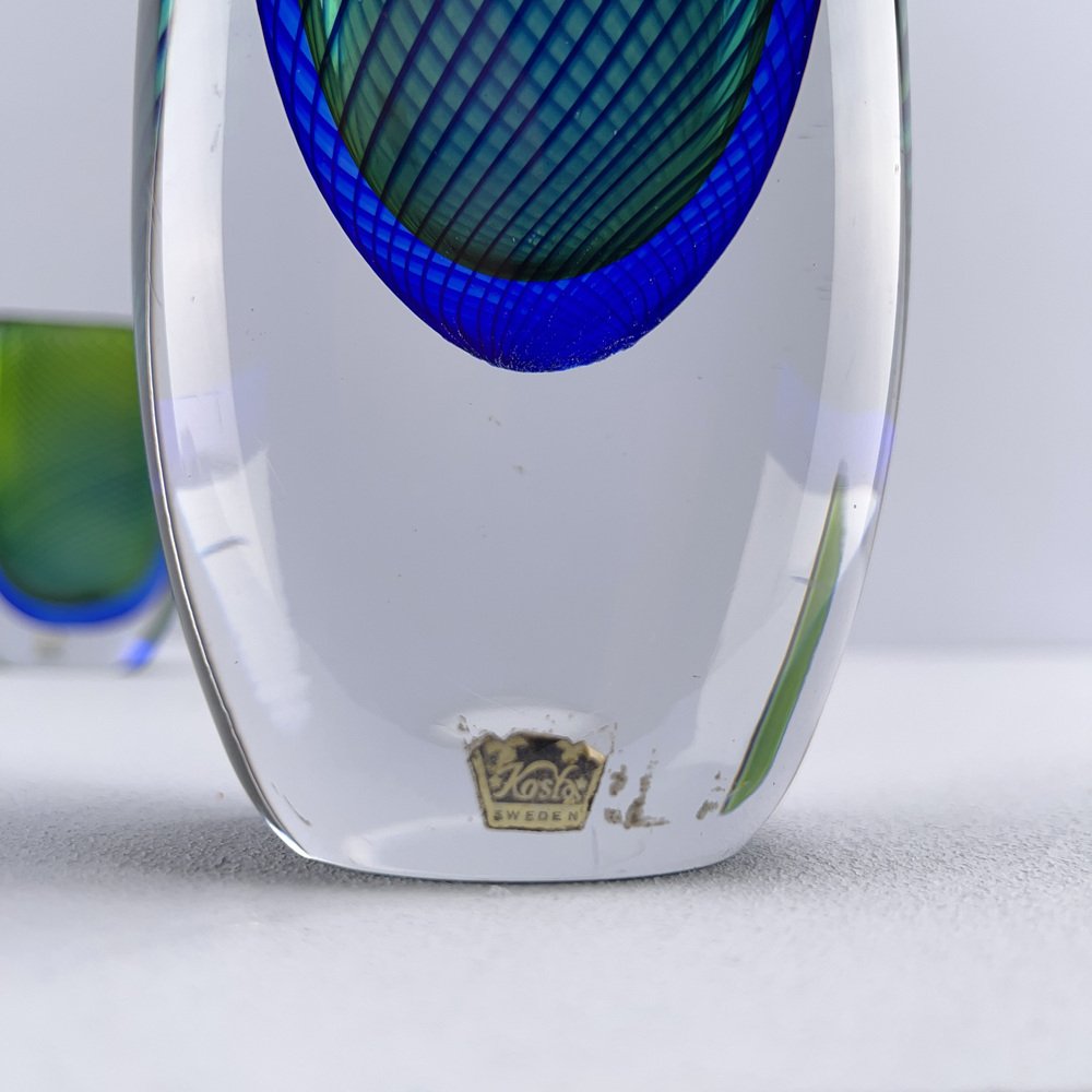 In 1942, Lindstrand left Orrefors to work for Uppsala-Ekeby, a ceramics manufacturer, where he designed groundbreaking pieces with simple lines and strong expressions, such as his Vase in Ceramic (ca. 1950s). After a 10-year tenure with the firm, he entered employment with Kosta glassworks—according to legend, Lindstrand’s Orrefors contract stated he was not allowed to work in the glass industry for 10 years after leaving. At Kosta, Lindstrand designed art glass similar to his Orrefors oeuvre, but he employed more color; among his most well-known pieces are his Höst Vase and his Atlantis Vases (both ca. 1950s), which depicted fishnet lines next to people or schools of fish.