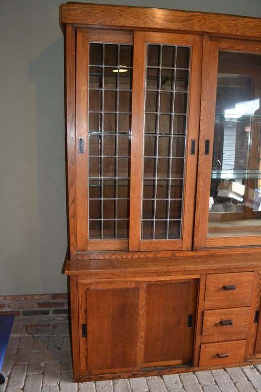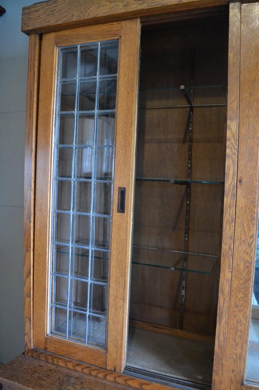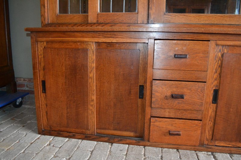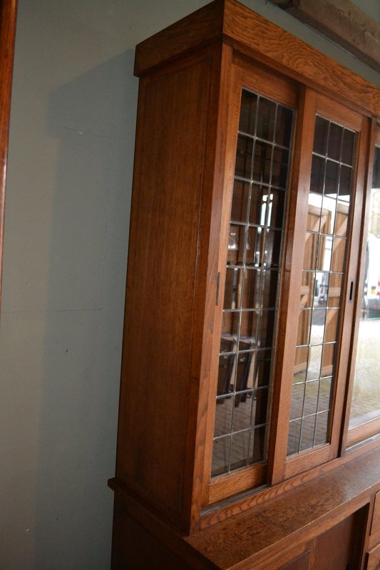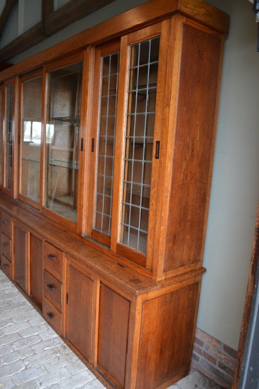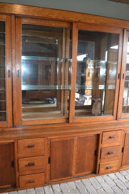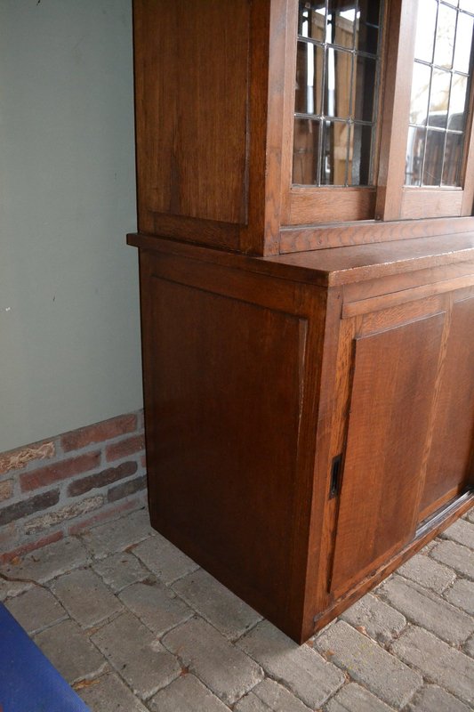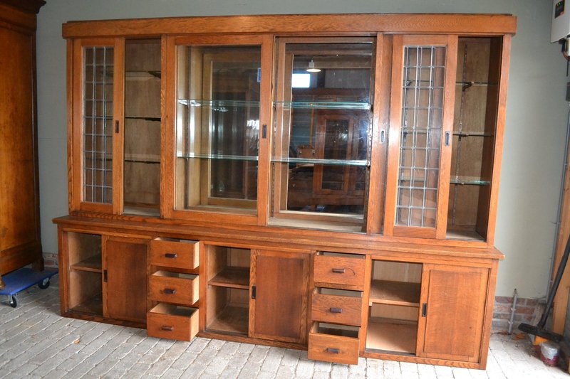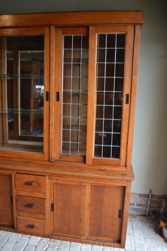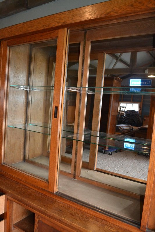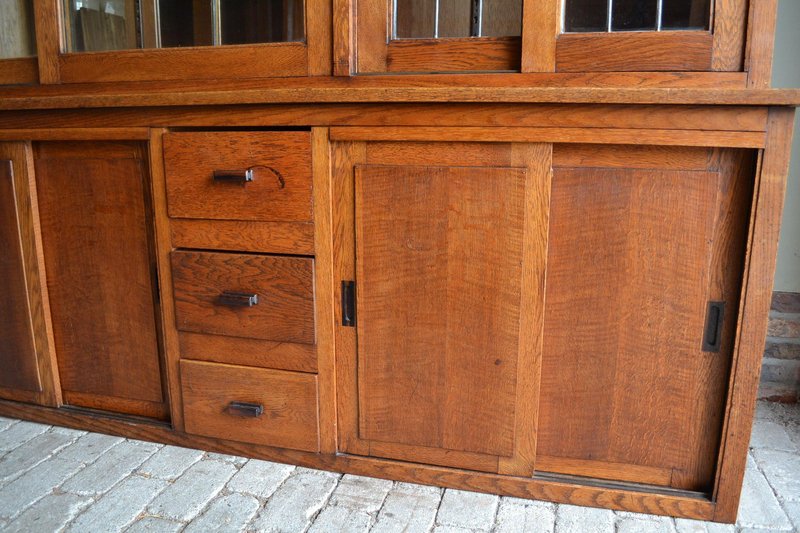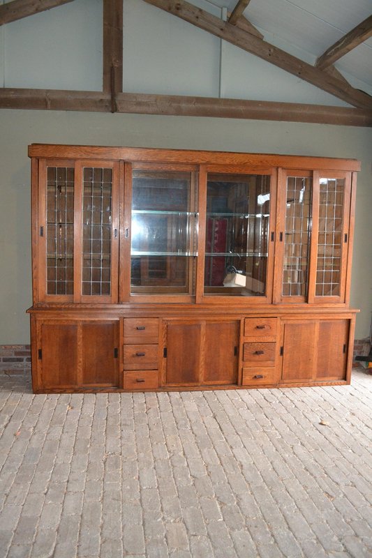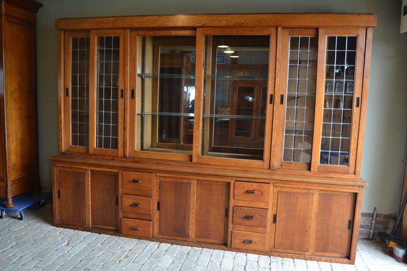 20th-century Dutch oak display cabinet, shop cabinet, china cabinet, bookcase, or library cabinet. The height is 217 cm. The width is 305 cm. The bottom depth is 55 cm. The top depth is 38 cm. Can be transported in two parts. Behind the six glazed doors are glass shelves. A mirror is located at the top, centered against the back wall. The two doors on the left and right have stained glass. Sliding doors are located at the top and bottom. Below, behind the sliding doors, are shelves. from approximately 1920. Antique cabinets -