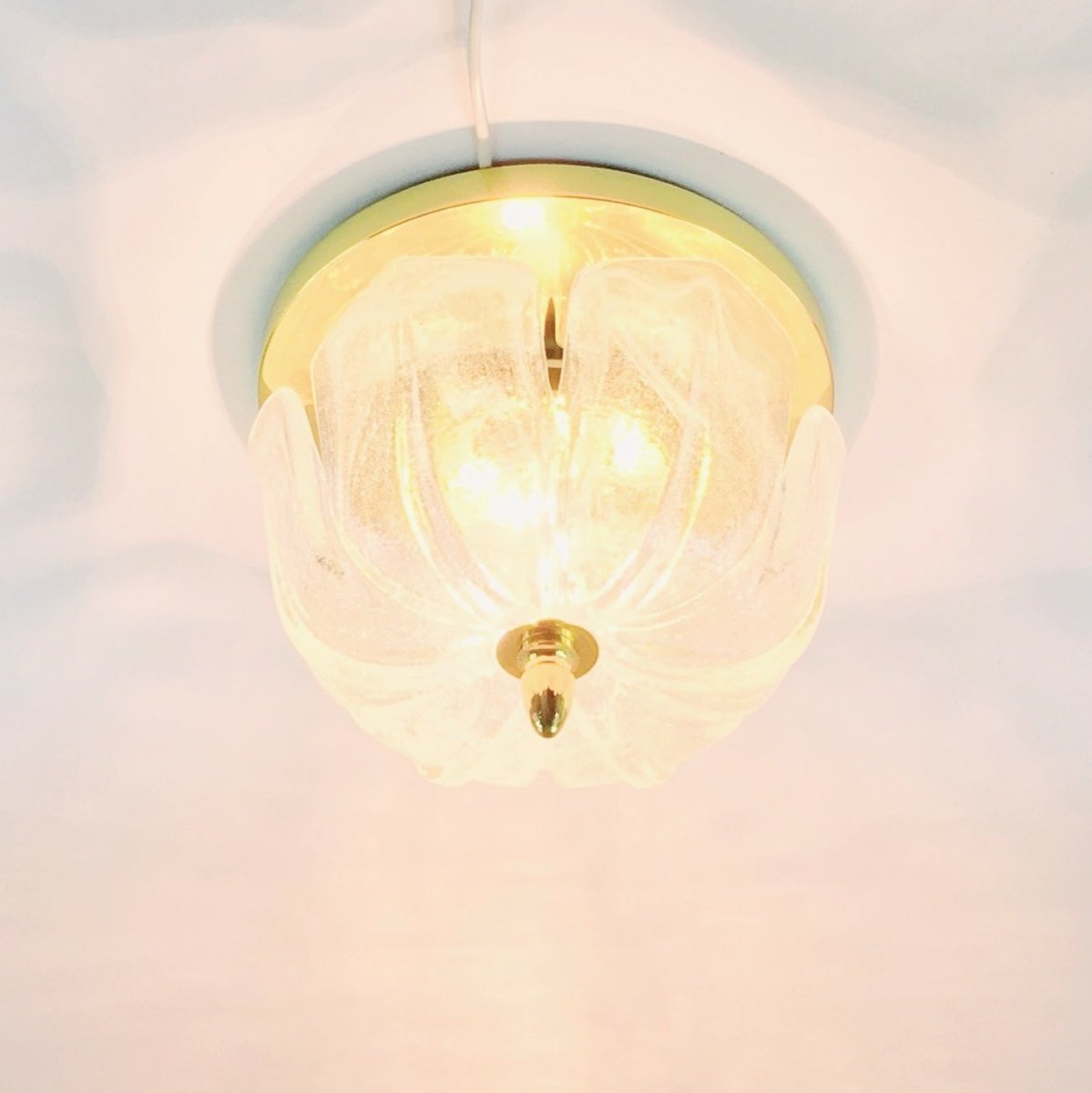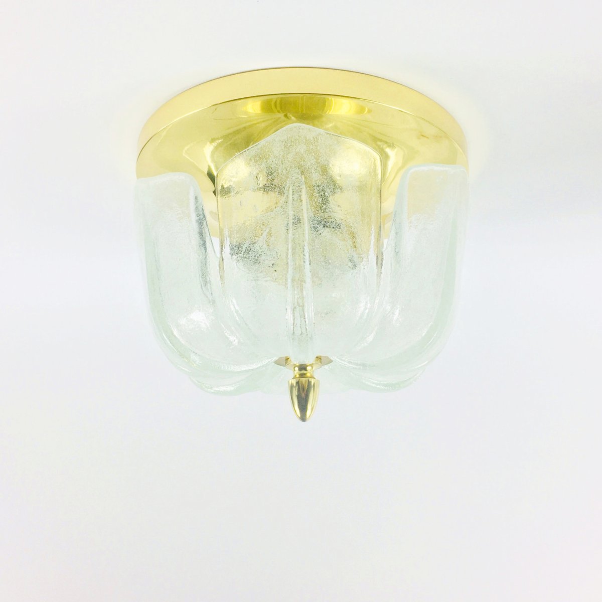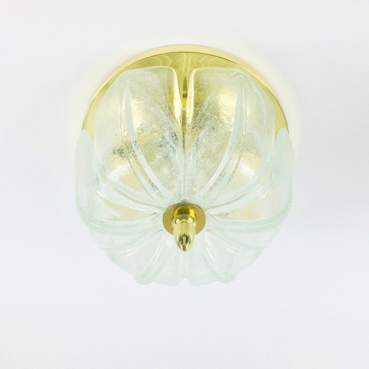 Mid-century modern flower shaped glass ceiling mount fixture by Limburg (Germany, 1960s/1970s). Thick textured glass on polished brass base. Spreads a wonderful light (see pictures). Beautiful design and high quality. Quite rare, the smaller models requiring only 1 bulb are much more common. Original label intact.