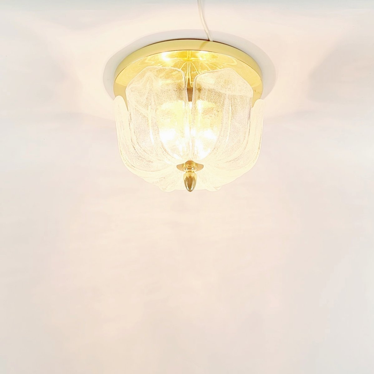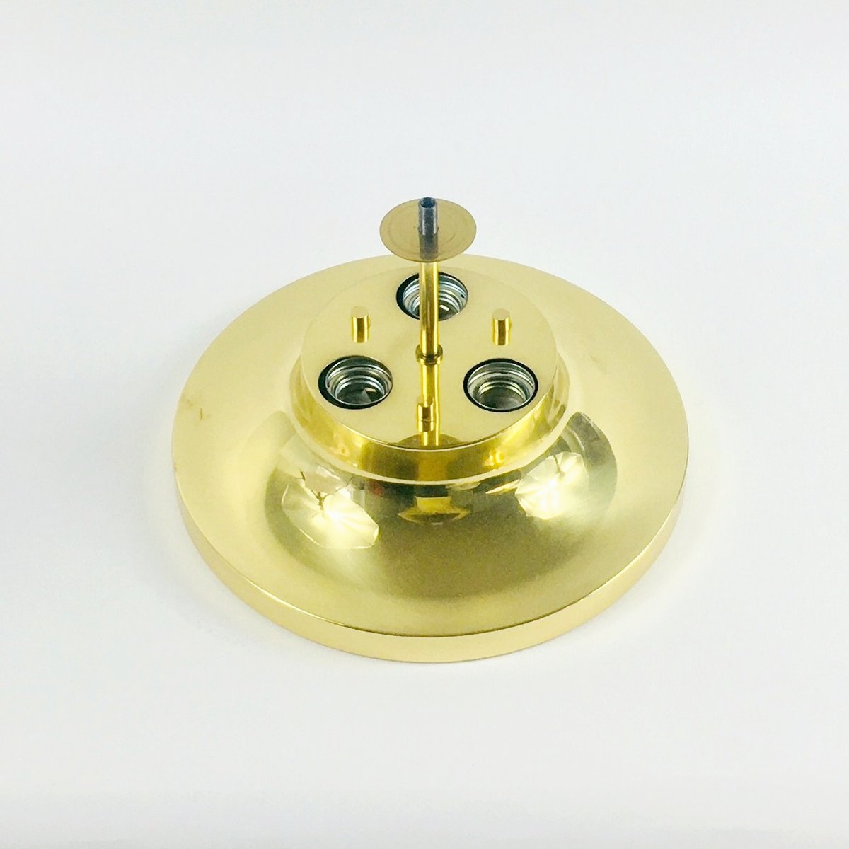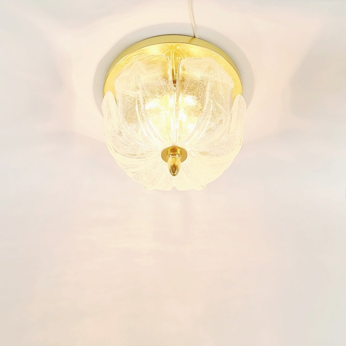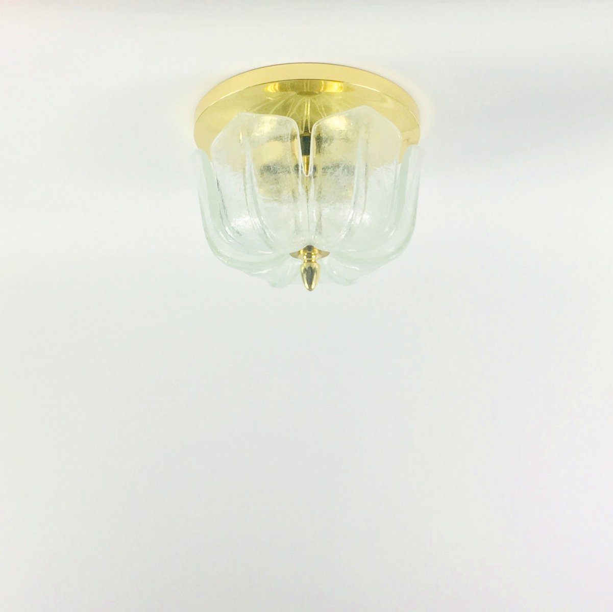 Mid-century modern flower shaped glass ceiling mount fixture by Limburg (Germany, 1960s/1970s). Thick textured glass on polished brass base. Spreads a wonderful light (see pictures). Beautiful design and high quality. Quite rare, the smaller models requiring only 1 bulb are much more common. Original label intact.