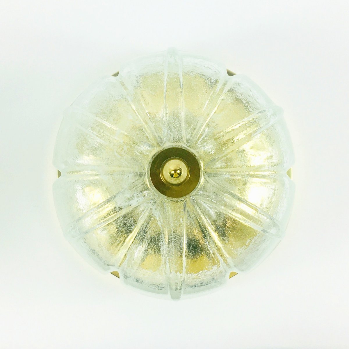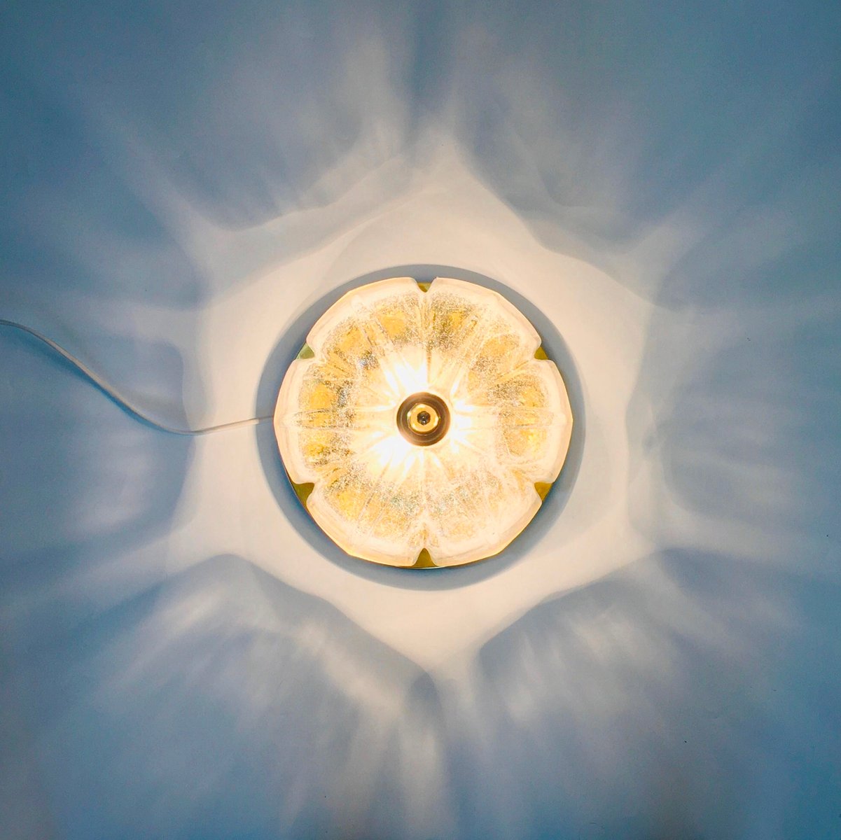 Blumenförmige Deckenleuchte aus Glas von Limburg (Deutschland, 1960er/1970er Jahre) aus der Mitte des Jahrhunderts. Dickes, strukturiertes Glas auf poliertem Messingsockel. Verbreitet ein wunderbares Licht (siehe Bilder). Schönes Design und hohe Qualität. Ziemlich selten, die kleineren Modelle, die nur 1 Glühbirne benötigen, sind viel häufiger. Das Originaletikett ist intakt.