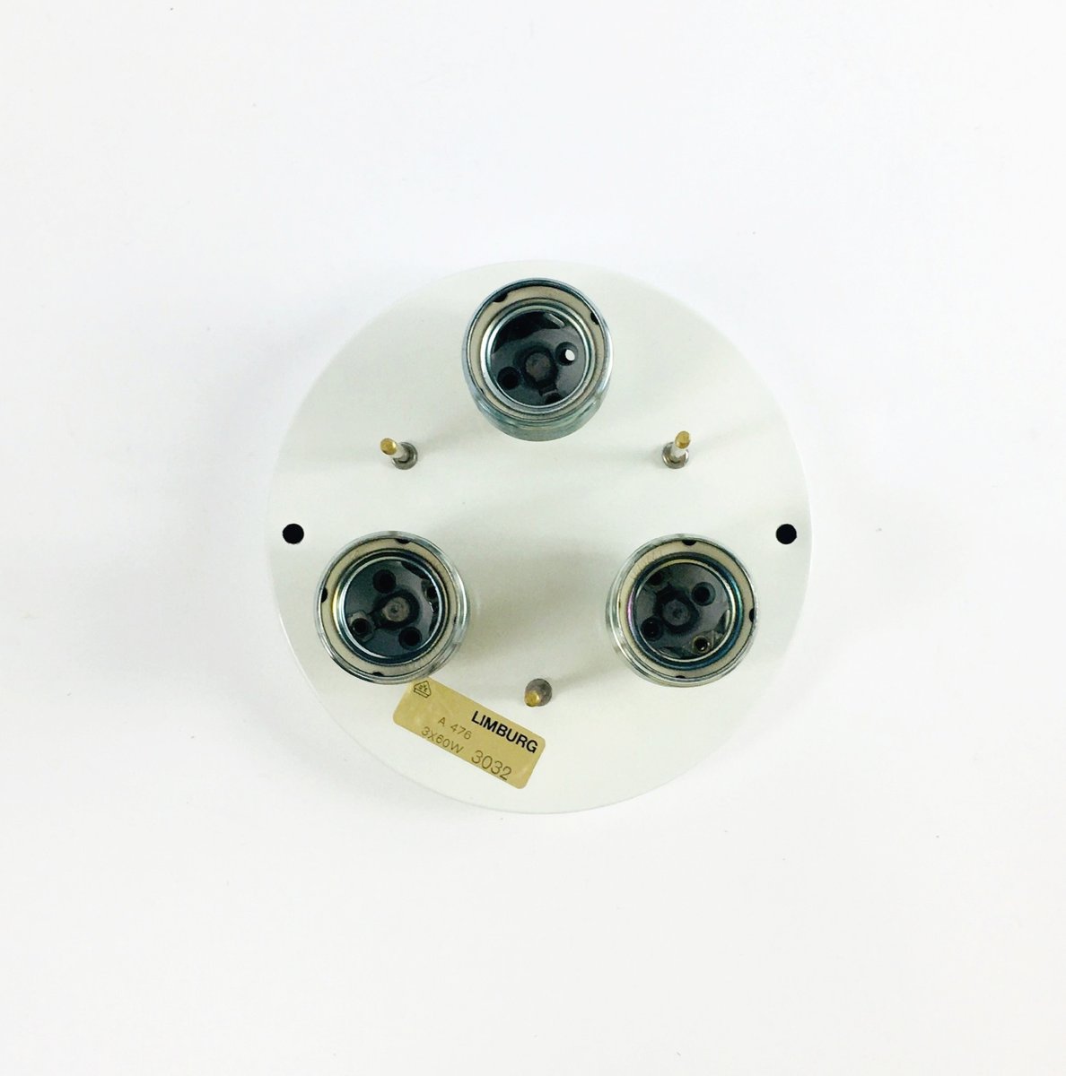 Re-wired (hardwired) and ready to use (compatible in Europe, US, UK, etc.). Requires three E27 light bulbs (E26 in the US), max 60W each. LED compatible. Diameter: 29 cm/11.4''; height (from ceiling): 23 cm/9''. Excellent vintage condition.