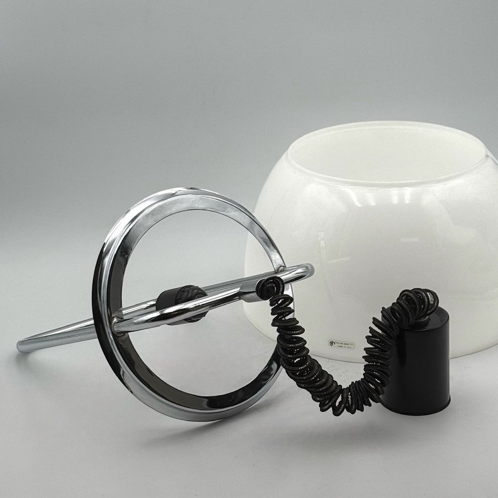 This Guzzini 70s pendant lamp embodies the refinement of Italian lighting design. Its white methacrylate shade diffuses light with a soft, inviting glow, creating a serene and sophisticated ambiance. The smooth curvature of the diffuser enhances its sculptural presence, while the chrome-plated metal structure provides a polished, modern contrast.
