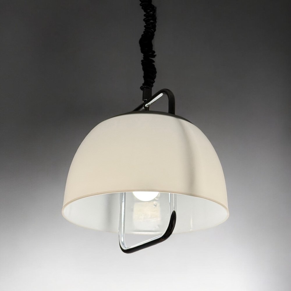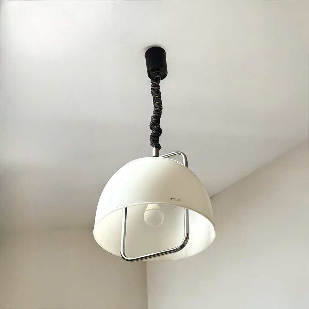 Diese Pendelleuchte von Guzzini aus den 70er Jahren verkörpert die Raffinesse des italienischen Lichtdesigns. Ihr weißer Methacrylat-Schirm streut das Licht mit einem weichen, einladenden Schein und schafft so eine ruhige und elegante Atmosphäre. Die sanfte Wölbung des Diffusors unterstreicht seine skulpturale Präsenz, während die verchromte Metallstruktur einen polierten, modernen Kontrast bildet. Original „Rolli”-Patentdesign, Seilzug und Bakelit-E27-Fassung.