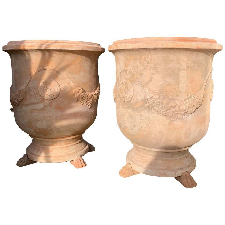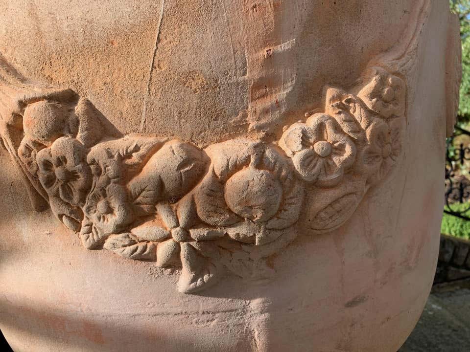 A pair of 20th century large handmade terracotta pots. The very best handmade terracotta pots from Tuscany. Vaso festonato. Superb pots. These are big and handmade. The most famous kind of Tuscan terracotta is produced in Impruneta, an ancient town a little south of Florence. The tradition of making terracotta in this area goes back to the 14th century and its production has progressively impacted on the area’s landscape, architecture, urban design and economy. The so-called cotto dell'Impruneta owes its success to the peculiar properties of the clay found in the area, which is rich in iron, extremely malleable and both elastic and resistant. The clay comes from Impruneta and surroundings, for example from the smaller villages of Ferrone and Tavarnuzze and from the Val di Greve area. The most common terracotta products that are made here are vases, pots and statues, many large and small orci, which is the Italian for a peculiar kind of terracotta vase. Also traditionally produced and used to carry high quality olive oil and wine (also produced in the region). H 33 in. x Dm 27.5 in. H 83.82 cm x Dm 69.85 cm