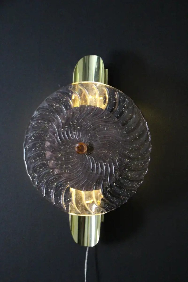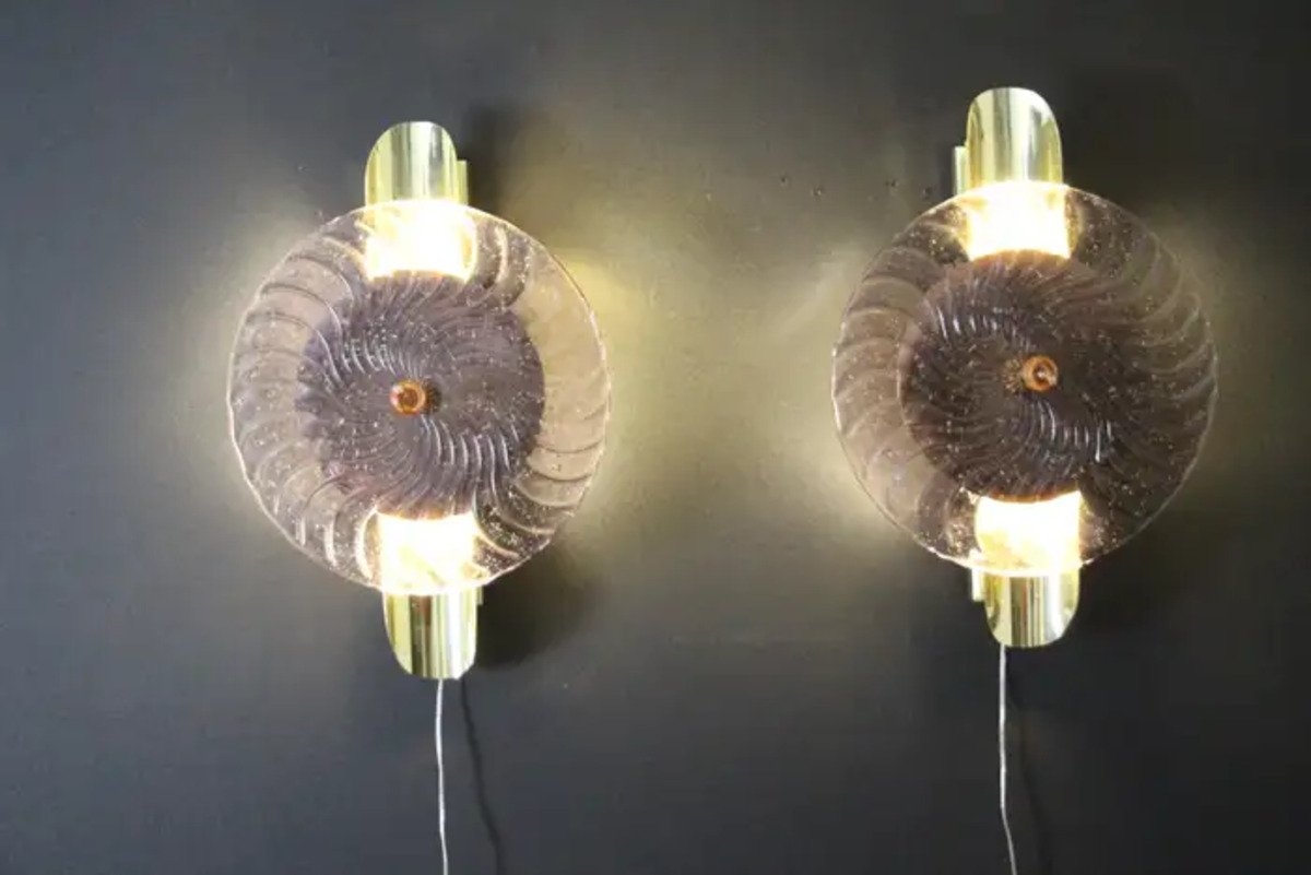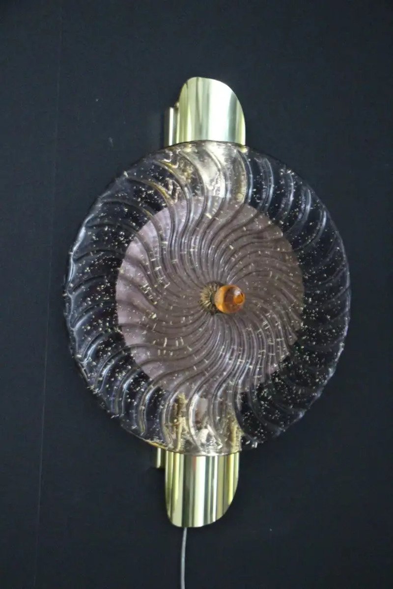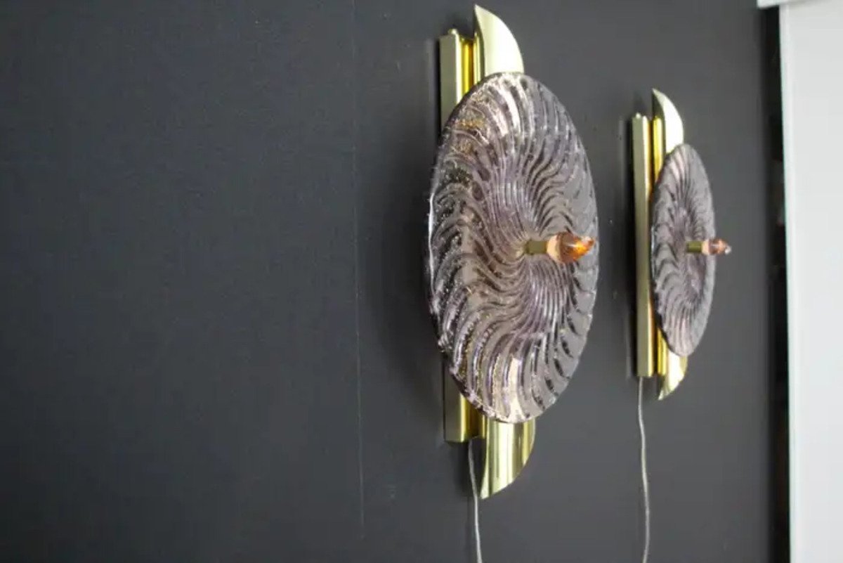 This striking pair of wall lamps is made of textured pink-purple Murano glass disk worked like a spiral swirled, put on a textured brass plate to produce this exceptional effect of changing color between pink, purple and gold . This work of art reaches a high quality mother of pearl iridescence that catches the light. These sconces look like organic lit sculptures with an Art Deco or Mid Century Style, that can be used as wall decoration and sconces . They are mounted on a hand made brass structure, containing 2 G9 bulbs each, decorated with half tubes rods . Light shines through the glass disc and all around and produces an enchanting ambient illumination.