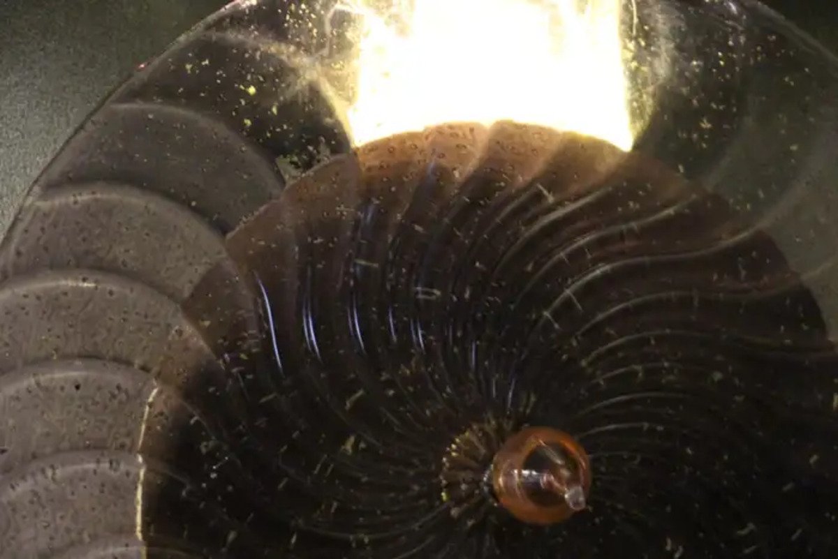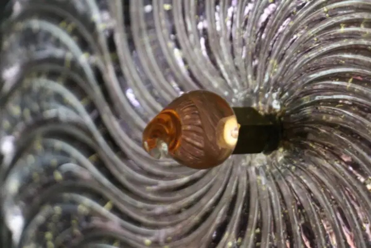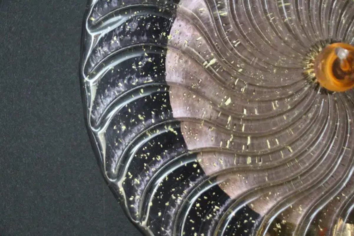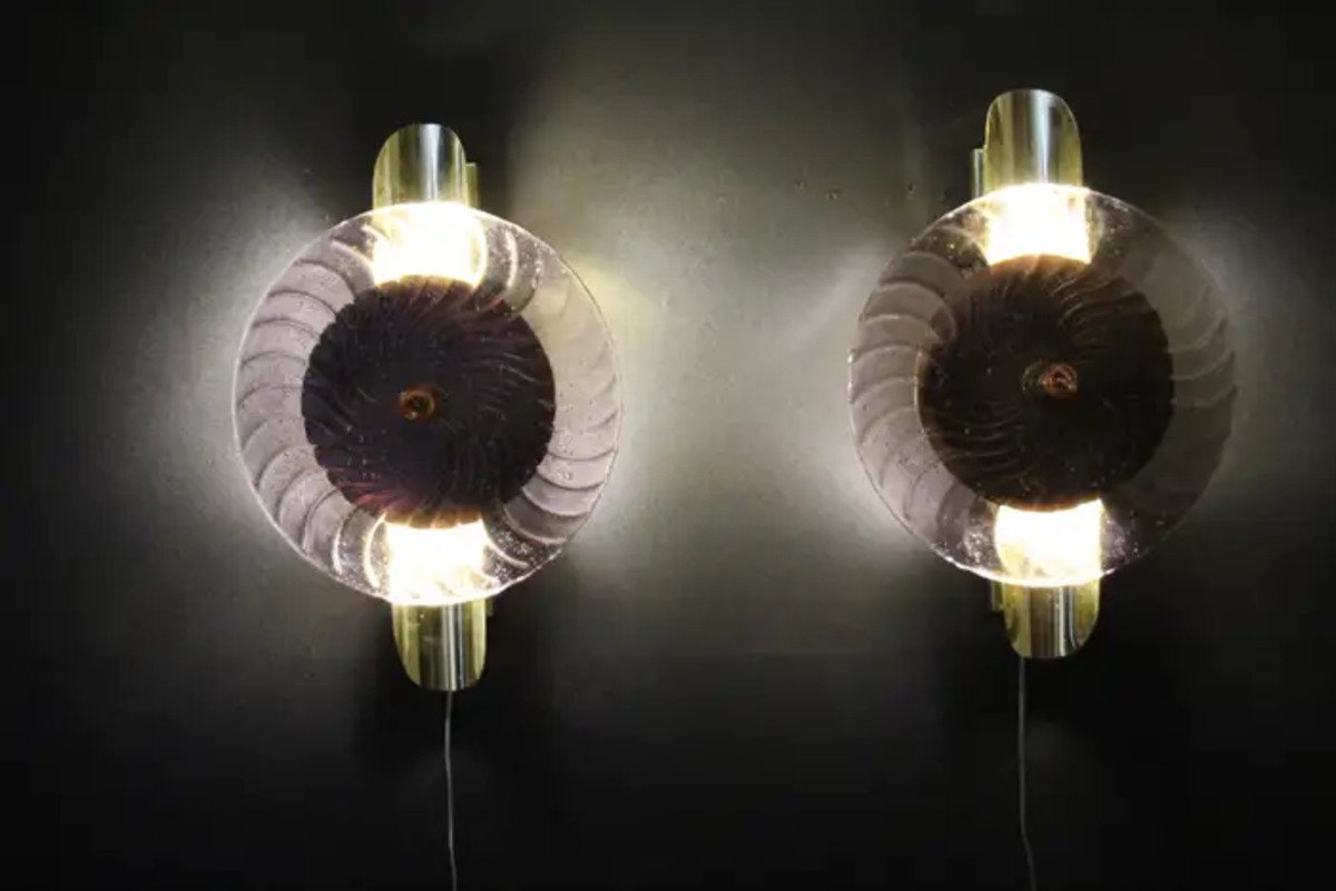 This striking pair of wall lamps is made of textured pink-purple Murano glass disk worked like a spiral swirled, put on a textured brass plate to produce this exceptional effect of changing color between pink, purple and gold . This work of art reaches a high quality mother of pearl iridescence that catches the light. These sconces look like organic lit sculptures with an Art Deco or Mid Century Style, that can be used as wall decoration and sconces . They are mounted on a hand made brass structure, containing 2 G9 bulbs each, decorated with half tubes rods . Light shines through the glass disc and all around and produces an enchanting ambient illumination.