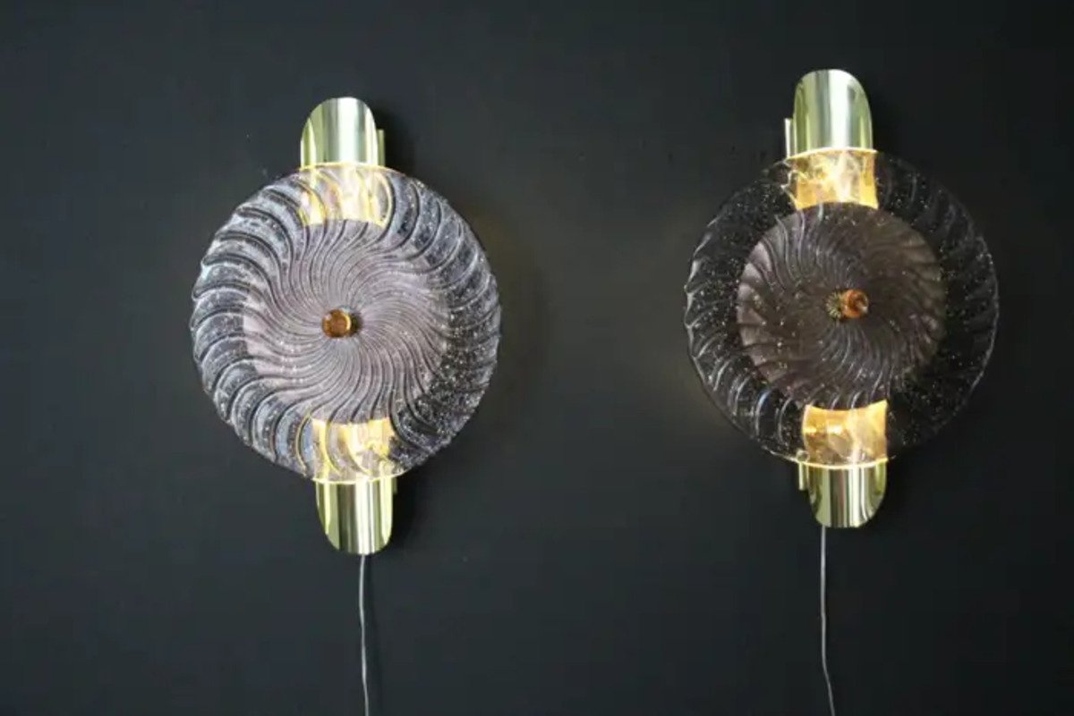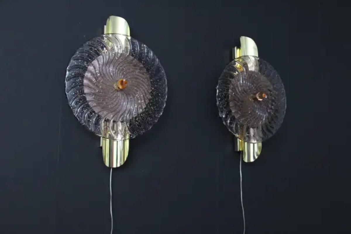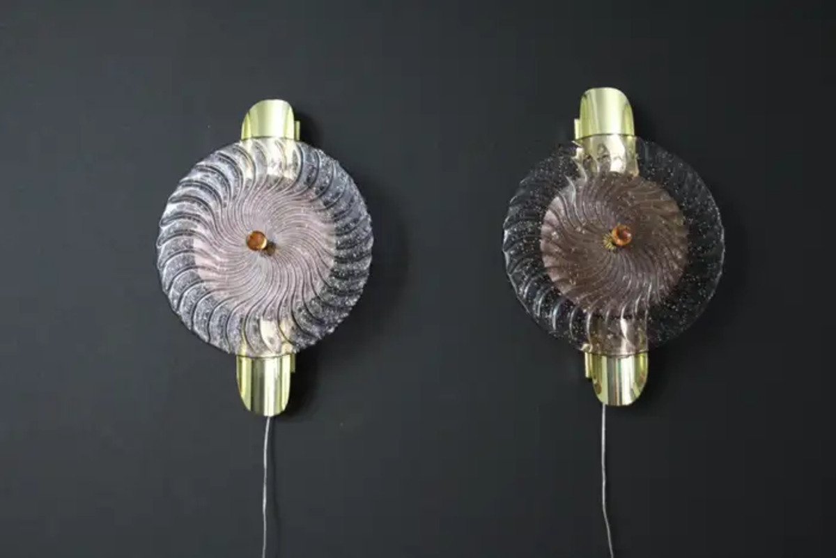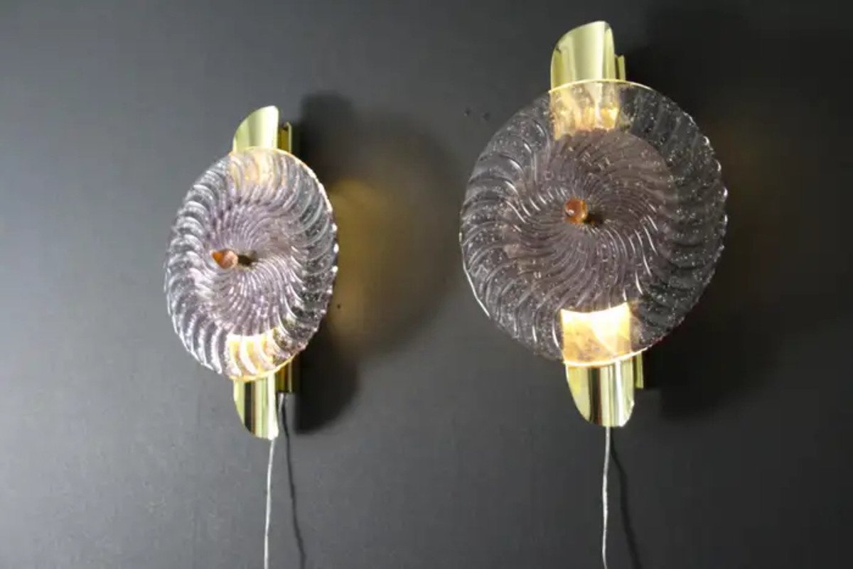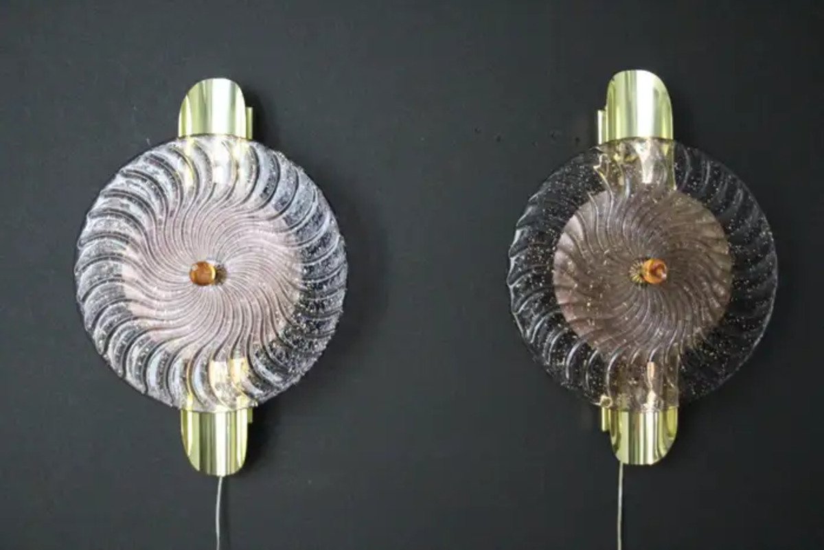 Dieses auffallende Paar Wandlampen ist aus strukturierten rosa-lila Murano-Glasscheibe gearbeitet wie eine Spirale gewirbelt, auf einer strukturierten Messingplatte setzen, um diesen außergewöhnlichen Effekt der wechselnden Farbe zwischen rosa, lila und gold zu produzieren. Dieses Kunstwerk erreicht eine hohe Qualität Perlmutt schillert, dass das Licht fängt. Diese Wandleuchter sehen aus wie organisch beleuchtete Skulpturen im Art Deco oder Mid Century Stil, die als Wanddekoration und Wandleuchter verwendet werden können. Sie sind auf einer handgefertigten Messingstruktur montiert, die jeweils 2 G9-Glühbirnen enthält, die mit Halbrohrstäben verziert sind. Das Licht scheint durch die Glasscheibe und rundherum und erzeugt eine bezaubernde Raumbeleuchtung.