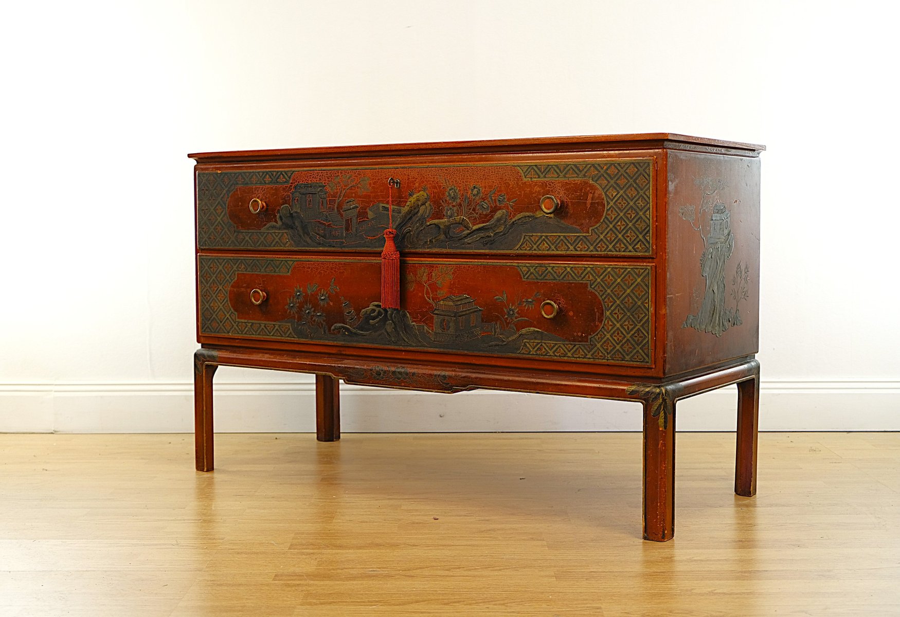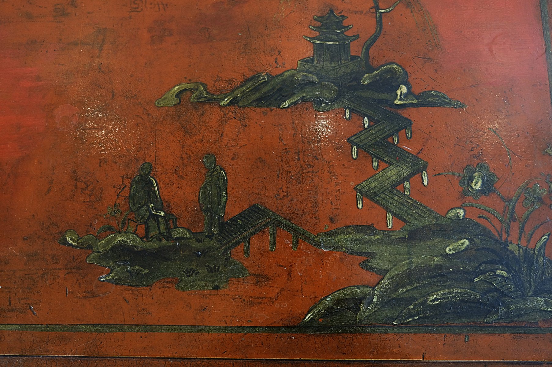 Große Truhe mit Handbemaltem Roten, Gold & Bronze Chinoiserie Motiv, Schweden, 1920er