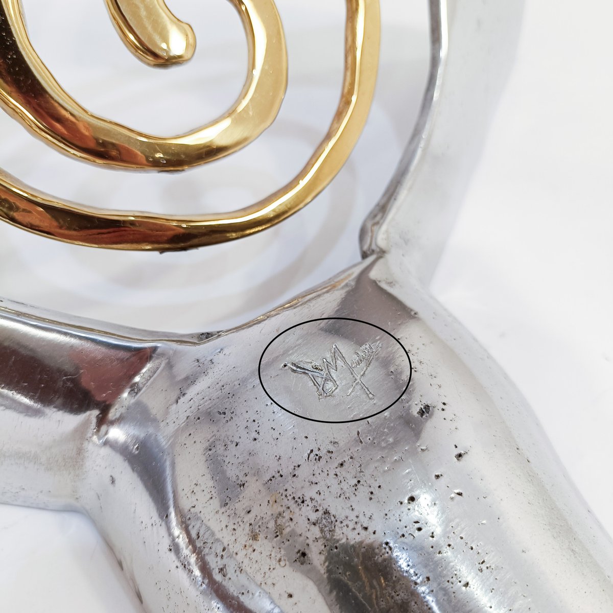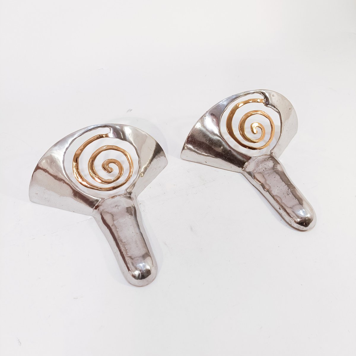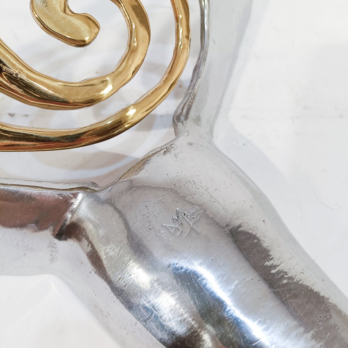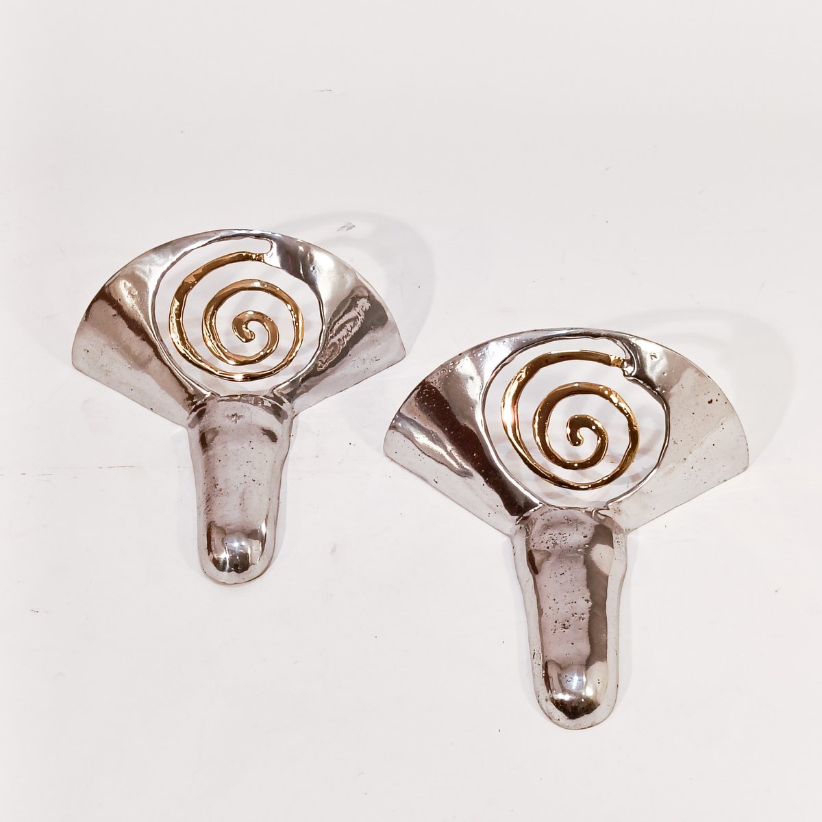 Set of two huge wall sconces by David Marshall, Spain, 1970s. Set of two extraordinary brutalist wall sconces made and signed (see photos) by David Marshall. Cup-shaped body and made of aluminum and golden brass. Each piece has two rear anchors (one of them missing, but easily repairable, see photos). These wall lights can be placed on the wall without electrical installation as decorative elements, or installed in a wall light point to create a unique lighting effect. Very much in the style of the brutalist creations of the 70s by the Spanish designer Alfonso Márquez. Very rare, collectible pieces.