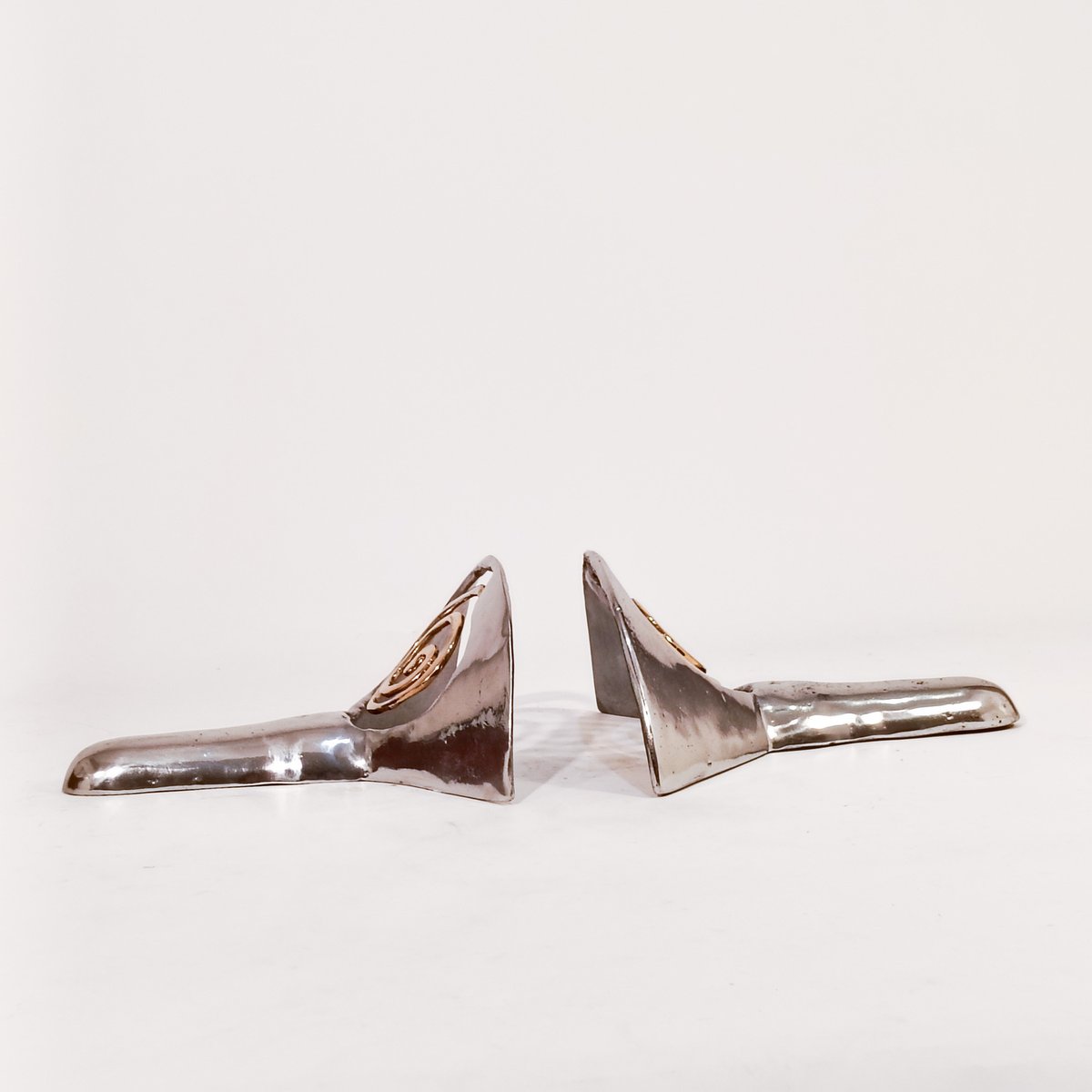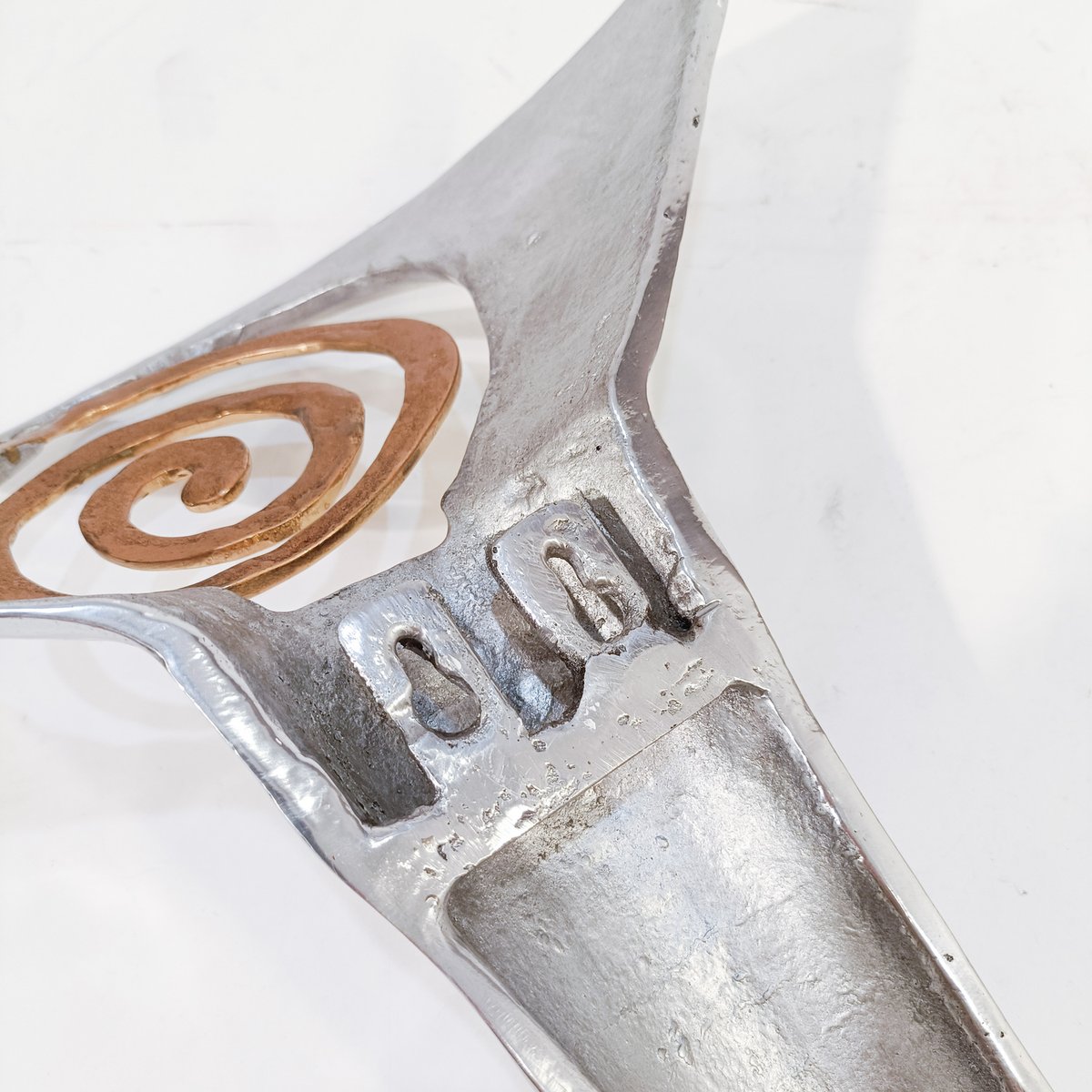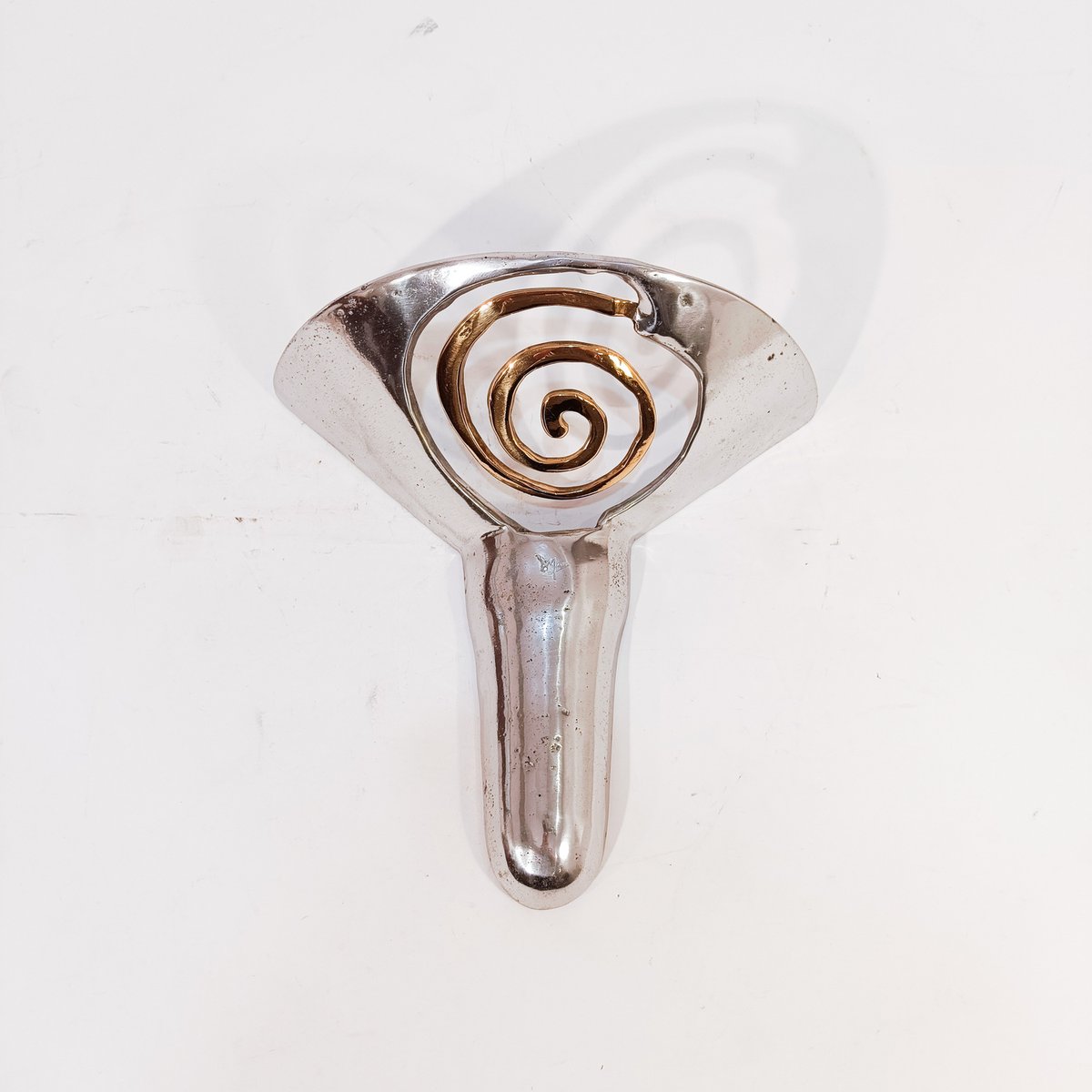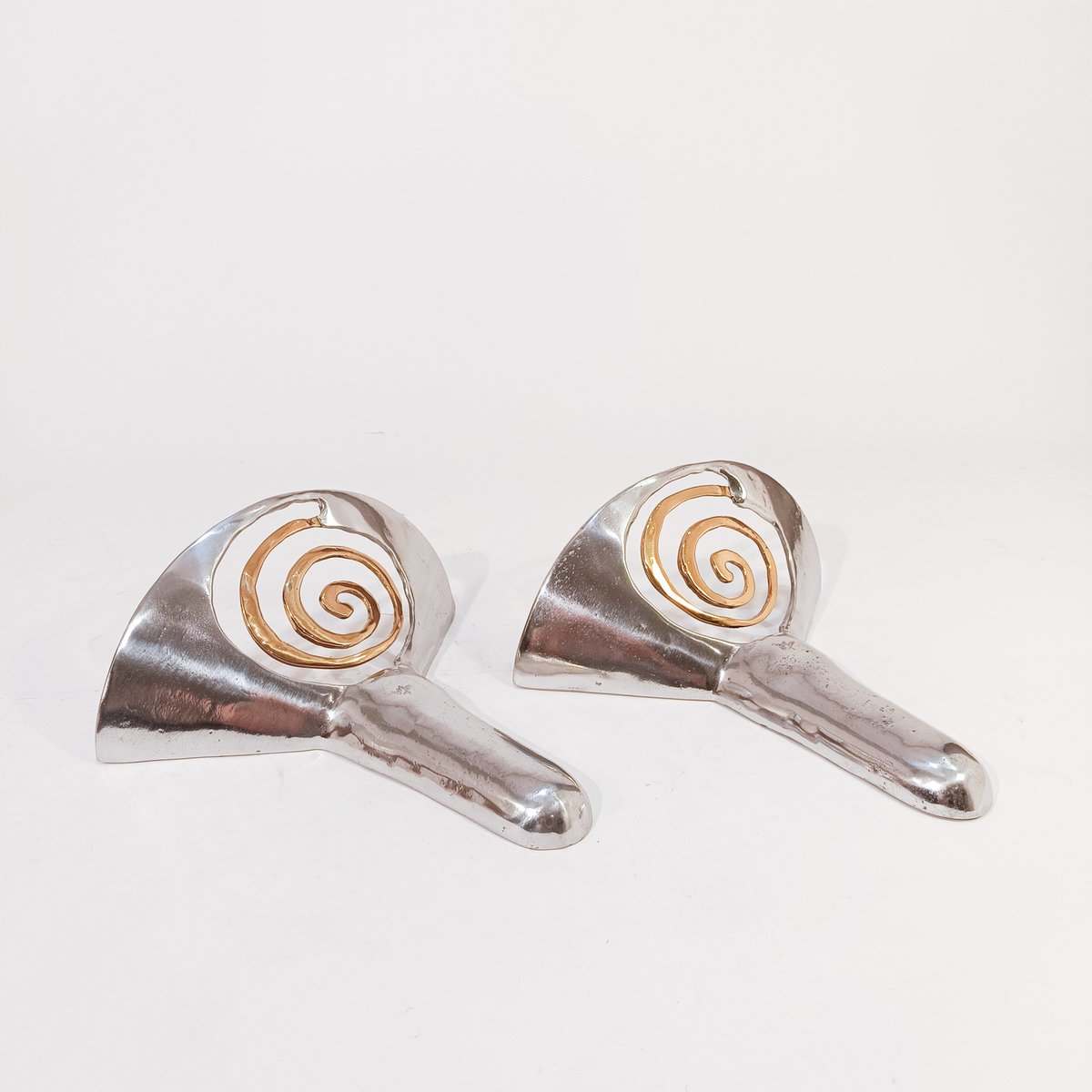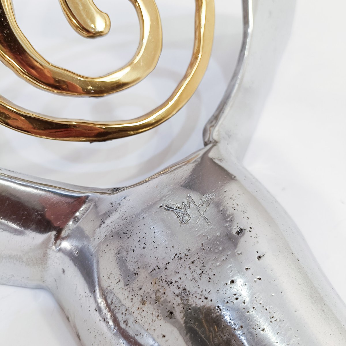 Set of two huge wall sconces by David Marshall, Spain, 1970s. Set of two extraordinary brutalist wall sconces made and signed (see photos) by David Marshall. Cup-shaped body and made of aluminum and golden brass. Each piece has two rear anchors (one of them missing, but easily repairable, see photos). These wall lights can be placed on the wall without electrical installation as decorative elements, or installed in a wall light point to create a unique lighting effect. Very much in the style of the brutalist creations of the 70s by the Spanish designer Alfonso Márquez. Very rare, collectible pieces.