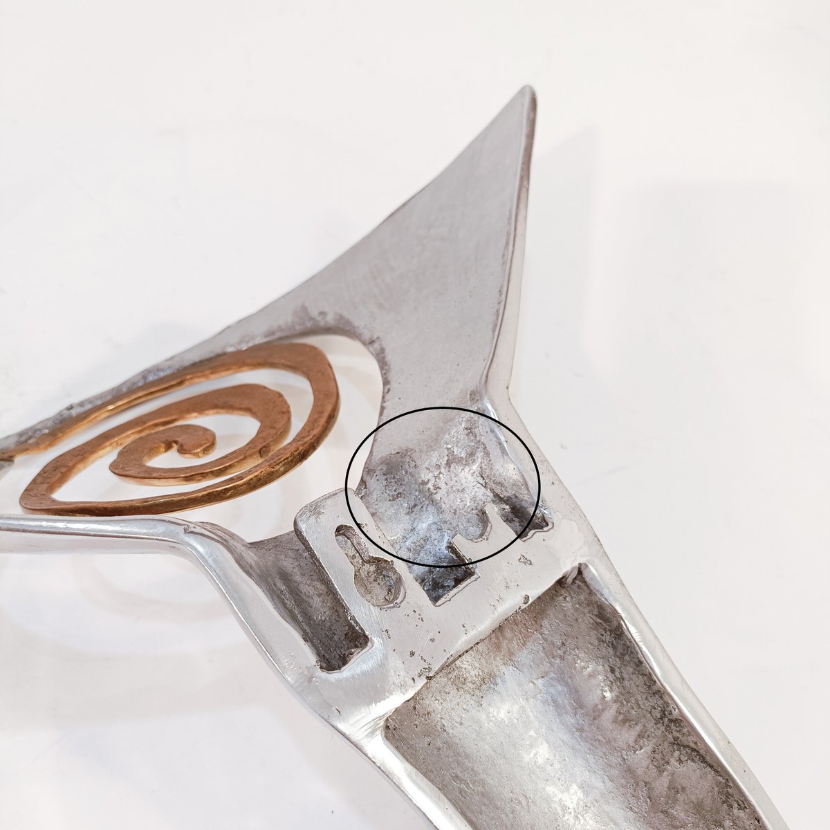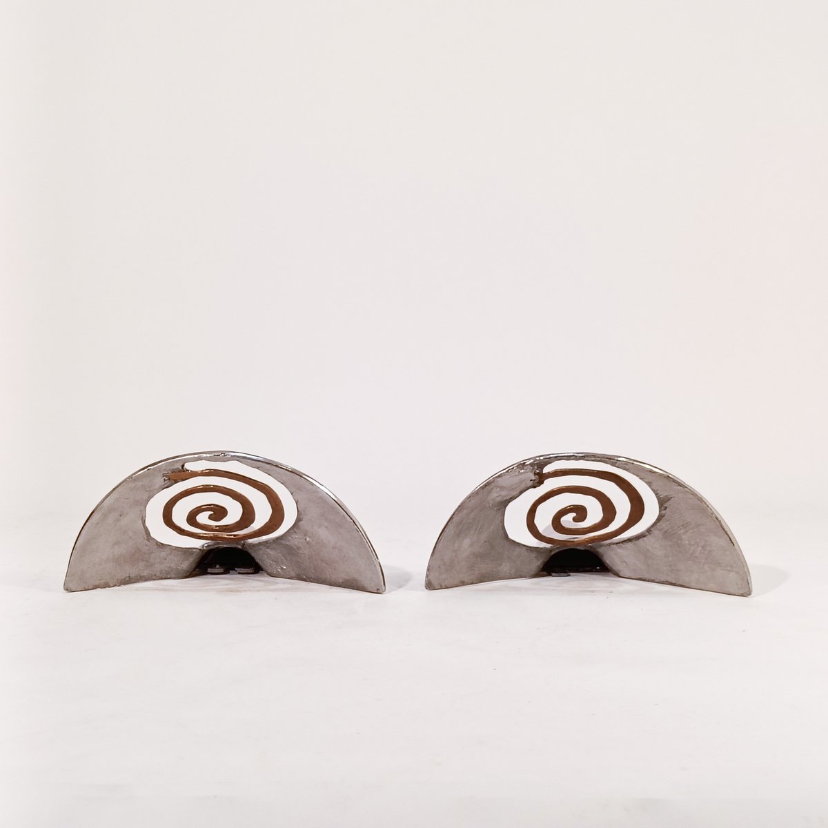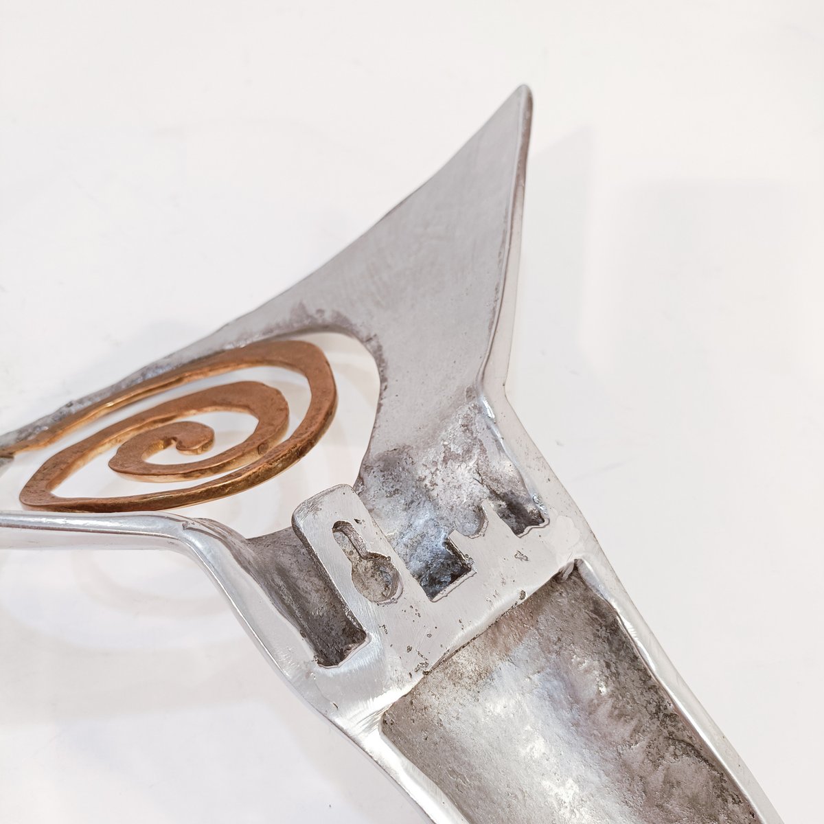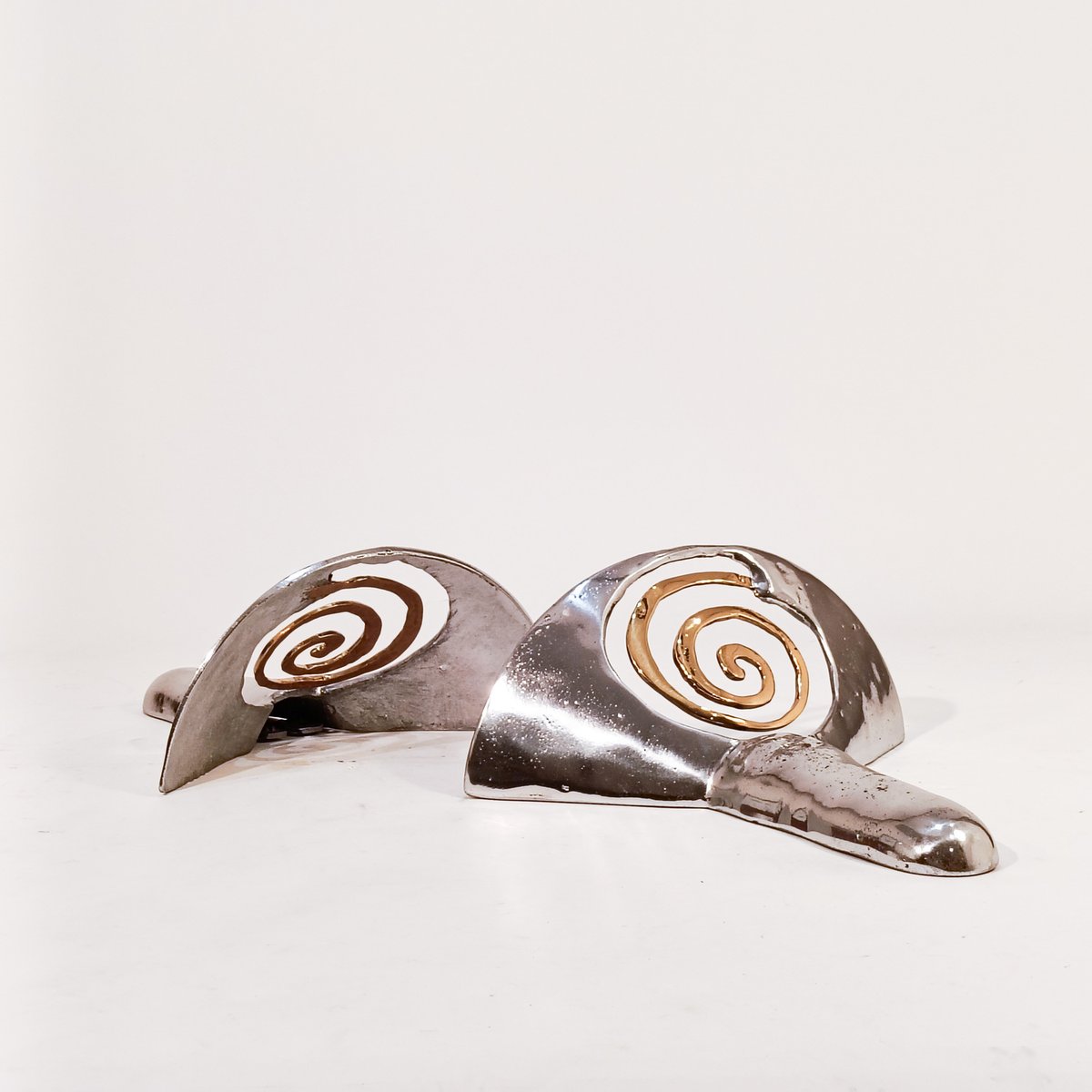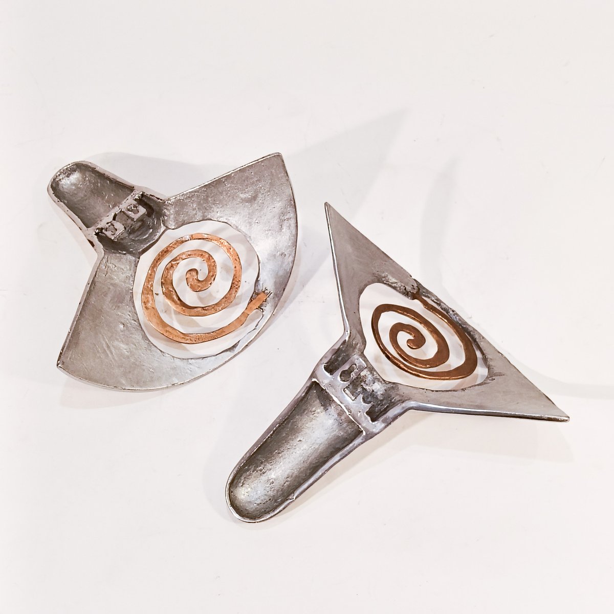 Set of two huge wall sconces by David Marshall, Spain, 1970s. Set of two extraordinary brutalist wall sconces made and signed (see photos) by David Marshall. Cup-shaped body and made of aluminum and golden brass. Each piece has two rear anchors (one of them missing, but easily repairable, see photos). These wall lights can be placed on the wall without electrical installation as decorative elements, or installed in a wall light point to create a unique lighting effect. Very much in the style of the brutalist creations of the 70s by the Spanish designer Alfonso Márquez. Very rare, collectible pieces.