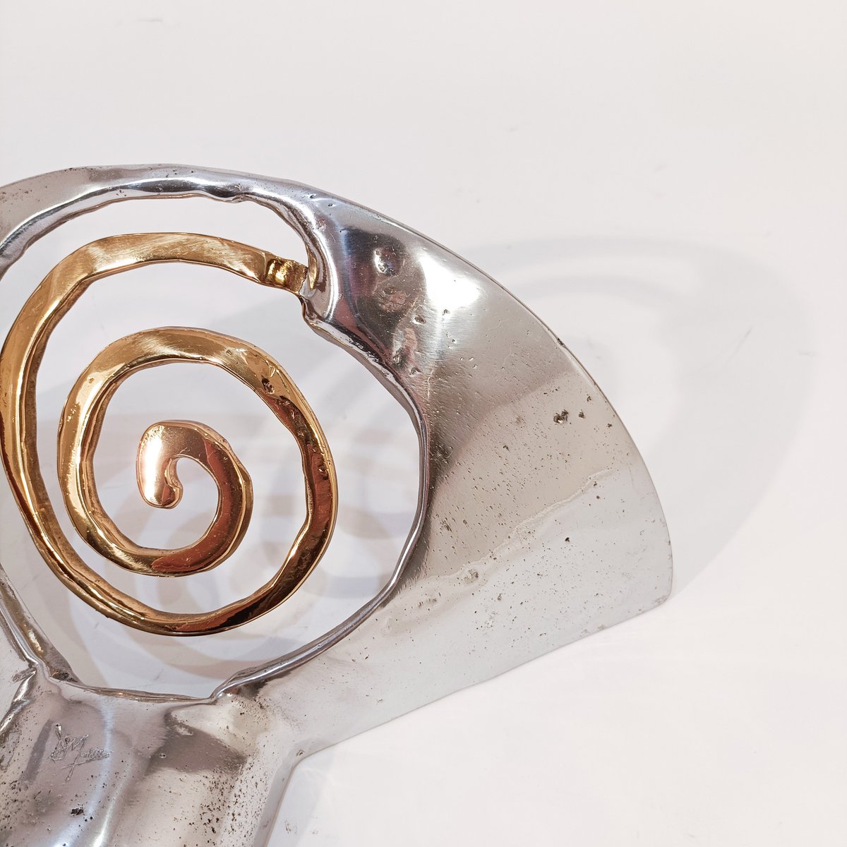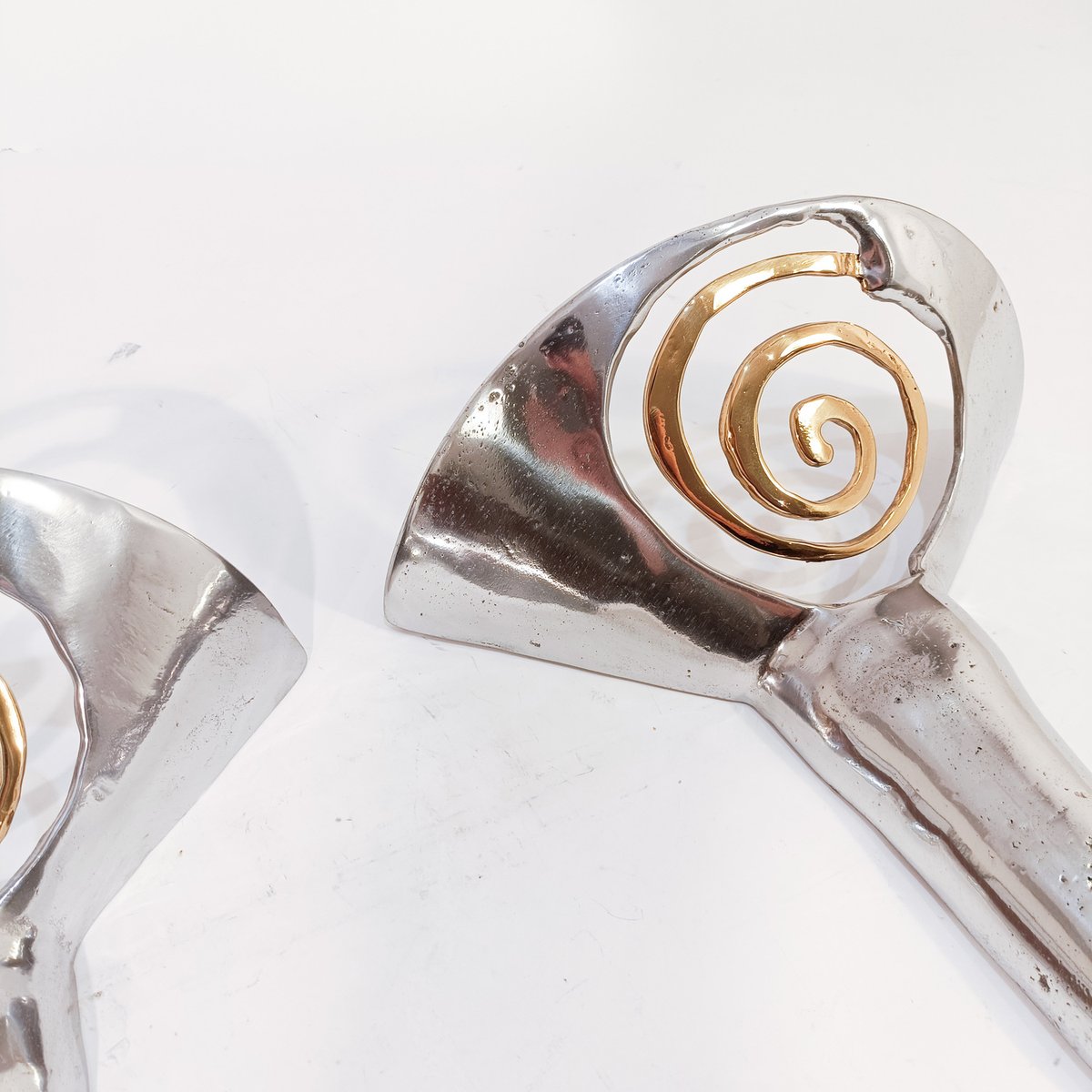 Satz von zwei großen Wandleuchtern von David Marshall, Spanien, 1970er Jahre. Satz von zwei außergewöhnlichen brutalistischen Wandleuchtern, hergestellt und signiert (siehe Fotos) von David Marshall. Becherförmiger Körper aus Aluminium und vergoldetem Messing. Jedes Stück hat zwei hintere Verankerungen (eine davon fehlt, ist aber leicht zu reparieren, siehe Fotos). Diese Wandleuchten können ohne elektrische Installation als dekorative Elemente an der Wand angebracht oder in einem Wandlichtpunkt installiert werden, um einen einzigartigen Lichteffekt zu erzielen. Ganz im Stil der brutalistischen Kreationen der 70er Jahre des spanischen Designers Alfonso Márquez. Sehr seltene, sammelbare Stücke.