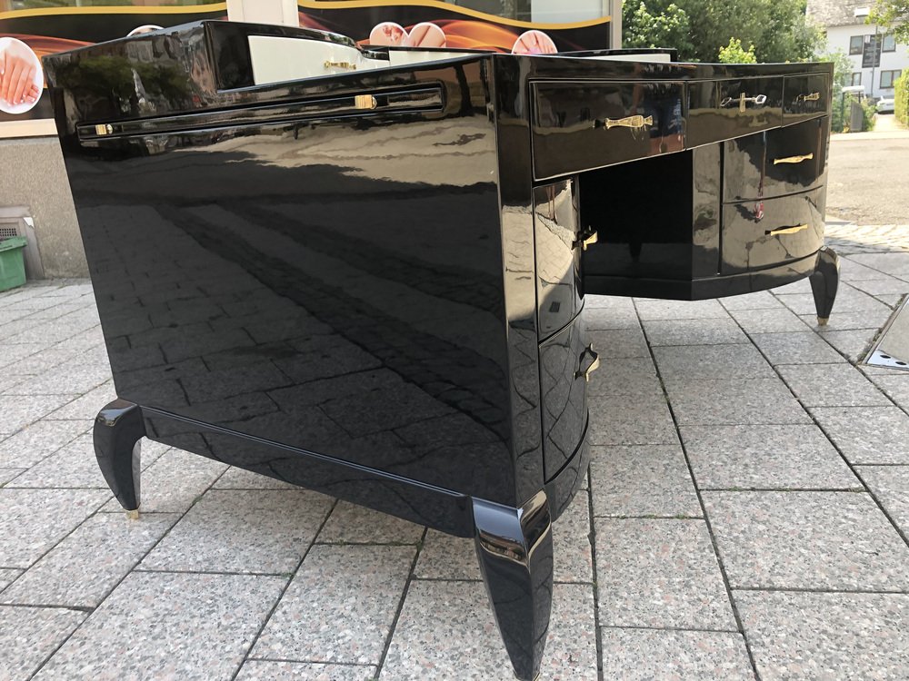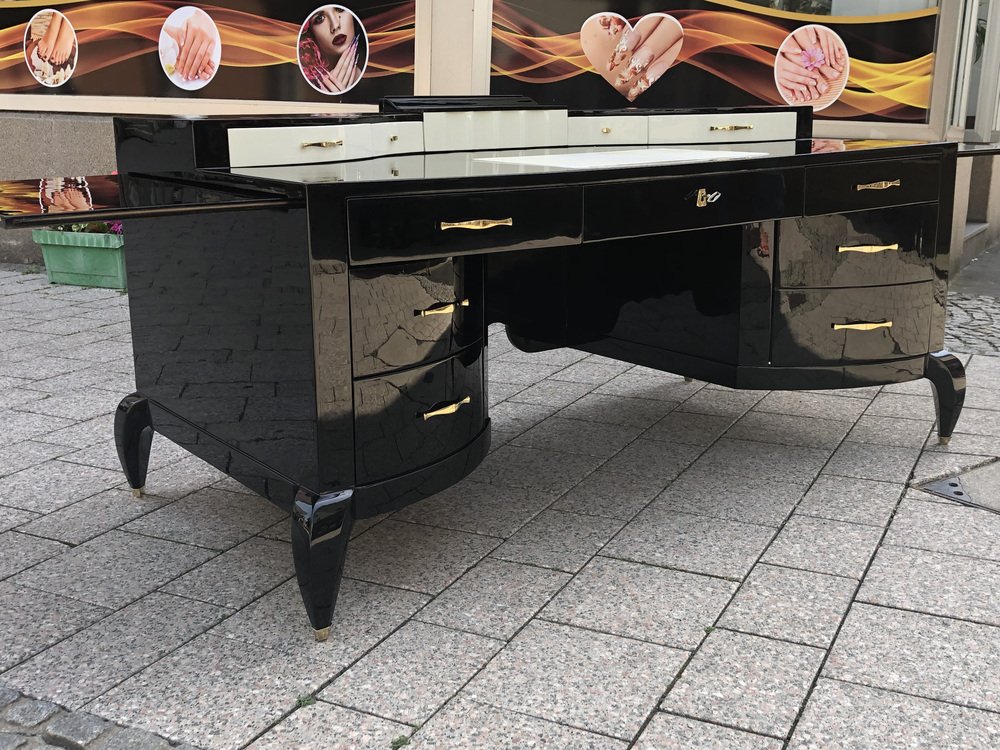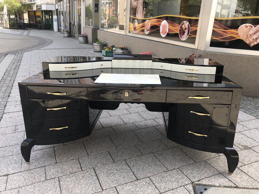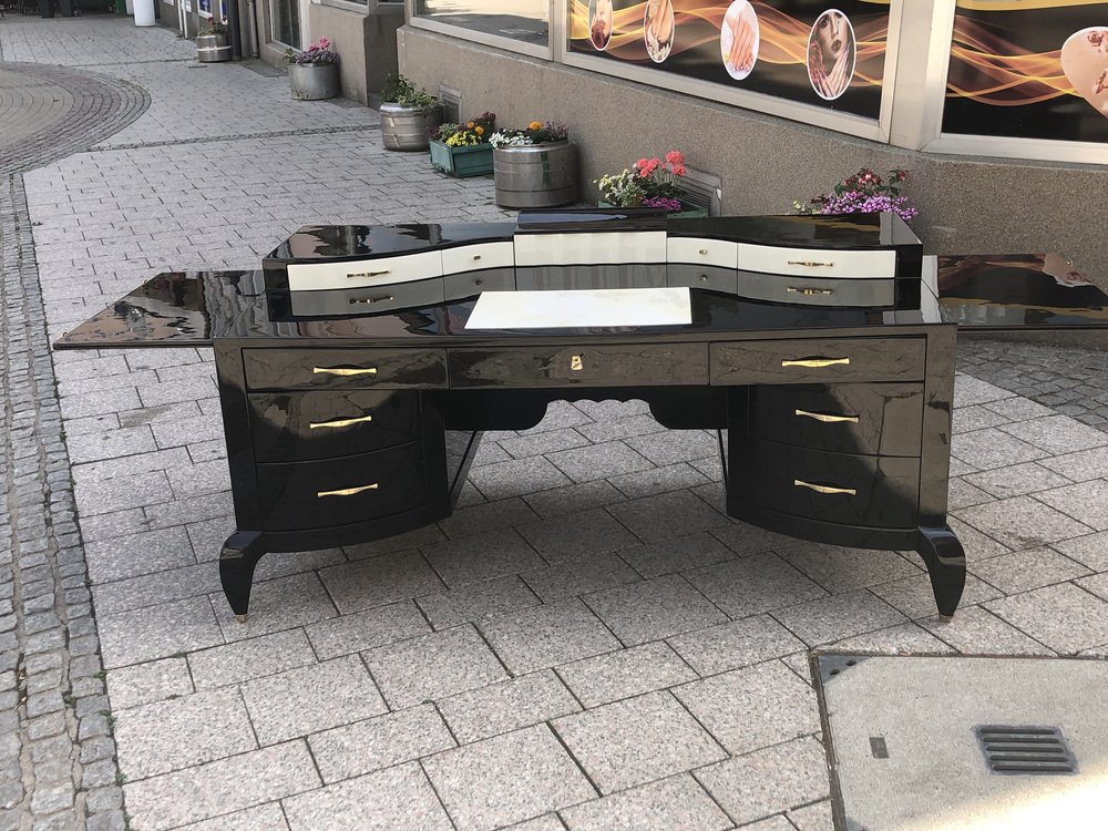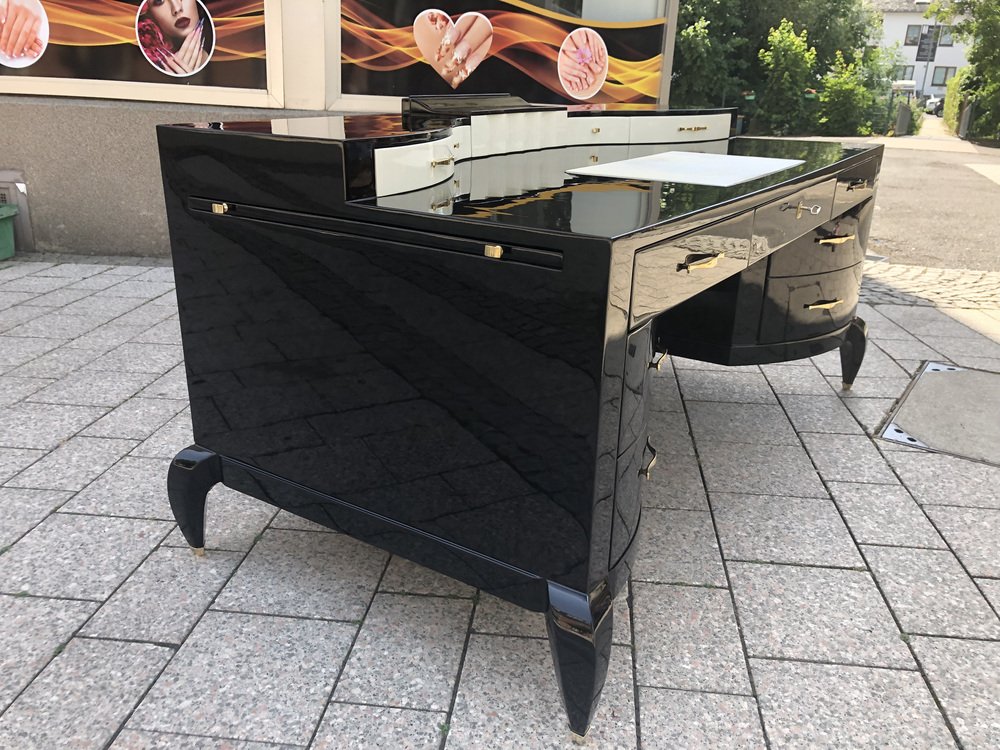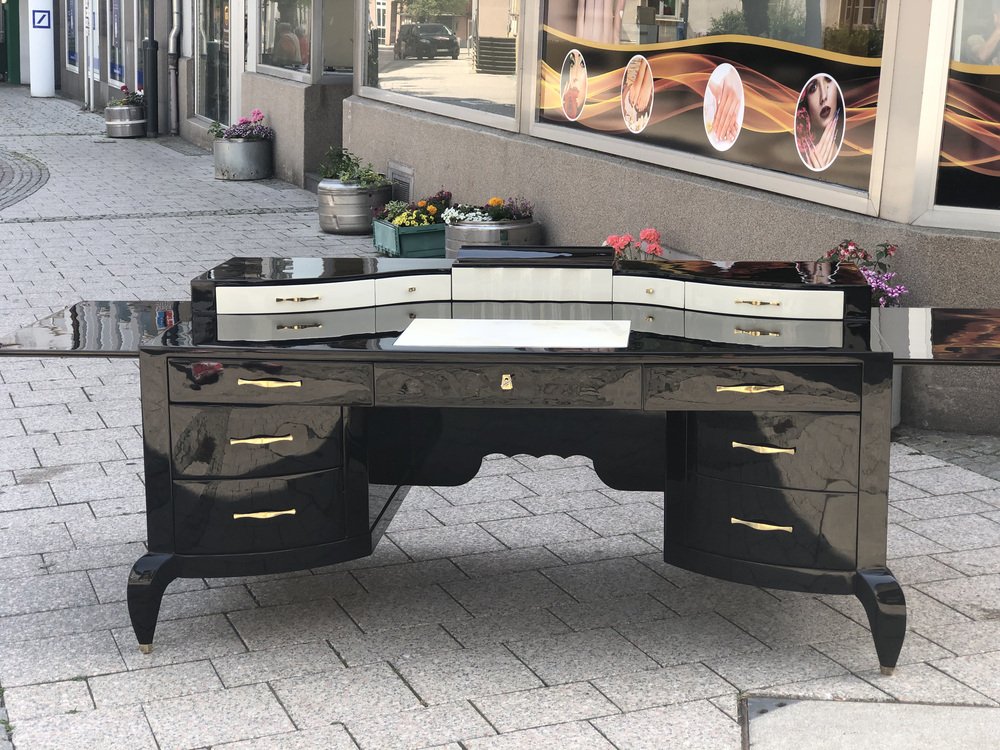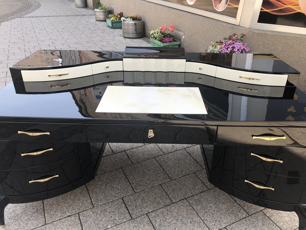 Großer Art Deco Schreibtisch aus lackiertem & schwarzem Pergamentleder von Assi D´asolo, Italien