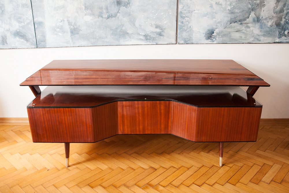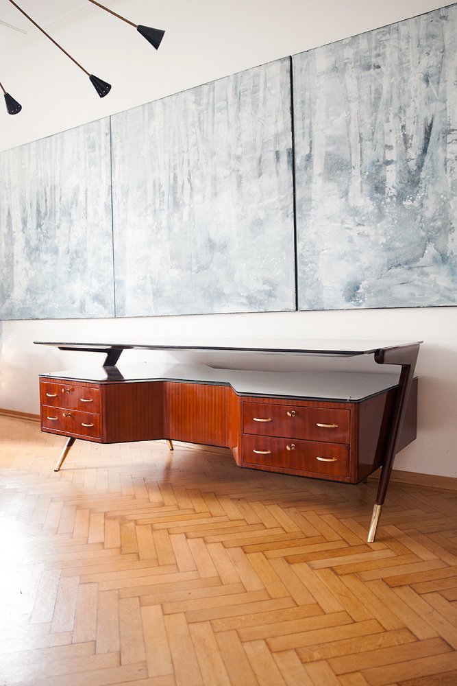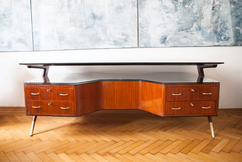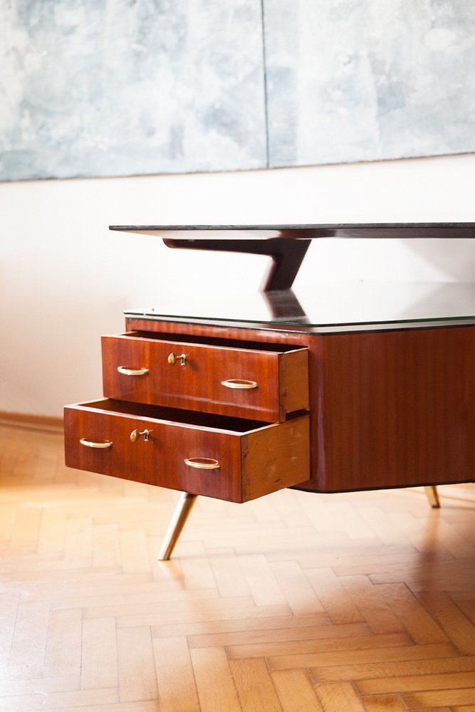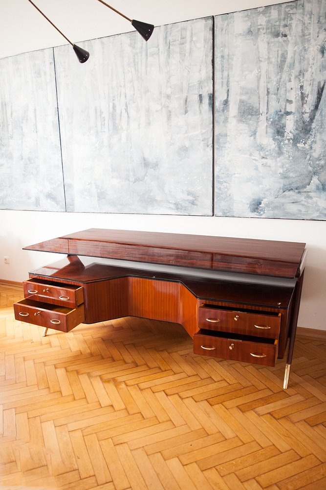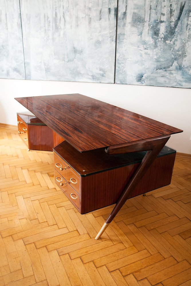 Seltener großer Schreibtisch, Designer Vittorio Dassi, Italien circa 1950. Der Schreibtisch stammt aus einer Privatvilla am Comer See. Santos Palisanderholz furniert, polierte Santos Palisanderholzplatte, Schreibtischkorpus mit umlaufende schwarze Schellackpolierte Kante, massive abgeschrägte organische Holzfüße, massive Messingfüße, vier Schubladen, jeweils vier Linsenkopfsschlüssel, Messingriffe, Glasplattenablage zwischen der Schreibtischplatte. Sehr guter top restaurierter Zustand. Keine Kratzer oder Dellen im Holz.