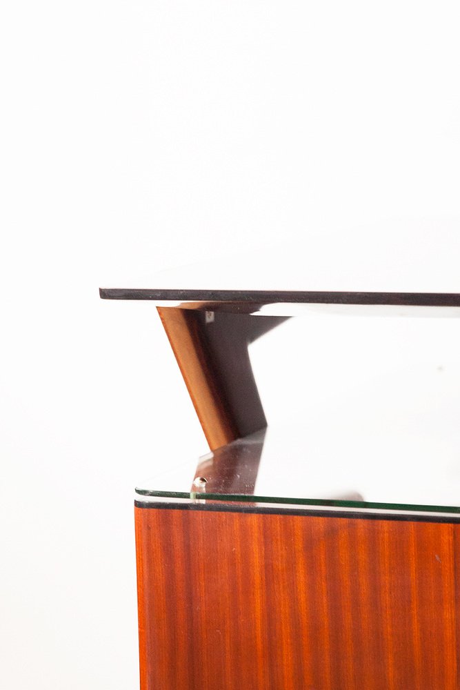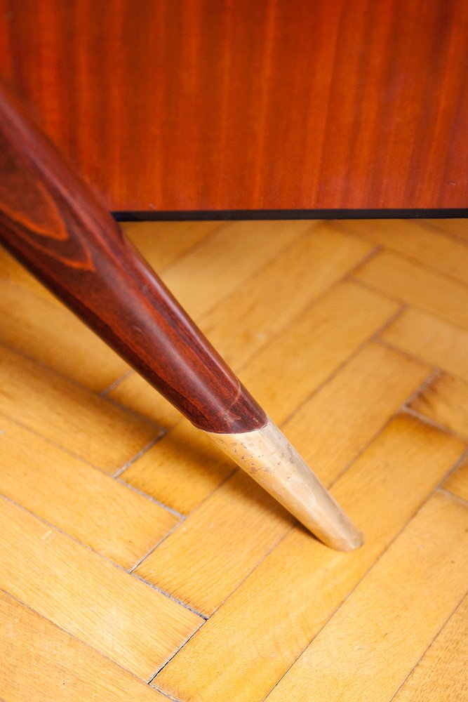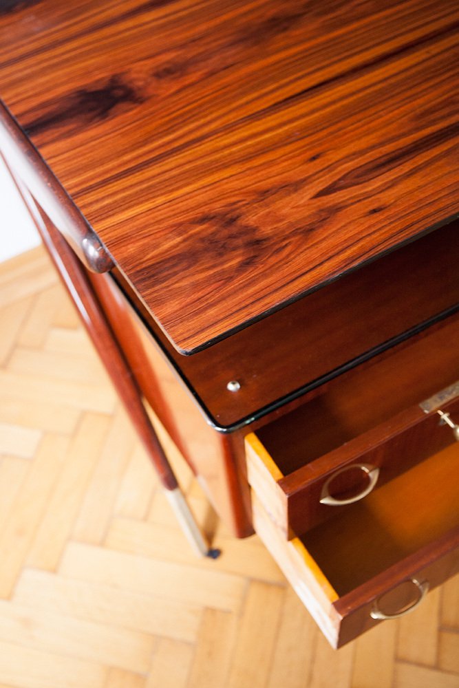 Rare large desk, designer Vittorio Dassi, Italy around 1950. The desk comes from a private villa on Lake Como. Santos rosewood veneered, polished Santos rosewood plate, desk body with all -round black shellac polished edge, massive beveled organic wooden feet, massive brass feet, four drawers, four lentil head keys, brass racks, glass panel shelf between the desk plate. Very good top restored condition.