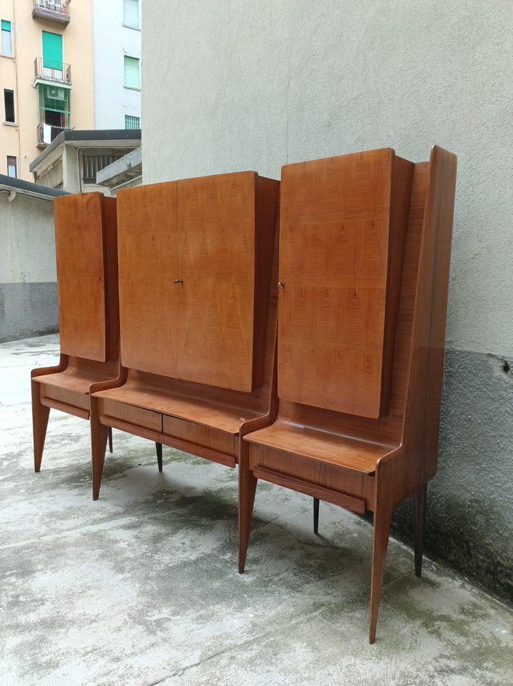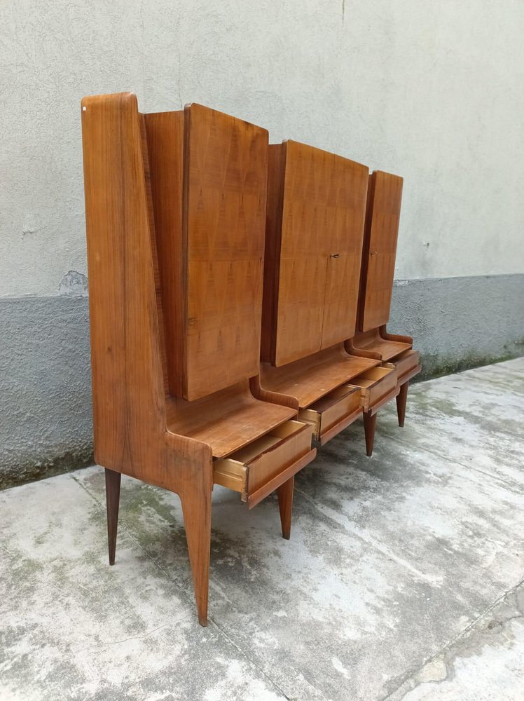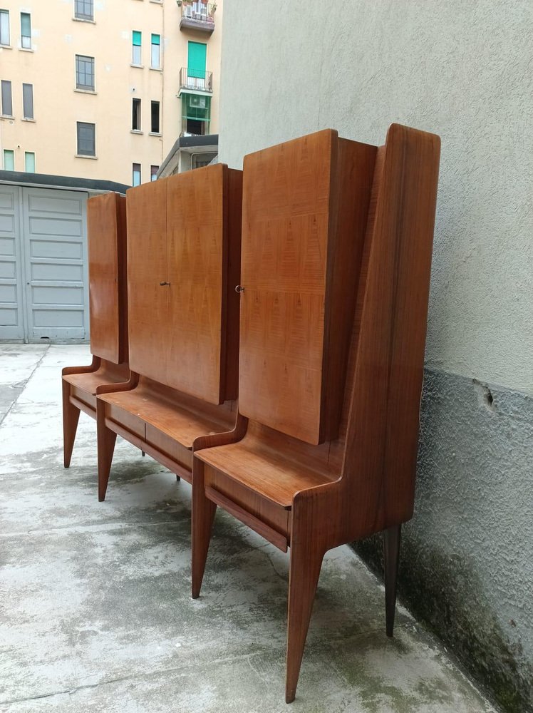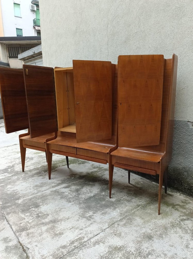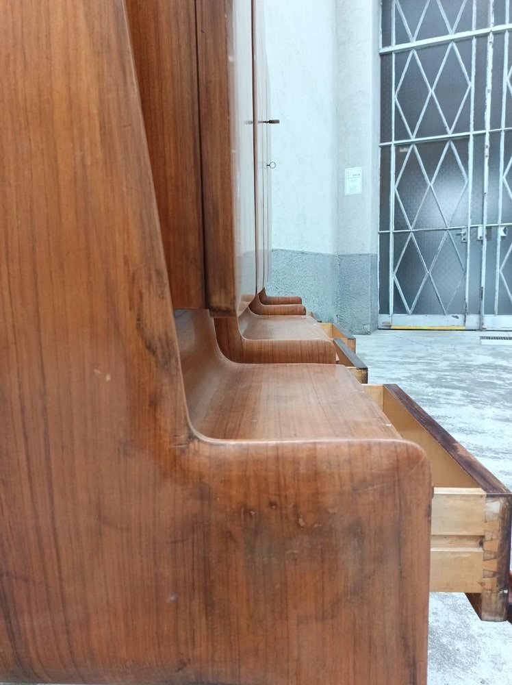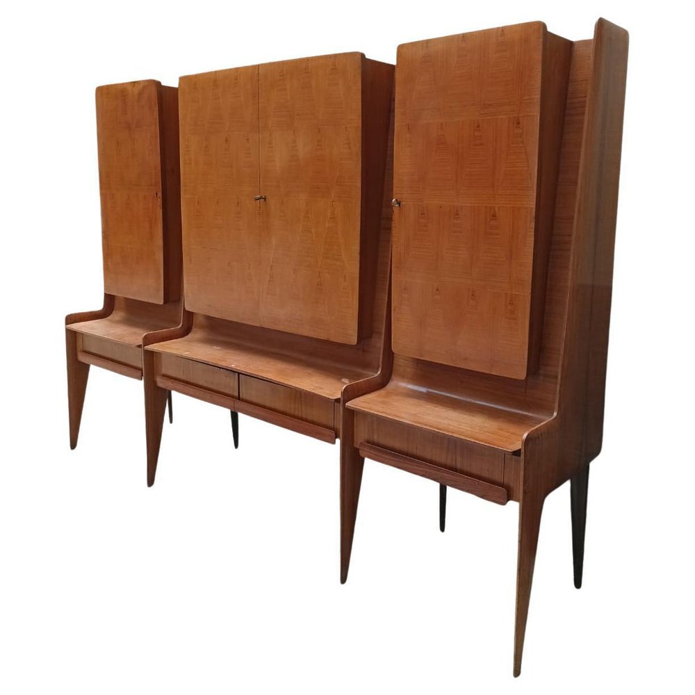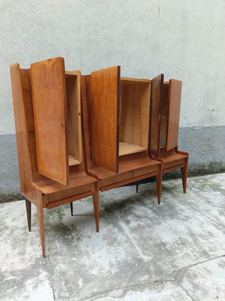 Bedeutende Schrankwand aus Cantù (Italien, ca. 1955), bestehend aus einer Bank mit Schubladenfronten und drei Schränken mit Türen aus Nussbaumholz mit geometrischem Muster. Das rechte Fach beherbergt eine Bar mit verspiegeltem Innenraum, Glasböden und einem funktionierenden Beleuchtungssystem (restauriert). Der Entwurf wird aufgrund seiner Proportionen, der sich verjüngenden Beine und der raffinierten Furniere dem Kreis von Paolo Buffa / Vittorio Dassi für die Schule La Permanente Mobili Cantù zugeschrieben. Das Stück wurde vor kurzem restauriert: Die Lackierung wurde überprüft, die Mechanismen wurden überholt und das Beleuchtungssystem in der Bar wurde auf den neuesten Stand gebracht. Das Möbelstück ist hochwertig verarbeitet und hat eine starke visuelle Wirkung. Es eignet sich ideal als Wohn-/Barschrank für Interieurs der Jahrhundertmitte und der Gegenwart. La Permanente Mobili Cantù ist ein historischer Zusammenschluss von Holz- und Möbelhandwerkern und Unternehmen, der Ende des 19. Jahrhunderts in Cantù gegründet wurde (die Wurzeln reichen bis ins Jahr 1893 zurück), um das lokale Qualitätshandwerk zu fördern und zu vermarkten. In den 1950er Jahren wurde sie zu einem Bezugspunkt für das italienische Design der Jahrhundertmitte, indem sie mit Designern und Architekten wie Paolo Buffa, Vittorio Dassi, Ico Parisi und anderen zusammenarbeitete und kulturelle Initiativen wie die Selettiva del Mobile (ab 1955) unterstützte, die dazu beitrug, die "Cantù-Möbel" auf die internationale Bühne zu bringen.