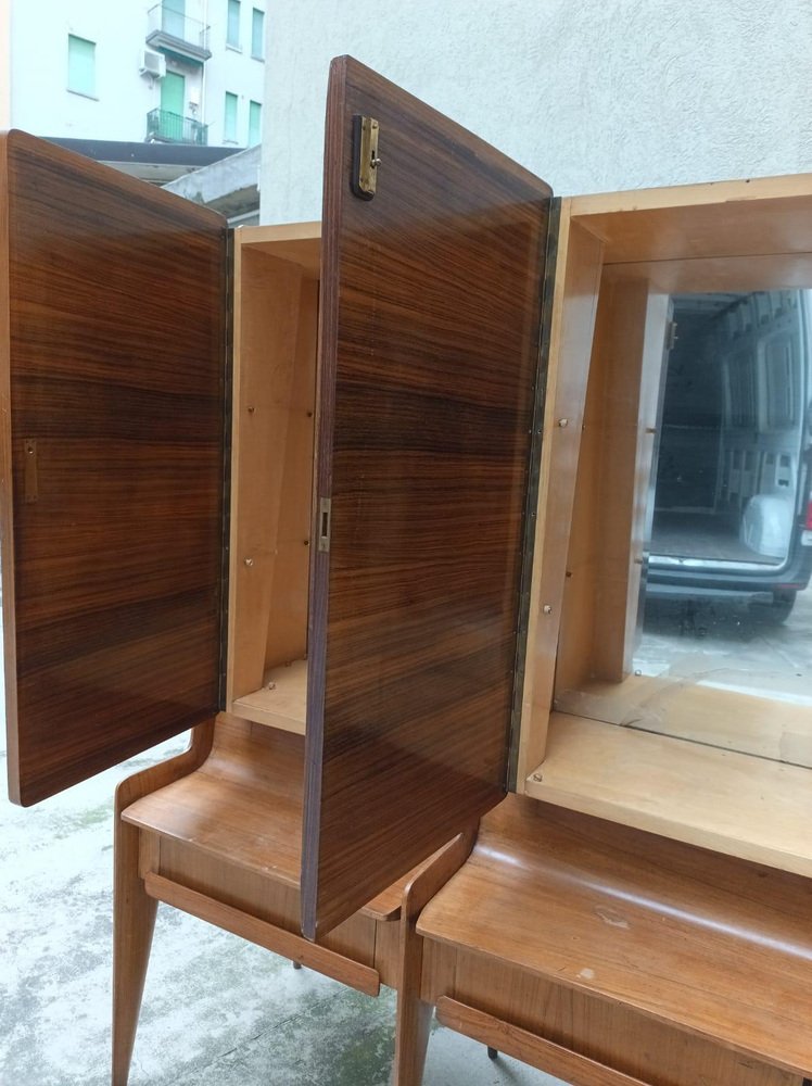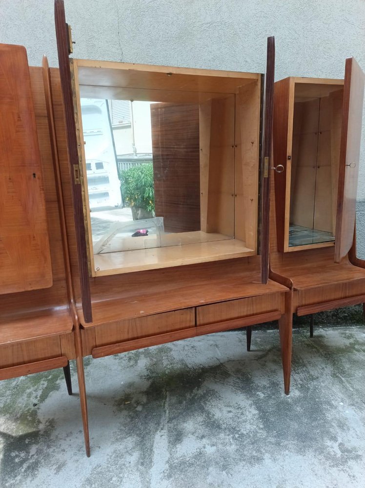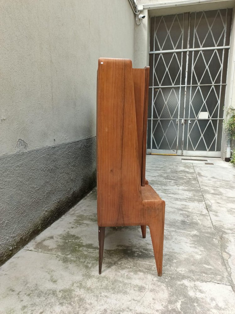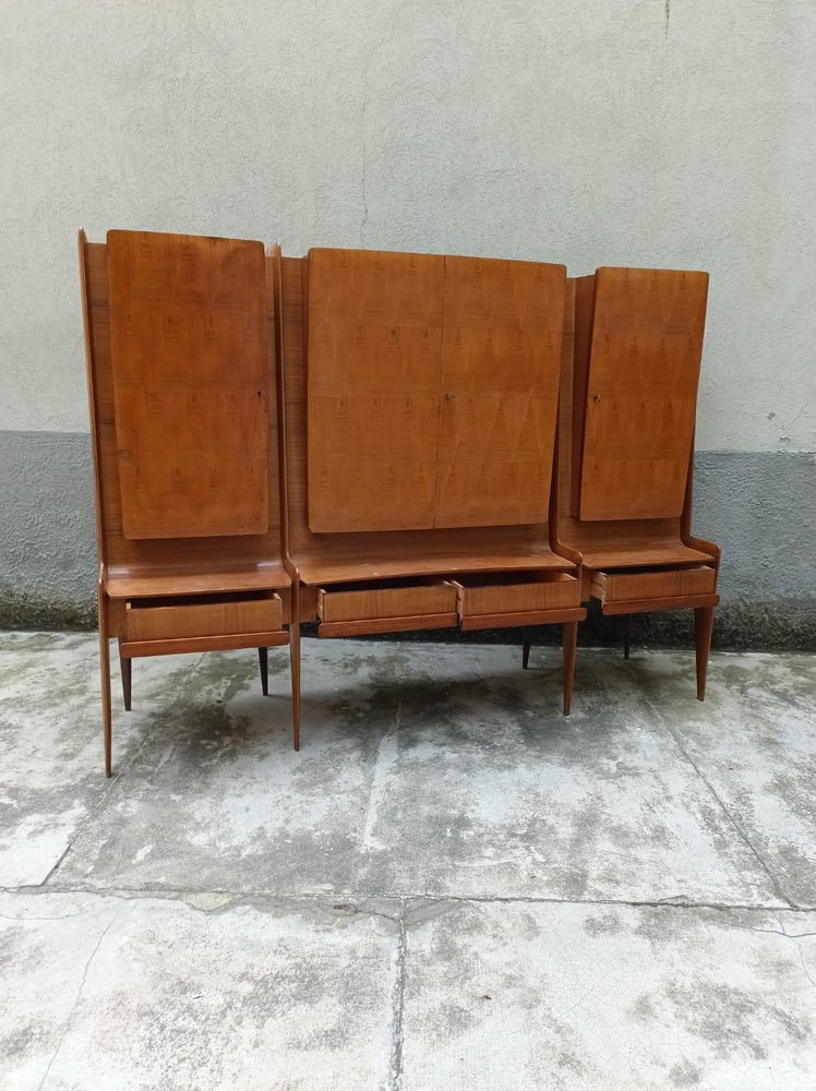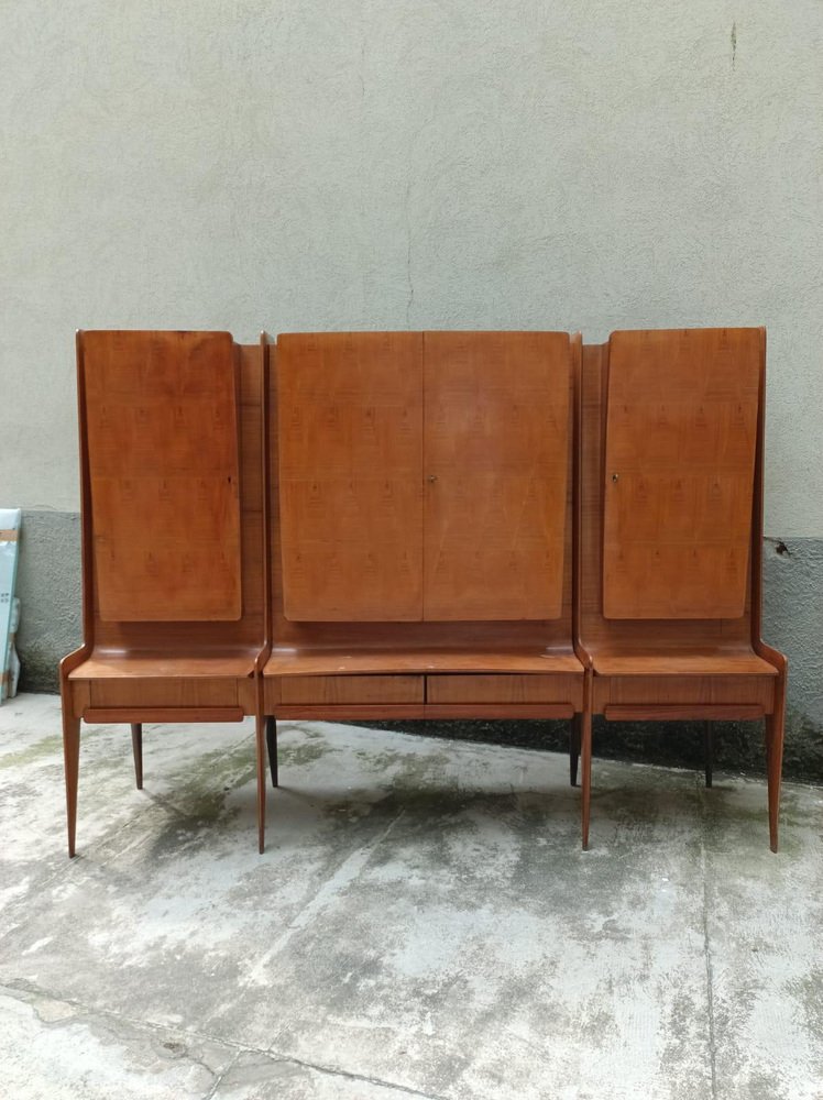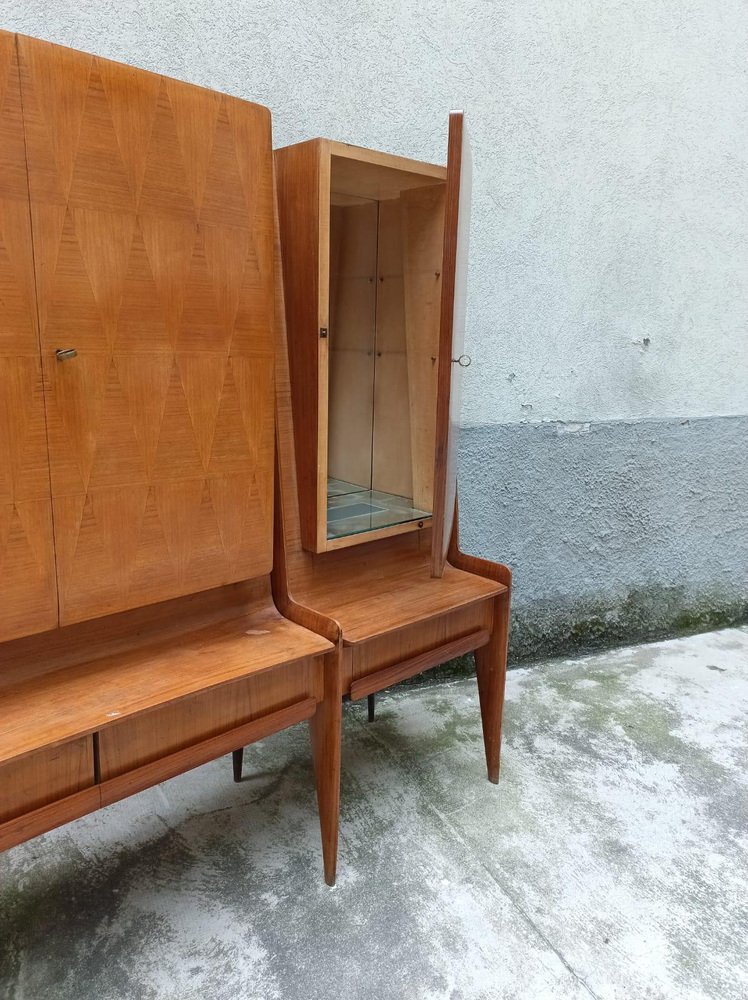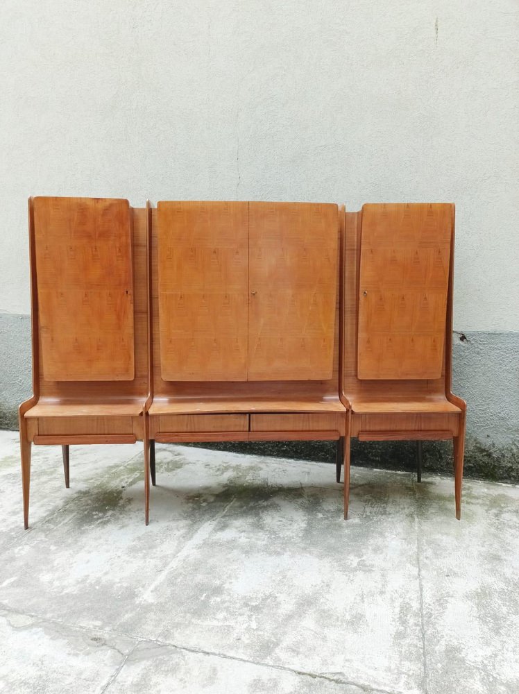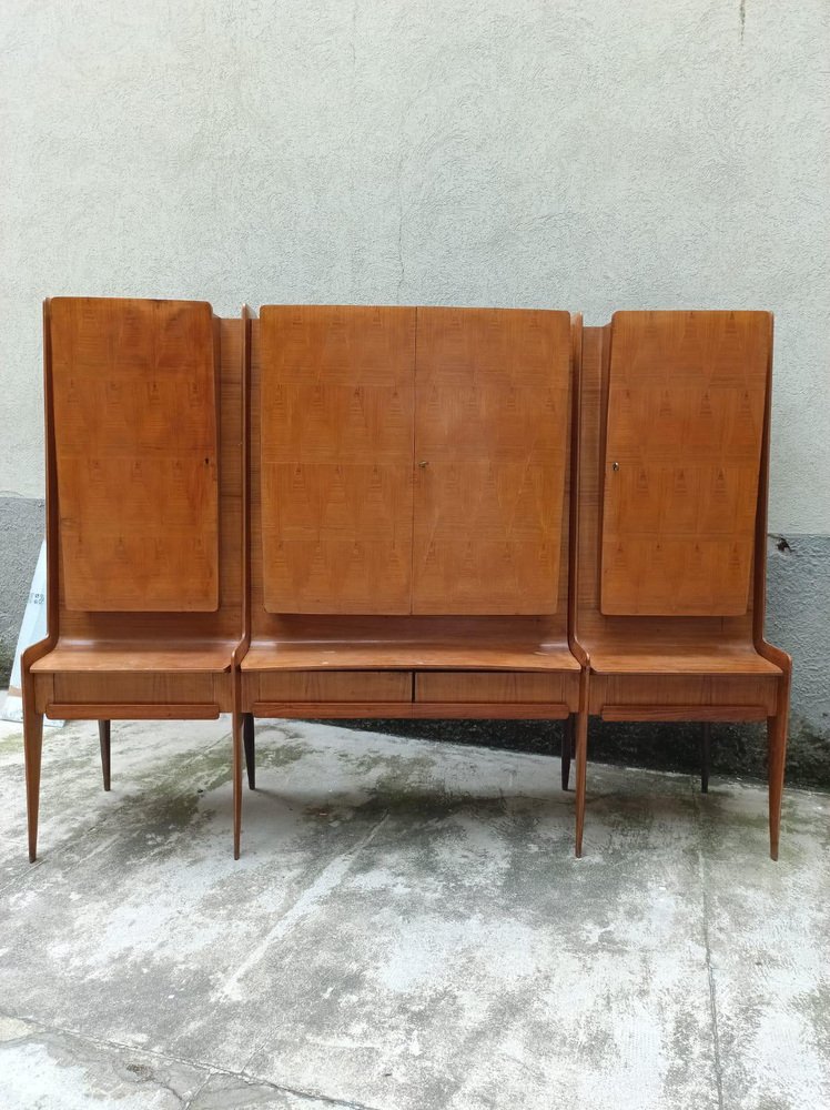 An important wall unit made in Cantù (Italy, ca. 1955), consisting of a bench with drawer fronts and three wall units with walnut doors with a geometric design. The right compartment houses a bar with a mirrored interior, glass shelves, and a functioning lighting system (restored). The design, due to its proportions, tapered legs, and refined veneers, is attributed to the circle of Paolo Buffa / Vittorio Dassi for the La Permanente Mobili Cantù school. The piece has been recently restored: the finish has been checked, the mechanisms have been overhauled, and the lighting system in the bar has been brought up to standard. A piece of high-quality workmanship and a strong visual impact, it is ideal as a living room/bar unit for mid-century and contemporary interiors. La Permanente Mobili Cantù is a historic consortium of woodworking and furniture craftsmen and companies founded in Cantù at the end of the 19th century (roots in 1893) to promote and market quality local craftsmanship. In the 1950s it became a point of reference for mid-century Italian design, collaborating with designers and architects such as Paolo Buffa, Vittorio Dassi, Ico Parisi and others, and supporting cultural initiatives such as the Selettiva del Mobile (from 1955), which helped to project “Cantù furniture” onto the international scene.