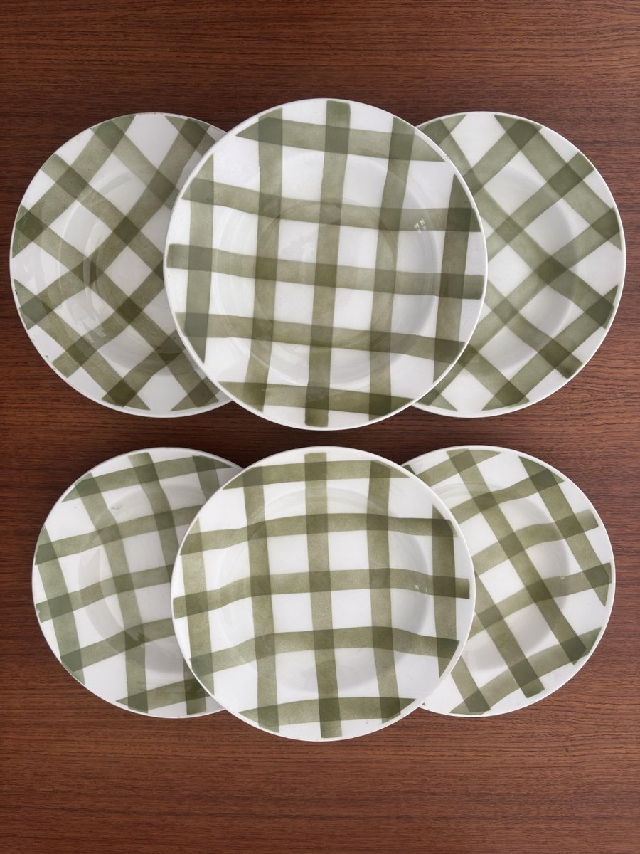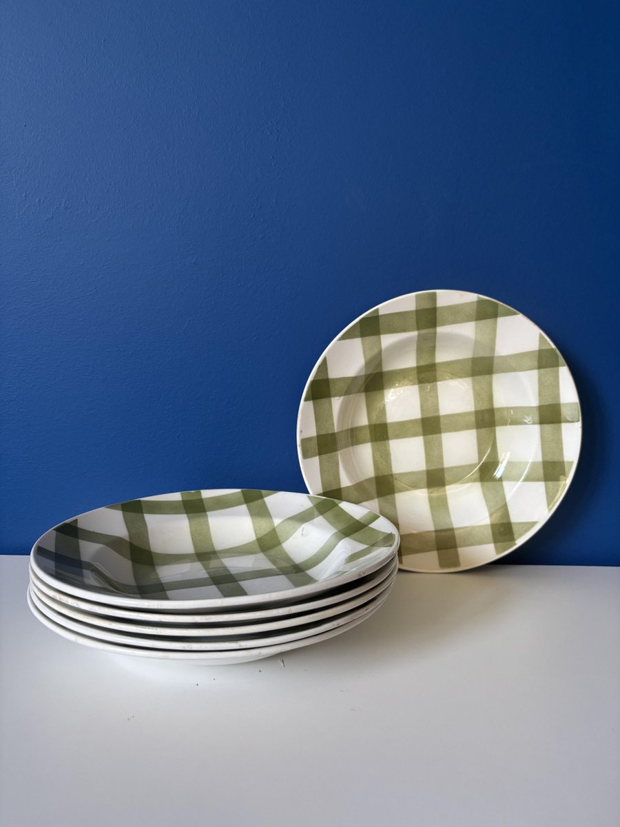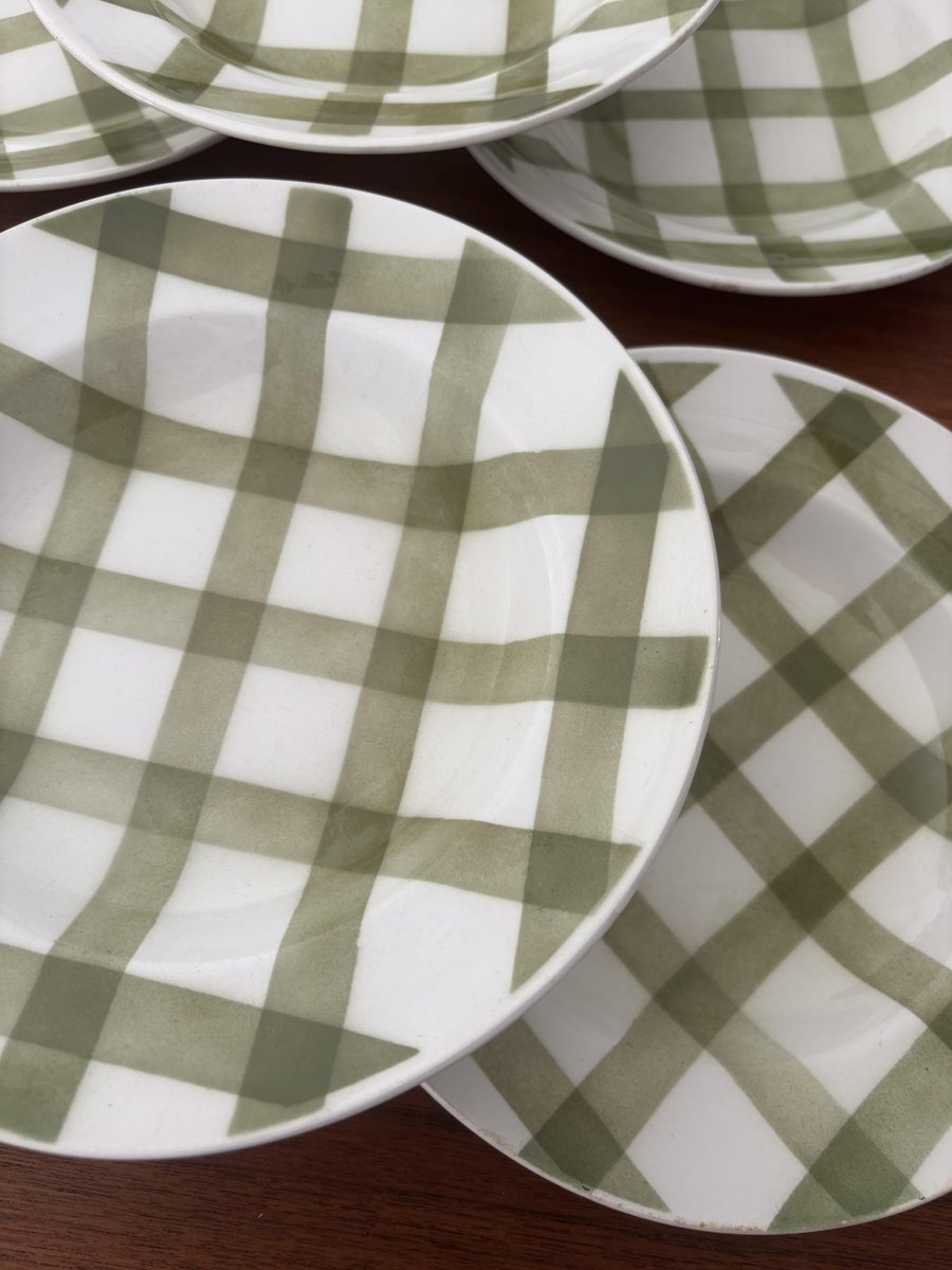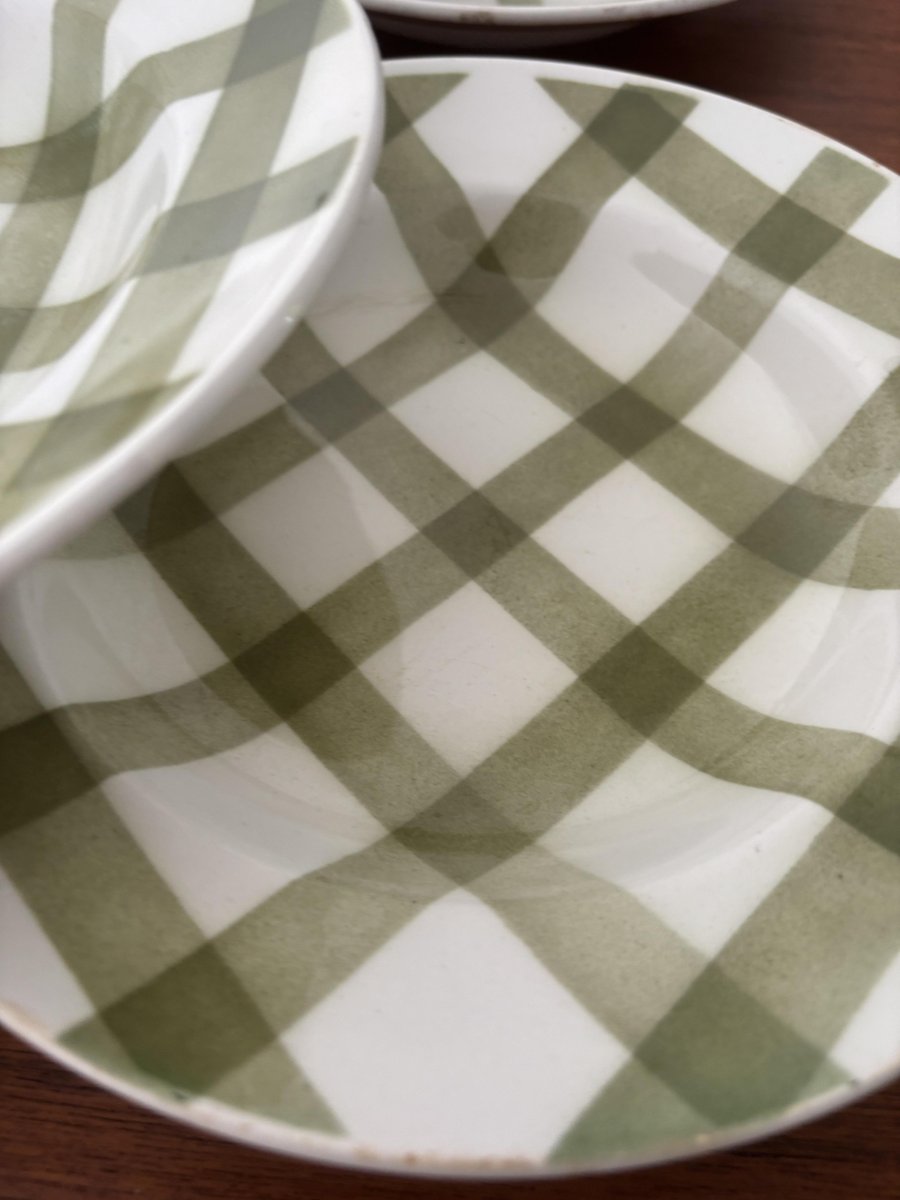 Set of vintage soup plates with a green and white tablecloth-style checkered pattern, made by the Moulin des Loups earthenware factory in France. These earthenware plates, full of retro charm, evoke the conviviality and elegance of tables of yesteryear.