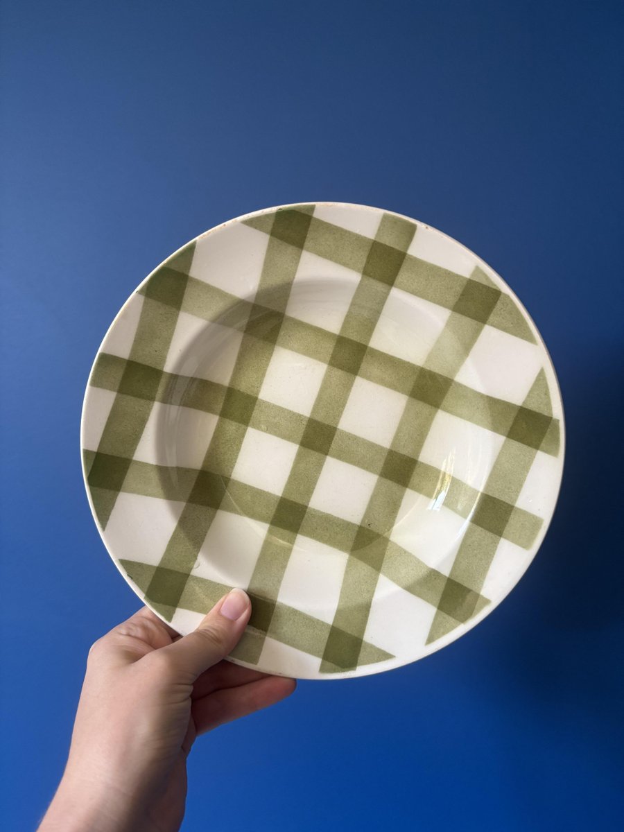 Vintage-Suppenteller mit grün-weißem Karomuster, hergestellt von der Steingutfabrik Moulin des Loups in Frankreich. Diese Steingutteller mit Retro-Charme erinnern an die Gemütlichkeit und Eleganz der Tische von früher.