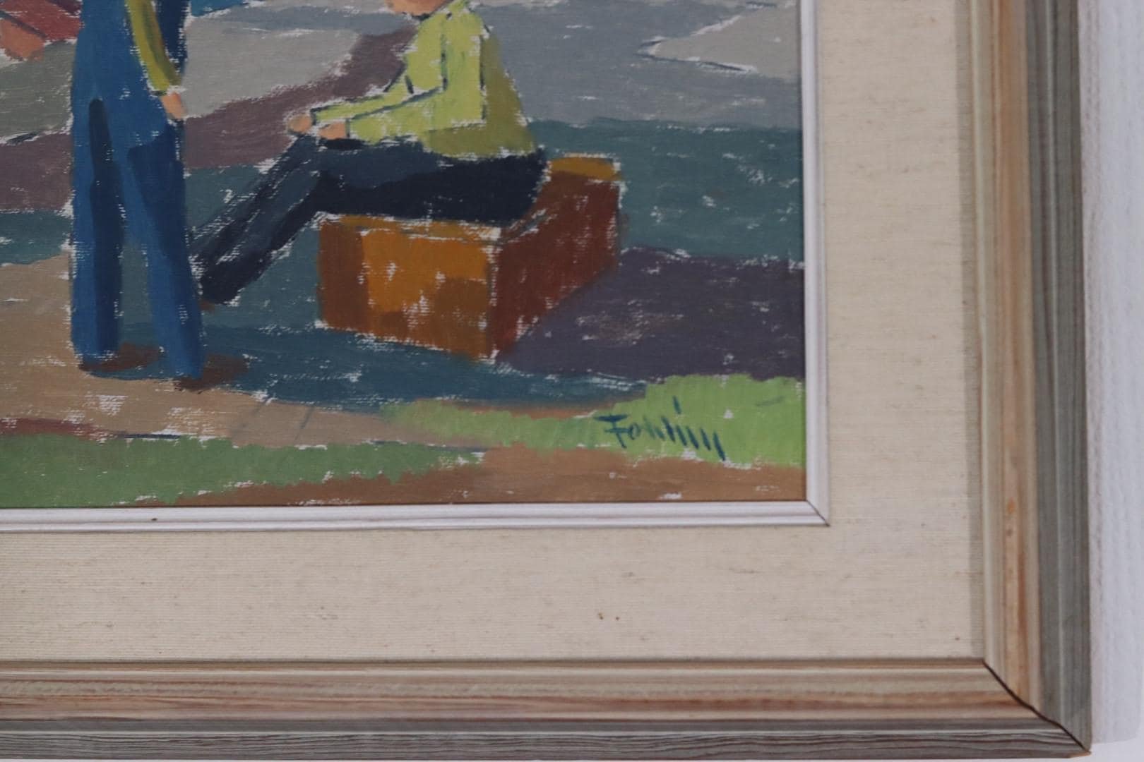 A charming mid-century oil painting on canvas by Gunnar Fohlin, titled Fishing Mode. The scene captures a quiet moment by the water, rendered with confident brushwork and a warm, natural palette. Signed by the artist and presented in its frame, the artwork is in good vintage condition with light, age-appropriate wear.