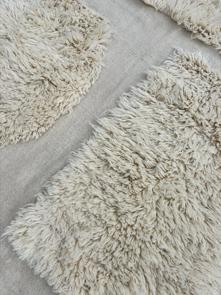 Bringen Sie einen Hauch von künstlerischem Minimalismus in Ihr Zuhause mit diesem handgefertigten marokkanischen Beni Ouarain-Teppich. Mit einer Größe von 190x300 cm kombiniert dieser einzigartige Teppich eine flach gewebte Basis mit geformten, plüschigen Wollteilen in verschiedenen Formen und Texturen. Die Elfenbeintöne und das innovative Design machen ihn zu einem subtilen, aber wirkungsvollen Stück, das traditionelle marokkanische Handwerkskunst mit moderner Ästhetik verbindet.