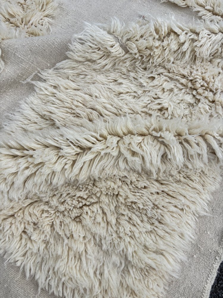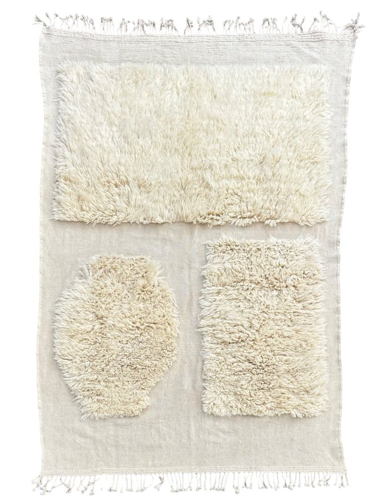Introduce a touch of artistic minimalism to your home with this handcrafted Moroccan Beni Ouarain rug. Measuring 190x300 cm, this unique rug combines a flatwoven base with sculpted, plush wool sections in varying shapes and textures. The ivory tones and innovative design make it a subtle yet impactful piece, blending traditional Moroccan craftsmanship with contemporary aesthetics.