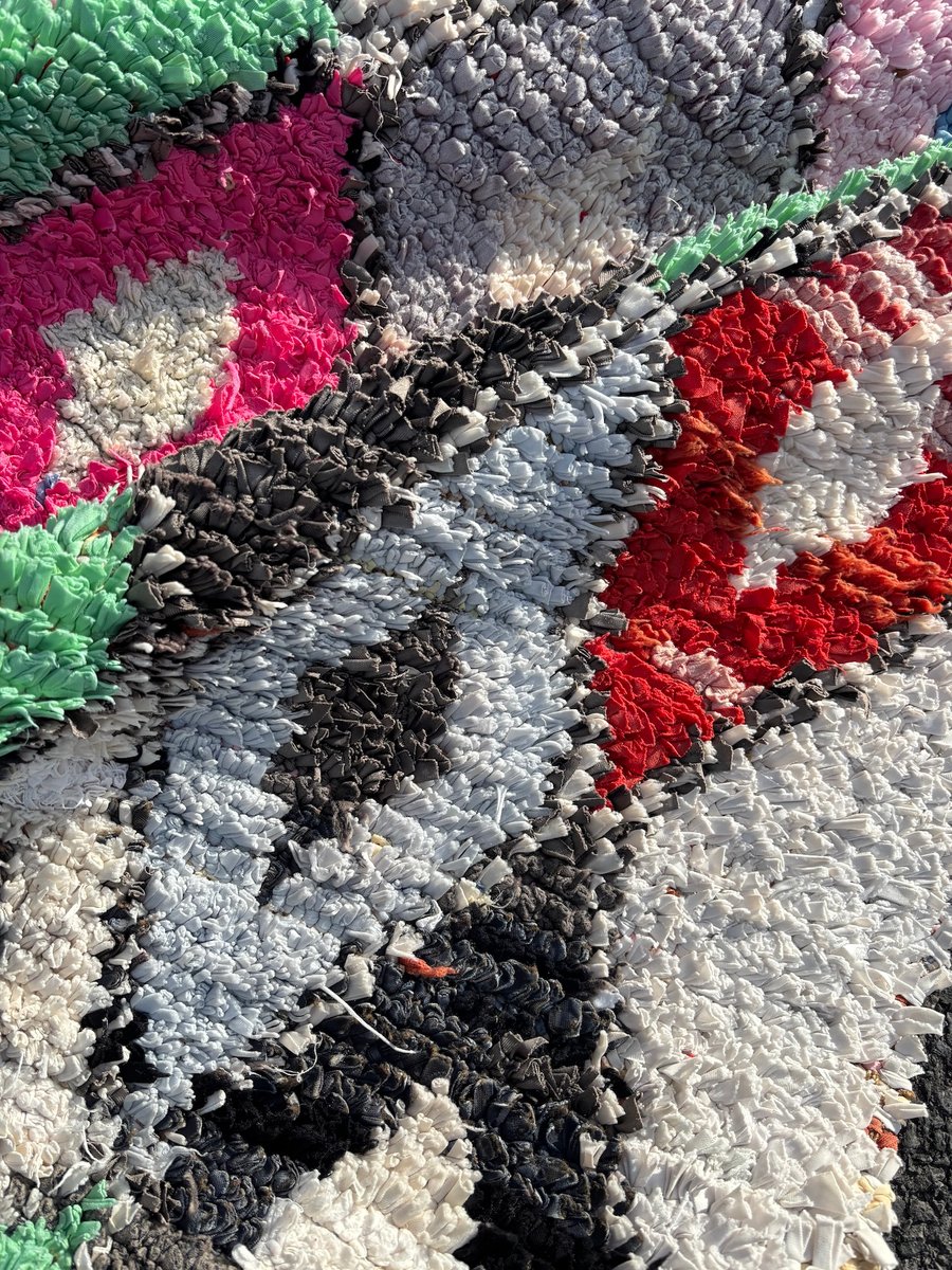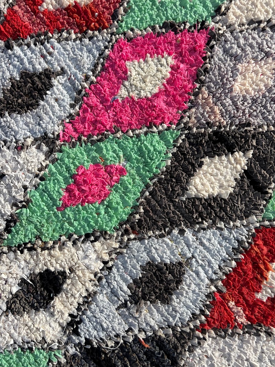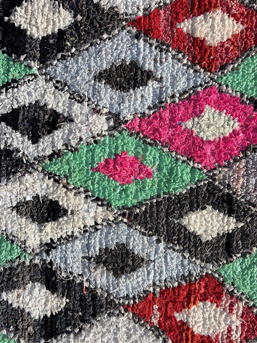 This authentic Moroccan Boucherouite rug is a one-of-a-kind vintage piece, handmade by Berber women in the Middle Atlas Mountains Crafted using a mix of recycled fabrics, this colorful boho rug reflects the creativity and sustainable craftsmanship of Moroccan rural communities